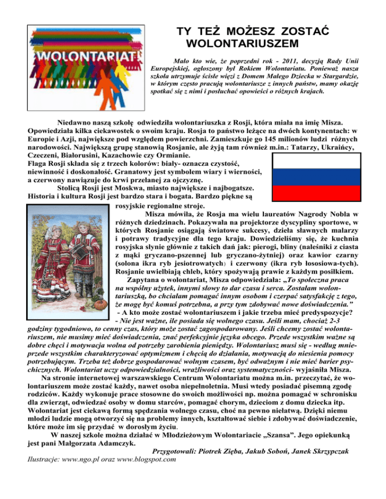 TY TEŻ MOŻESZ ZOSTAĆ WOLONTARIUSZEM Mało kto wie, że poprzedni rok - 2011, decyzją Rady Unii Europejskiej, ogłoszony był Rokiem Wolontariatu. Ponieważ nasza szkoła utrzymuje ścisłe więzi z Domem Małego Dziecka w Stargardzie, w którym często pracują wolontariusze z innych państw, mamy okazję spotkać się z nimi i posłuchać opowieści o różnych krajach. Niedawno naszą szkołę odwiedziła wolontariuszka z Rosji, która miała na imię Misza. Opowiedziała kilka ciekawostek o swoim kraju. Rosja to państwo leżące na dwóch kontynentach: w Europie i Azji, największe pod względem powierzchni. Zamieszkuje go 145 milionów ludzi różnych narodowości. Największą grupę stanowią Rosjanie, ale żyją tam również m.in.: Tatarzy, Ukraińcy, Czeczeni, Białorusini, Kazachowie czy Ormianie. Flaga Rosji składa się z trzech kolorów: biały- oznacza czystość, niewinność i doskonałość. Granatowy jest symbolem wiary i wierności, a czerwony nawiązuje do krwi przelanej za ojczyznę. Stolicą Rosji jest Moskwa, miasto największe i najbogatsze. Historia i kultura Rosji jest bardzo stara i bogata. Bardzo piękne są rosyjskie regionalne stroje. Misza mówiła, że Rosja ma wielu laureatów Nagrody Nobla w różnych dziedzinach. Pokazywała na projektorze dyscypliny sportowe, w których Rosjanie osiągają światowe sukcesy, dzieła sławnych malarzy i potrawy tradycyjne dla tego kraju. Dowiedzieliśmy się, że kuchnia rosyjska słynie głównie z takich dań jak: pierogi, bliny (naleśniki z ciasta z mąki gryczano-pszennej lub gryczano-żytniej) oraz kawior czarny (solona ikra ryb jesiotrowatych) i czerwony (ikra ryb łososiowa-tych). Rosjanie uwielbiają chleb, który spożywają prawie z każdym posiłkiem. Zapytana o wolontariat, Misza odpowiedziała: „To społeczna praca na wspólny użytek, innymi słowy to dar czasu i serca. Zostałam wolontariuszką, bo chciałam pomagać innym osobom i czerpać satysfakcję z tego, że mogę być komuś potrzebna, a przy tym zdobywać nowe doświadczenia.” - A kto może zostać wolontariuszem i jakie trzeba mieć predyspozycje? - Nie jest ważne, ile posiada się wolnego czasu. Jeśli mam, chociaż 2-3 godziny tygodniowo, to cenny czas, który może zostać zagospodarowany. Jeśli chcemy zostać wolontariuszem, nie musimy mieć doświadczenia, znać perfekcyjnie języka obcego. Przede wszystkim ważne są dobre chęci i motywacja wolna od potrzeby zarobienia pieniędzy. Wolontariusz musi się - według mnieprzede wszystkim charakteryzować optymizmem i chęcią do działania, motywacją do niesienia pomocy potrzebującym. Trzeba też dobrze gospodarować wolnym czasem, być odważnym i nie mieć barier psychicznych. Wolontariat uczy odpowiedzialności, wrażliwości oraz systematyczności- wyjaśniła Misza. Na stronie internetowej warszawskiego Centrum Wolontariatu można m.in. przeczytać, że wolontariuszem może zostać każdy, nawet osoba niepełnoletnia. Musi wtedy posiadać pisemną zgodę rodziców. Każdy wykonuje prace stosowne do swoich możliwości np. można pomagać w schronisku dla zwierząt, odwiedzać osoby w domu starców, pomagać chorym, dzieciom z domu dziecka itp. Wolontariat jest ciekawą formą spędzania wolnego czasu, choć na pewno niełatwą. Dzięki niemu młodzi ludzie mogą otworzyć się na problemy innych, kształtować siebie i zdobywać doświadczenie, które może im się przydać w dorosłym życiu. W naszej szkole można działać w Młodzieżowym Wolontariacie „Szansa”. Jego opiekunką jest pani Małgorzata Adamczyk. Przygotowali: Piotrek Zięba, Jakub Soboń, Janek Skrzypczak Ilustracje: www.ngo.pl oraz www.blogspot.com