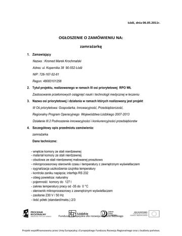 Łódź, dnia 06.05.2011r. OGŁOSZENIE O ZAMÓWIENIU NA: zamrażarkę 1. Zamawiający Nazwa : Kromed Marek Krochmalski Adres: ul. Kopernika 38 90-552 Łódź NIP: 726-167-52-61 Regon: 48083101258 2. Tytuł projektu, realizowanego w ramach III osi priorytetowej RPO WŁ Zastosowanie przełomowych osiągnięć nauki i technologii medycznej w leczeniu 3. Nazwa osi priorytetowej i działania w ramach których realizowany jest projekt III Oś priorytetowa: Gospodarka, Innowacyjność, Przedsiębiorczość, Regionalny Program Operacyjnego Województwa Łódzkiego 2007-2013 Działanie III.2 Podnoszenie innowacyjności i konkurencyjności przedsiębiorstw 4. Szczegółowy opis przedmiotu zamówienia: zamrażarka Dane techniczne: - wnętrze komory ze stali nierdzewnej - materiał komory ze stali nierdzewnej - obudowa ze stali nierdzewnej malowanej proszkowo - mikroprocesorowy sterownik czasu i temperatury z zewnętrznym wyświetlaczem - sygnalizacja uszkodzenia czujnika temperatury - kontrola zaniku napięcia; interfejs RS 232 - obieg powietrza: naturalny - pojemność komory do 127 l - zakres temperatury pracy od -35 do 0 °C - sterownik mikroprocesorowy z zewnętrznym wyświetlaczem - zasilanie 230 V / 50 Hz - ilość półek (standard/maks.) 2/3 Fundusze Europejskie dla rozwoju regionu łódzkiego Projekt współfinansowany przez Unię Europejską z Europejskiego Funduszu Rozwoju Regionalnego oraz z budżetu państwa. 5. Opis kryteriów, którymi Zamawiający będzie kierował się przy wyborze najkorzystniejszej oferty wraz z podaniem znaczenia kryteriów i sposobu oceny ofert oraz sposobu obliczania ceny. Rangi kryteriów: 1. cena = 80% 2. warunki gwarancyjne =10% 3. warunki serwisowe =10% przy czym: Ad. 1. Kryterium cena – obliczana jest wg wzoru: C = (Cmin /Cb ) x 100% gdzie: C - cena Cmin- cena najniższa Cb – cena badana a) Zamawiający przyjmie do oceny podaną przez Wykonawców cenę brutto w złotych. b) Zamawiający zastosuje zaokrąglenie wyników do dwóch miejsc po przecinku. c) 1% odpowiada 1 punktowi przyjętemu do oceny. Ad. 2. Kryterium warunki gwarancyjne obejmuje: minimum 2-letni okres gwarancyjny. Ad. 3. Kryterium warunki serwisowe obejmuje: serwis maksymalnie 5 dni od zgłoszenia. dokonywany na miejscu w ciągu Ocena spełnienia warunków 2. i 3. dokonana zostanie zgodnie z formułą „spełnia – nie spełnia” w oparciu o informacje zawarte w złożonej ofercie oraz dokumentach oferenta. 6. Termin wykonania zamówienia Termin wykonania zamówienia nie później niż do dnia 27.05.2011r. 7. Opis sposobu przygotowania ofert Oferta powinna być sporządzona w wersji papierowej. Oferta powinna zostać dostarczona do siedziby firmy w zamkniętej kopercie. Na kopercie powinna być umieszczona informacja „Dotyczy ogłoszenia o zamówieniu na…..” Oferta powinna być przygotowana w języku polskim. Cena urządzenia powinna zostać podana w PLN. Fundusze Europejskie dla rozwoju regionu łódzkiego Projekt współfinansowany przez Unię Europejską z Europejskiego Funduszu Rozwoju Regionalnego oraz z budżetu państwa. Oferent ponosi wszelkie koszty związane z przygotowaniem, złożeniem oferty i udziałem w postępowaniu. 8. Miejsce oraz termin składania i otwarcia ofert Miejsce składania ofert: siedziba firmy Kromed, : ul. Kopernika 38 90-552 Łódź Termin składania ofert do 16.05.2011r. do godz. 12:00 Termin otwarcia ofert 16.05.2011r. godz. 15:00 w siedzibie firmy Kromed. Oferty złożone po powyższym terminie nie będą rozpatrywane 9. Opis warunków udziału w postępowaniu oraz sposobu dokonywania oceny spełnienia tych warunków. O zamówienie mogą się ubiegać Wykonawcy, którzy: 1) posiadają niezbędną wiedzę i doświadczenie do wykonywania zamówienia, są producentem lub dystrybutorem urządzenia. Przedstawią w tym zakresie stosowne oświadczenie. 2) dysponują niezbędnym potencjałem technicznym do wykonywania zamówienia, 3) nie podlegają wykluczeniu z postępowania o udzielenie zamówienia (art. 24 ust.1 i 2 ustawy). Przedstawią w tym zakresie stosowne oświadczenie. 10. Projekt współfinansowany ze środków Europejskiego Funduszu Rozwoju Regionalnego oraz Budżetu Państwa. 11. Uwagi końcowe: 1) Osobą upoważnioną do kontaktowania się z Oferentami i udzielania informacji związanych ze składaniem ofert jest Pan Tadeusz Grzejszczak, nr tel. 0 502 339 172 e-mail: [email protected] 2) Zamawiający zastrzega sobie prawo do odwołania ogłoszenia o zamówieniu bez podania przyczyn na każdym jego etapie. Marek Krochmalski Fundusze Europejskie dla rozwoju regionu łódzkiego Projekt współfinansowany przez Unię Europejską z Europejskiego Funduszu Rozwoju Regionalnego oraz z budżetu państwa.