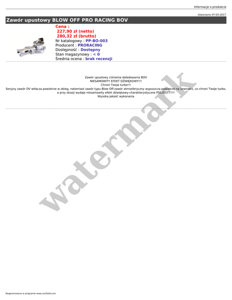 Informacje o produkcie Utworzono 07-03-2017 Zawór upustowy BLOW OFF PRO RACING BOV Cena : 227,90 zł (netto) 280,32 zł (brutto) Nr katalogowy : PP-BO-003 Producent : PRORACING Dostępność : Dostępny Stan magazynowy : < 0 Średnia ocena : brak recenzji w at er m ar k Zawór upustowy ciśnienia doładowania BOV NIESAMOWITY EFEKT DŹWIĘKOWY!!! Chroni Twoje turbo!!! Seryjny zawór DV wtłacza powietrze w obieg, natomiast zawór typu Blow Off-zawór atmosferyczny wypuszcza powietrze na zewnątrz, co chroni Twoje turbo, a przy okazji wydaje niesamowity efekt dźwiękowy-charakterystyczne PSSSSSTT!!!! Wysoka jakość wykonania Wygenerowano w programie www.oscGold.com