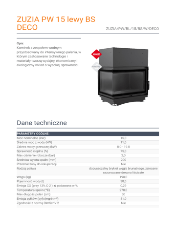 ZUZIA PW 15 lewy BS DECO ZUZIA/PW/BL/15/BS/W/DECO Opis: Kominek z zespołem wodnym przystosowany do intensywnego palenia, w którym zastosowane technologie i materiały tworzą wydajny, ekonomiczny i ekologiczny wkład o wysokiej sprawności. Dane techniczne PARAMETRY OGÓLNE: Moc nominalna (kW) Średnia moc z wody (kW) 15,0 11,0 Zakres mocy grzewczej (kW) 8.0 - 19.0 Sprawność cieplna (%) Max ciśnienie robocze (bar) Średnica wylotu spalin (mm) 75,0 2,0 200 Przeznaczony do rekuperacji Rodzaj paliwa Nie dopuszczalny brykiet węgla brunatnego, zalecane sezonowane drewno liściaste 190,0 Waga (kg) Pojemność wody (l) Emisja CO (przy 13% O 2 ) ≤ podawana w % 38,0 0,29 Temperatura spalin (℃) Max długość polan (cm) 278,0 50 Emisja pyłków (pył) (mg/Nm3) Zgodność z normą BlmSchV 2 51,0 Nie Rodzaj przeszklenia boczne Otwieranie drzwi Materiał wykonania w lewo żeliwo, stal Szerokość (cm) Wysokość (cm) 70,40 99,30 Głębokość (cm) Dolot powietrza Wyłożenie komory spalania 49,10 Nie Nie Popielnik Ozdobna szyba typu glass Tak Tak Wężownica Tak Zalety Instalując kominek z płaszczem wodnym nie musimy wykonywać odrębnej instalacji c.o., ponieważ możemy wykorzystać już istniejącą. MAKSYMALNE WYKORZYSTANIE ENERGII W kominku z płaszczem wodnym korpus paleniska posiada podwójne ścianki. Przestrzeń, pomiędzy nimi wypełnia woda, która odbiera ciepło i przekazuje je do instalacji grzewczej. Zwiększona powierzchnia wymiany ciepła we wkładzie następuje dzięki wbudowanym płomieniówkom i wysokiemu czopuchowi. Regulacja ciągu powietrza odbywa się za pomocą wbudowanego szybra. Ręczna kontrola nad procesem spalania powietrza pobieranego z pomieszczenia poprzez popielnik. BEZPIECZEŃSTWO NA NAJWYŻSZYM POZIOMIE Front wkładu wyposażony w ceramikę żaroodporną wytrzymująca temperaturę do 800°C. Oferowane przez nas szkło posiada certy kat jakości i bezpieczeństwa. Zamontowana we wkładzie wężownica, służy do zabezpieczenia kominka przed przegrzaniem (króciec wejścia/ wyjścia 1⁄2”). Korpus i front wkładu odporne na działanie wysokich temperatur dzięki zastosowaniu wysokogatunkowej stali. Doskonała szczelność, dzięki solidnym spawom wykonanym w osłonie gazu szlachetnego. Elementy stalowe wycinane laserowo przy pomocy nowoczesnych urządzeń, a następnie wyginane na giętarkach CNC. KOMFORT UŻYTKOWANIA Wyjmowany ruszt i popielnik ułatwiają utrzymanie wkładu w czystości. Kurtyna powietrzna oddziela szybę od paleniska. Dzięki temu szyba nie brudzi się i oddaje do pomieszczenia więcej ciepła. Ograniczone osadzanie sadzy dzięki systemowi czystej szyby (kierownica powietrza). Możliwość zniwelowania nierówności podłoża i wypoziomowania wkładu dzięki regulowanym nóżkom. NOWOCZESNY DESIGN Zabudowany wkład z zespołem wodnym nie różni się wyglądem od typowego wkładu powietrznego. Poszerza jedynie zalety tego ostatniego o możliwość podłączenia kominka do systemu c.o. Wkład wyposażony jest w ozdobną, pojedynczą szybę typu glass, dzięki której wygląda elegancko i nowocześnie. Dodatkowo zastosowanie tego rozwiązania optycznie powiększa front wkładu. Dekoracyjne szyby typu glass zestawione są ze sobą pod kątem prostym (szyby łączone bez szprosa). Wkład jest wyposażony w elegancką i wygodną klamkę. Gwarancja 5 lat. Rysunek techniczny Gwarancja Wszystkie produkty dostępne na www.kratki.com są fabrycznie nowe, wolne od wad zycznych i prawnych oraz zostały legalnie wprowadzone na rynek polski. Producent udziela 5 lat gwarancji od momentu zakupu wkładu na jego sprawne działanie. Ruszt i uszczelnienia kominka objęte są gwarancją na okres 1 roku od momentu zakupu wkładu. Gwarancją nie jest objęta: ceramika żaroodporna. Zastosowanie wkładu kominkowego, sposób podłączenia do komina oraz warunki eksploatacji muszą być zgodne z instrukcją obsługi. Zwrot Klient będący Konsumentem, który zawarł Umowę sprzedaży, może w terminie 14 dni odstąpić od niej bez podawania przyczyny. Bieg terminu na odstąpienie od Umowy sprzedaży rozpoczyna się od chwili objęcia Towaru w posiadanie przez Klienta lub wskazaną przez niego osobę trzecią inną niż przewoźnik. Oświadczenie można złożyć na formularzu, którego wzór został zamieszczony przez Sprzedawcę na Stronie Internetowej Sklepu pod adresem: formularz odstąpienia. Kratki.pl Marek Bal ul. W. Gombrowicza 4 26-660 Wsola/Jedlińsk www.kratki.com tel. 48 340 10 00 Data publikacji: 23.02.2017