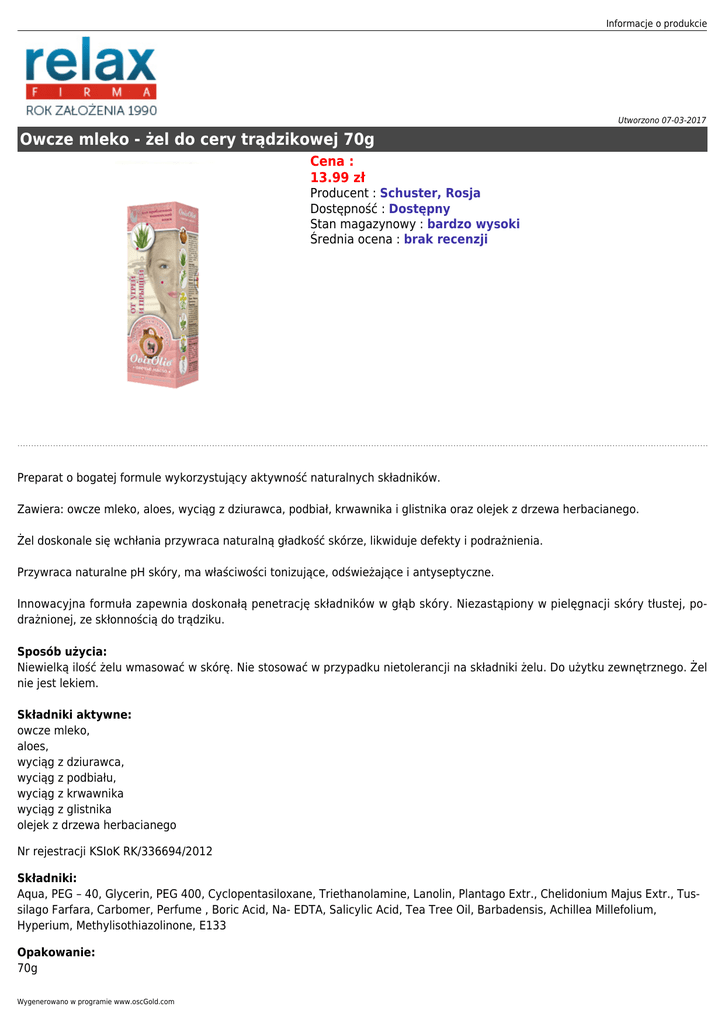 Informacje o produkcie Utworzono 07-03-2017 Owcze mleko - żel do cery trądzikowej 70g Cena : 13.99 zł Producent : Schuster, Rosja Dostępność : Dostępny Stan magazynowy : bardzo wysoki Średnia ocena : brak recenzji Preparat o bogatej formule wykorzystujący aktywność naturalnych składników. Zawiera: owcze mleko, aloes, wyciąg z dziurawca, podbiał, krwawnika i glistnika oraz olejek z drzewa herbacianego. Żel doskonale się wchłania przywraca naturalną gładkość skórze, likwiduje defekty i podrażnienia. Przywraca naturalne pH skóry, ma właściwości tonizujące, odświeżające i antyseptyczne. Innowacyjna formuła zapewnia doskonałą penetrację składników w głąb skóry. Niezastąpiony w pielęgnacji skóry tłustej, podrażnionej, ze skłonnością do trądziku. Sposób użycia: Niewielką ilość żelu wmasować w skórę. Nie stosować w przypadku nietolerancji na składniki żelu. Do użytku zewnętrznego. Żel nie jest lekiem. Składniki aktywne: owcze mleko, aloes, wyciąg z dziurawca, wyciąg z podbiału, wyciąg z krwawnika wyciąg z glistnika olejek z drzewa herbacianego Nr rejestracji KSIoK RK/336694/2012 Składniki: Aqua, PEG – 40, Glycerin, PEG 400, Cyclopentasiloxane, Triethanolamine, Lanolin, Plantago Extr., Chelidonium Majus Extr., Tussilago Farfara, Carbomer, Perfume , Boric Acid, Na- EDTA, Salicylic Acid, Tea Tree Oil, Barbadensis, Achillea Millefolium, Hyperium, Methylisothiazolinone, E133 Opakowanie: 70g Wygenerowano w programie www.oscGold.com