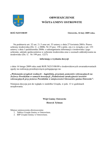 OBWIESZCZENIE WÓJTA GMINY OSTROWITE ROŚ.7625/5/08/09 Ostrowite, 16 luty 2009 roku. Na podstawie art. 32 ust. 2 i 3 oraz art. 53 ustawy z dnia 27 kwietnia 2001r. Prawo ochrony środowiska (Dz. U. z 2008r. Nr 25 poz. 150 z późn. zm.) w związku z art. 153 ustawy z dnia 3 października 2008r. o udostępnianiu informacji o środowisku i jego ochronie, udziale społeczeństwa w ochronie środowiska oraz o ocenach oddziaływania na środowisko (Dz. U. Nr 199 poz. 1227) informuję o wydaniu decyzji z dnia 16 lutego 2009 roku znak ROŚ.7625/5/08/09 o środowiskowych uwarunkowaniach zgody na realizację przedsięwzięcia polegającego na: „Wykonaniu urządzeń wodnych – kąpieliska, przystani, pomostów rekreacyjnych na Jeziorze Powidzkim w ramach inwestycji „Podniesienie atrakcyjności terenów rekreacyjnych przy jeziorze Powidzkim w miejscowości Giewartów gmina Ostrowite”. Niniejsza decyzja jest do wglądu w siedzibie Urzędu, w pok. 13 w godzinach urzędowania. Wójt Gminy Ostrowite Henryk Tylman Miejsce umieszczenia obwieszczenia: 1. Tablica Urzędu Gminy w Ostrowitem. 2. BIP Urzędu Gminy w Ostrowitem.