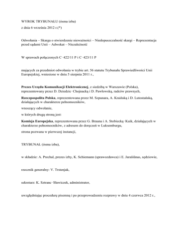 WYROK TRYBUNAŁU (ósma izba) z dnia 6 września 2012 r.(*) Odwołania – Skarga o stwierdzenie nieważności – Niedopuszczalność skargi – Reprezentacja przed sądami Unii – Adwokat – Niezależność W sprawach połączonych C‑422/11 P i C‑423/11 P mających za przedmiot odwołania w trybie art. 56 statutu Trybunału Sprawiedliwości Unii Europejskiej, wniesione w dniu 5 sierpnia 2011 r., Prezes Urzędu Komunikacji Elektronicznej, z siedzibą w Warszawie (Polska), reprezentowany przez D. Dziedzic‑Chojnacką i D. Pawłowską, radców prawnych, Rzeczpospolita Polska, reprezentowana przez M. Szpunara, A. Kraińską i D. Lutostańską, działających w charakterze pełnomocników, wnoszący odwołanie, w których drugą stroną jest: Komisja Europejska, reprezentowana przez G. Brauna i A. Stobiecką‑Kuik, działających w charakterze pełnomocników, z adresem do doręczeń w Luksemburgu, strona pozwana w pierwszej instancji, TRYBUNAŁ (ósma izba), w składzie: A. Prechal, prezes izby, K. Schiemann (sprawozdawca) i E. Jarašiūnas, sędziowie, rzecznik generalny: V. Trstenjak, sekretarz: K. Sztranc‑Sławiczek, administrator, uwzględniając procedurę pisemną i po przeprowadzeniu rozprawy w dniu 4 czerwca 2012 r., podjąwszy, po wysłuchaniu rzecznika generalnego, decyzję o rozstrzygnięciu sprawy bez opinii, wydaje następujący Wyrok 1 Prezes Urzędu Komunikacji Elektronicznej (zwany dalej „Prezesem UKE”) i Rzeczpospolita Polska żądają w odwołaniach uchylenia postanowienia Sądu Unii Europejskiej z dnia 23 maja 2011 r. w sprawie T‑226/10 Prezes Urzędu Komunikacji Elektronicznej przeciwko Komisji, Zb.Orz. s. II‑2467 (zwanego dalej „zaskarżonym postanowieniem”), w którym Sąd odrzucił jako niedopuszczalną wniesioną przez Prezesa UKE skargę o stwierdzenie nieważności decyzji Komisji C(2010) 1234 z dnia 3 marca 2010 r. wydanej na podstawie art. 7 ust. 4 dyrektywy 2002/21/WE Parlamentu Europejskiego i Rady z dnia 7 marca 2002 r. w sprawie wspólnych ram regulacyjnych sieci i usług łączności elektronicznej (dyrektywy ramowej) (Dz.U. L 108, s. 33). Ramy prawne Prawo Unii 2 Zgodnie z brzmieniem art. 19 akapity pierwszy, trzeci i czwarty statutu Trybunału Sprawiedliwości Unii Europejskiej, mającego, zgodnie z art. 53 tego statutu, zastosowanie do Sądu: „Państwa członkowskie i instytucje Unii reprezentuje przed Trybunałem Sprawiedliwości pełnomocnik, ustanawiany dla każdej sprawy; pełnomocnika może wspomagać doradca albo adwokat lub radca prawny. [...] [...] Inne strony muszą być reprezentowane przez adwokatów lub radców prawnych. Jedynie adwokat lub radca prawny uprawniony do występowania przed sądem państwa członkowskiego lub innego państwa, które jest stroną Porozumienia o Europejskim Obszarze Gospodarczym, może reprezentować lub wspomagać stronę przed Trybunałem”. 3 Polska wersja art. 19 tego statutu posługuje się terminem „adwokat lub radca prawny”, podczas gdy w innych wersjach językowych stosowany jest jedynie termin „adwokat”. 4 Zgodnie z art. 113 regulaminu postępowania przed Sądem: „Sąd może w każdym czasie, po wysłuchaniu stron, stwierdzić z urzędu, że skarga jest niedopuszczalna ze względu na bezwzględne przeszkody procesowe, albo stwierdzić, iż skarga stała się bezprzedmiotowa i że nie ma potrzeby jej rozpatrywania [...]”. Prawo polskie 5 Obok zawodu adwokata w polskim systemie prawnym istnieje zawód radcy prawnego. Radcowie prawni mogą zwracać się o wpisanie na listę w okręgowej izbie radców prawnych, a po wpisaniu ich na tę listę są oni należycie uprawnieni do reprezentowania swych klientów lub pracodawców przed polskimi sądami. 6 Samorząd zawodowy radców prawnych został utworzony w zastosowaniu art. 17 ust. 1 Konstytucji Rzeczypospolitej Polskiej. Zawód radcy prawnego jest regulowany ustawą z dnia 6 lipca 1982 r. o radcach prawnych, a wykonujące ten zawód osoby są związane Kodeksem etyki radcy prawnego. Oba te akty zawierają szereg przepisów określających w szczegółowy sposób zasady świadczenia przez radców prawnych usług pomocy prawnej i mają na celu zapewnienie wykonywania przez nich tego zawodu w sposób niezależny, bez względu na to, czy pozostają oni w stosunku pracy wobec strony, której świadczą pomoc prawną. 7 Zgodnie z art. 193 ust. 1 ustawy z dnia 16 lipca 2004 r. Prawo telekomunikacyjne (Dz.U. nr 171, poz. 1800), w brzmieniu mającym zastosowanie do okoliczności faktycznych niniejszego sporu, Prezes UKE wykonuje zadania przy pomocy Urzędu Komunikacji Elektronicznej (zwanego dalej „UKE”). 8 Zgodnie z art. 25 ust. 4 pkt 1 i 2 ustawy z dnia 21 listopada 2008 r. o służbie cywilnej (Dz.U. nr 227, poz. 1505), w brzmieniu mającym zastosowanie do okoliczności faktycznych niniejszego sporu, to nie Prezes UKE, lecz jego dyrektor generalny zapewnia funkcjonowanie i ciągłość pracy tego urzędu, warunki jego działania, a także organizację jego pracy. Również zadaniem dyrektora generalnego, a nie Prezesa UKE, jest zarządzanie osobami zatrudnionymi w tym urzędzie oraz wykonywanie wobec nich czynności z zakresu prawa pracy. Skarga do Sądu i zaskarżone postanowienie 9 Pismem złożonym w sekretariacie Sądu w dniu 14 maja 2010 r. Prezes UKE wniósł skargę o stwierdzenie nieważności decyzji, o której mowa w pkt 1 niniejszego wyroku. 10 Pismo to wniosły do Sądu H. Gruszecka i D. Pawłowska, radcowie prawni. 11 W ramach środków organizacji postępowania Sąd zwrócił się do Prezesa UKE o wyjaśnienie, czy radcowie prawni, którzy w jego imieniu podpisali skargę, w chwili wniesienia skargi byli z nim związani stosunkiem pracy. 12 W odpowiedzi na to pytanie Prezes UKE wskazał, że H. Gruszecka i D. Pawłowska są związane stosunkiem pracy nie z nim, lecz z UKE. Ponadto wskazał on, po pierwsze, że zgodnie z polskimi przepisami to dyrektor generalny UKE – a nie jego prezes – jest upoważniony do do