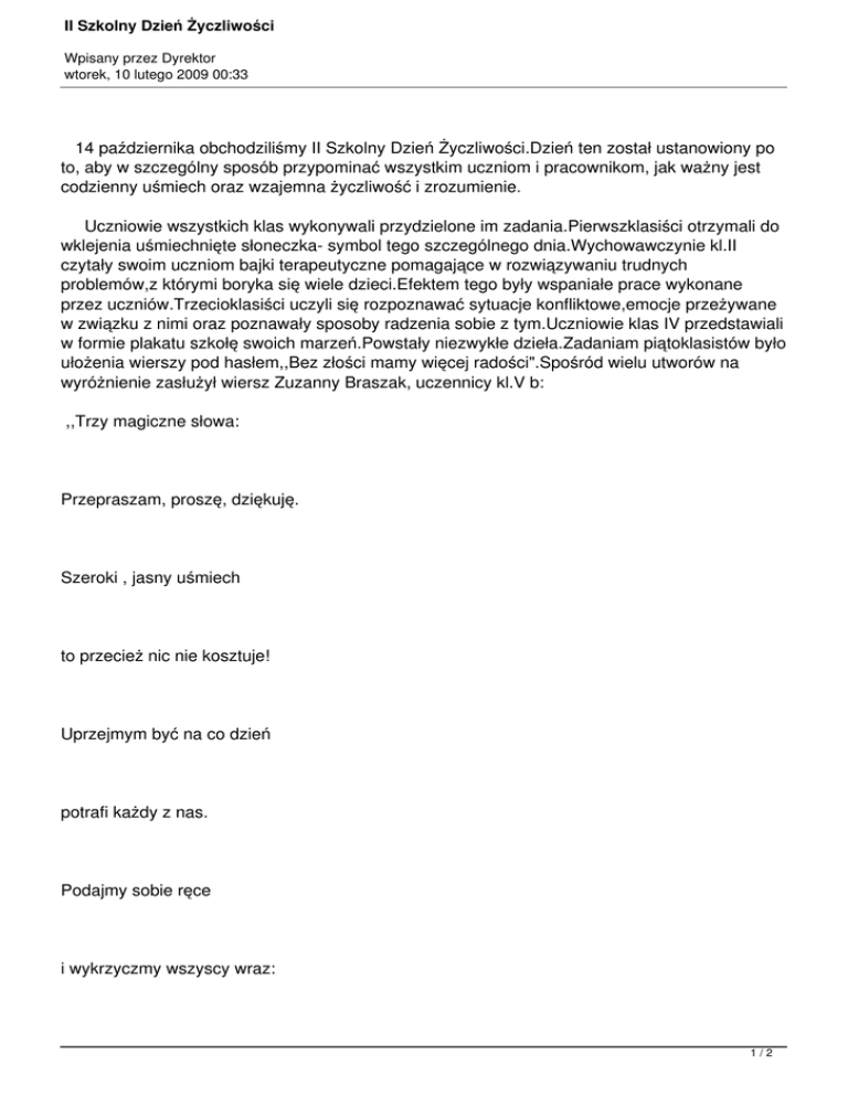 II Szkolny Dzień Życzliwości Wpisany przez Dyrektor wtorek, 10 lutego 2009 00:33 14 października obchodziliśmy II Szkolny Dzień Życzliwości.Dzień ten został ustanowiony po to, aby w szczególny sposób przypominać wszystkim uczniom i pracownikom, jak ważny jest codzienny uśmiech oraz wzajemna życzliwość i zrozumienie. Uczniowie wszystkich klas wykonywali przydzielone im zadania.Pierwszklasiści otrzymali do wklejenia uśmiechnięte słoneczka- symbol tego szczególnego dnia.Wychowawczynie kl.II czytały swoim uczniom bajki terapeutyczne pomagające w rozwiązywaniu trudnych problemów,z którymi boryka się wiele dzieci.Efektem tego były wspaniałe prace wykonane przez uczniów.Trzecioklasiści uczyli się rozpoznawać sytuacje konfliktowe,emocje przeżywane w związku z nimi oraz poznawały sposoby radzenia sobie z tym.Uczniowie klas IV przedstawiali w formie plakatu szkołę swoich marzeń.Powstały niezwykłe dzieła.Zadaniam piątoklasistów było ułożenia wierszy pod hasłem,,Bez złości mamy więcej radości".Spośród wielu utworów na wyróżnienie zasłużył wiersz Zuzanny Braszak, uczennicy kl.V b: ,,Trzy magiczne słowa: Przepraszam, proszę, dziękuję. Szeroki , jasny uśmiech to przecież nic nie kosztuje! Uprzejmym być na co dzień potrafi każdy z nas. Podajmy sobie ręce i wykrzyczmy wszyscy wraz: 1/2 II Szkolny Dzień Życzliwości Wpisany przez Dyrektor wtorek, 10 lutego 2009 00:33 ,,Bez złości mamy więcej radości" Uczniowie klas VI przygotowali ciekawe komiksy ukazujące, jak pokojowo rozwiązywać konflikty. Wszystkie prace wystawiono w holu szkoły, aby cała społecznośc uczniowska mogła się z nimi zapoznać. 2/2