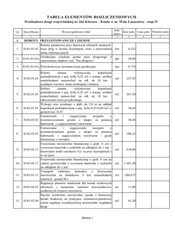 TABELA ELEMENTÓW ROZLICZENIOWYCH Przebudowa drogi wojewódzkiej nr 264 Kleczew - Konin w m. Wola Łaszczowa - etap IV Lp. Specyfikacja Wyszczególnienie robót 1 2 3 I. 1. 2. 3. Jedn. Ilość jedn. Cena jedn. Wartość netto miary 4 5 ROBOTY PRZYGOTOWAWCZE I ZIEMNE Roboty pomiarowe przy liniowych robotach ziemnych D-01.01.01 trasa dróg w terenie równinnym, wraz z ustawieniem km tablic informacyjnych Geodezyjne ustalenie granic pasa drogowego z D-01.01.01a pkt ustawieniem słupków ozn. "Pas drogowy" D-01.01.01a Powykonawcza inwentaryzacja geodezyjna 4. D-02.01.01 5. D-02.01.01 6. D-02.01.01 7. D-02.03.01 8. D-02.03.01 9. D-05.03.11 10. D-05.03.11 11. D-05.03.11 12 D-03.02.01 13. D-01.02.04 Roboty ziemne wykonywane koparkami podsiębiernymi o poj. łyŜki 0,25 m3 z transp. urobku samochodami samowyład. na odl. do 10 km – usunięcie warstwy ziemi urodzajnej i humusu Roboty ziemne wykonywane koparkami podsiębiernymi o poj. łyŜki 0,25 m3 z transp. urobku samochodami samowyład. na odl. do 10 km – odtworzenie rowu przydroŜnego Wykopy oraz przekopy o głęb. do 3,0 m na odkład koparkami podsiębiernymi o poj. łyŜki 0,25-0,60 m3 w gruncie kat. II-IV Formowanie i zagęszczanie nasypów z przemieszczeniem gruntu z ukopu za pomocą ładowarek z zagęszczeniem warstwami Formowanie i zagęszczanie nasypów z przemieszczeniem gruntu z ukopu za pomocą ładowarek z zagęszczeniem warstwami – grunt dowieziony z zewnątrz Frezowanie nawierzchni bitumicznej o grub. 6 cm z wywozem materiału z rozbiórki na odległość do 1 km – frezowanie muld szerokości 0,5 m przy krawędziach i w osi pasa Frezowanie nawierzchni bitumicznej o grub. 9 cm na całości powierzchni z wywozem materiału z rozbiórki na odległość do 1 km Transport nadmiaru destruktu z frezowania nawierzchni na dodatkowe 9 km samochodami samowył. ponad 20 t Regulacja pionowa studzienek dla kratek ściekowych ulicznych z montaŜem wpustów krawęznikowojezdniowych (wpusty inwestora) Ręczne rozebranie nawierzchni zjazdu z betonowej kostki brukowej na podsypce cementowo-piaskowej celem regulacji wysokościowej nawierzchni względem drogi Strona 1 0,323 28,00 km 0,774 m3 227,95 m3 267,50 m3 30,44 m3 30,44 m3 188,23 m2 810,00 m2 1 687,50 m3 200,475 szt. 11,00 m2 41,20 6 7 1 2 3 4 5 6 Razem rozdział I: II. KORYTA I POBUDOWY 14. Mechaniczne wykonanie koryta o średniej głębokości 35 cm w gruncie kat. II-IV pod zjazdy z transportem D-04.01.01 urobku na odl. 10 km w miejsce wskazane przez inwestora m2 187,50 15. D-04.01.01 Mechaniczne profilowanie i zagęszczenie podłoŜa m2 732,60 16. D-04.02.01 m2 545,10 m2 187,50 m2 270,00 17. 18. Warstwy odsączająca z piasku grubości 10 cm – chodnik Podbudowa z chudego betonu o Rm=6-9 MPa grub. D-04.06.01 20 cm - zjazdy D-04.07.01 Pobocze z kruszywa łamanego 0-31,5mm grub. 15 cm Razem rozdział II: III. 19. 20. 21. 22. NAWIERZCHNIE Nawierzchnia z betonowej kostki brukowej bezfazowej D-05.03.23 szarej grub. 8 cm na podsypce cementowo-piaskowej – chodnik Nawierzchnia z betonowej kostki brukowej bezfazowej D-05.03.23 czerwonej grub. 8 cm na podsypce cementowopiaskowej – zjazdy Ponowne ułoŜenie nawierzchni z kostki brukowej D-05.03.23 betonowej szarej grub. 8 cm na podsypce cementowopiaskowej - przełoŜenie zjazdu (kostka z rozbiórki) D-04.03.01 23. D-05.03.05a 24. D-04.03.01 25. D-05.03.13 Mechaniczne oczyszczenie i skropienie asfaltem podbudowy bitumicznej (nawierzchni jezdni po frezowaniu) w ilości 0,5 kg/m2 Warstwa wiąŜąca o grubości 5 cm z betonu asfaltowego AC16 Mechaniczne oczyszczenie i skropienie asfaltem nawierzchni bitumicznej (warstwa wiąŜąca) w ilości 0,3 kg/m2 Warstwa ścieralna z mieszanki SMA, grubość po zagęszczeniu 4 cm m2 545,10 m2 187,50 m2 41,20 m2 1 655,00 m2 1 640,00 m2 1 641,20 m2 1 749,00 Razem rozdział III: IV. ELEMENTY ULIC 26. D-08.03.01 Ława pod obrzeŜa z oporem z betonu C 12/15 (B-15) 27. 28. 29. ObrzeŜa betonowe o wym. 30x8 cm na podsypce D-08.03.01 cementowo-piaskowej, spoiny wypełnione zaprawą cementową Ława pod krawęŜnik 12x25 cm z oporem z betonu C D-08.01.01 12/15 (B-15) KrawęŜniki betonowe wtopione o wym. 12x25 cm bez D-08.01.01 ław na podsypce cementowo-piaskowej Strona 2 m3 21,316 m 532,90 m3 3,962 m 79,24 7 1 30. 31. 32. 33. 2 3 4 Ława pod krawęŜniki 20x30 cm z oporem z betonu C 12/15 (B-15) KrawęŜniki betonowe wystające o wym. 20x30 cm bez D-08.01.01 ław na podsypce cementowo-piaskowej KrawęŜniki betonowe obniŜone o wym. 20x30 cm bez D-08.01.01 ław na podsypce cementowo-piaskowej Ścieki uliczne z trzech rzędów betonowej kostki D-08.05.02 brukowej koloru szarego na ławie betonowej z betonu C 12/15 (B-15) D-08.01.01 5 6 m3 21,276 m 168,80 m 81,50 m 250,00 7 Razem rozdział IV: V. OZNAKOWANIE I URZĄDZENIA BEZPIECZEŃSTWA RUCHU 34. D-07.05.01 Bariery ochronne stalowe (słupek co 2,0 m) m 24,00 35. Oznakowanie poziome jezdni grubowarstwowe za D-07.02.01 pomocą mas chemoutwardzalnych - odtworzenie oznakowania po ułoŜeniu nawierzchni m2 60,00 Razem rozdział V: RAZEM NETTO VAT 23 % OGÓŁEM BRUTTO słownie: …………………………………...……………………………...………………………………….. ____________________________________ (podpis Wykonawcy) Strona 3