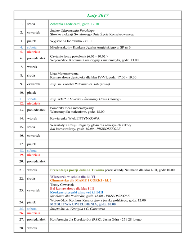 Luty 2017 1. środa Zebrania z rodzicami, godz. 17.30 2. czwartek Święto Ofiarowania Pańskiego Słówko z okazji Światowego Dnia Życia Konsekrowanego 3. piątek Wyjście na lodowisko - kl. II 4. 5. sobota niedziela Międzyszkolny Konkurs Języka Angielskiego w SP nr 6 6. poniedziałek 7. wtorek 8. środa Liga Matematyczna Karnawałowa dyskoteka dla klas IV-VI, godz. 17.00 - 19.00 9. czwartek Wsp. Bł. Euzebii Palomino (s. salezjanka) Czytanie łączy pokolenia (6.02 - 10.02.) Wojewódzki Konkurs Kuratoryjny z matematyki, godz. 13.00 10. piątek 11. sobota 12. niedziela Wsp. NMP. z Lourdes - Światowy Dzień Chorego 13. poniedziałek Pomorski mecz matematyczny Warsztaty dla małżeństw, godz. 18.00 14. wtorek Kawiarenka WALENTYNKOWA 15. środa Warsztaty z emisji i higieny głosu dla nauczycieli szkoły Bal karnawałowy, godz. 10.00 - PRZEDSZKOLE 16. czwartek 17. piątek 18. sobota 19. niedziela 20. poniedziałek 21. wtorek Prezentacja poezji Juliana Tuwima przez Wandę Neumann dla klas I-III, godz.10.00 22. środa Wieczorek w szkole dla kl. VI Gimnastyka dla MAMY i CÓRKI - kl. 2 Tłusty Czwartek Bal karnawałowy dla klas I-III Konkurs piosenki zimowej kl. I-III Spotkanie dla Rodziców, godz. 18.00 - PRZEDSZKOLE Wojewódzki Konkurs Kuratoryjny z języka polskiego, godz. 12.00 MODLITWA UWIELBIENIA, godz. 20.00 Święto św. A. Versiglia i C. Caravario 23. czwartek 24. piątek 25. sobota 26. niedziela 27. poniedziałek 28. wtorek Konferencja dla Dyrektorów (RSK), Jasna Góra - 27 i 28 lutego