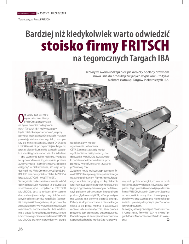 PIEKARSTWO 3/2012 | MASZYNY I URZĄDZENIA TEKST I ZDJĘCIA: FIRMA FRITSCH Bardziej niż kiedykolwiek warto odwiedzić stoisko firmy FRITSCH na tegorocznych Targach IBA Jedyny w swoim rodzaju piec piekarniczy opalany drewnem i nowa linia do produkcji zwijanych wypieków – to tylko niektóre z atrakcji Targów Piekarniczych IBA. O d wielu już lat mocnym atutem firmy FRITSCH są prezentacje na żywo. Również na tegorocznych Targach IBA odwiedzający będą mieli okazję obserwować, jak przy pomocy najnowocześniejszych maszyn powstają różnorodne wypieki, począwszy od minicroissantów, przez D-Shapes i miniślimaki, aż po najróżniejsze bagietki, precle, plecionki, miękkie paluszki, wypieki z cienkiego ciasta lub ciastka składane – aby wymienić tylko niektóre. Produkty te są dowodem na to, jak wysoki poziom automatyzacji i komfort można obecnie osiągnąć w piekarnictwie, stosując urządzenia firmy FRITSCH (m.in. MULTILINE, EUROLINE, linia do wypieku chleba IMPRESSA bread, MULTICUT i MULTITWIST). Szczególnie duże zainteresowanie wśród odwiedzających wzbudzi z pewnością wielofunkcyjne urządzenie FRITSCH MULTICOIL. Jest to uniwersalny system do produkcji rozmaitych wypieków zwijanych od croissantów, rogalików (cornetti), hiszpańskich rogalików, aż po paluchy z solą i ziarnami we wszystkich możliwych rozmiarach, nadziewanych i bez nadzienia, z ciasta francuskiego, półfrancuskiego i drożdżowego. Serce urządzenia FRITSCH MULTICOIL stanowi sprawdzony i ciągle 26 udoskonalany moduł wykrawania i obracania CSTR. Za nim ustawia się moduł wydłużania i (w razie potrzeby) nadziewarkę. MULTICOIL zwija wypieki nadziewane i bez nadzienia przy pomocy wielofunkcyjnej zwijarki próżniowej CSV. Zupełnie nowe oblicze zaprezentuje firma FRITSCH za sprawą pieca piekarniczego opalanego drewnem FlammAroma, łączącego w sobie tradycyjną sztukę piekarniczą i najnowocześniejszą technologię. Piec ten jest ogrzewany drewnianymi pelletami, czyli paliwem odnawialnym i neutralnym pod względem emisji CO2, które poza tym ma wyższą niż drewno gęstość energii. Pellety są doprowadzane z niewielkiego silosa, a do pieca można je załadować ręcznie lub automatycznie; sam proces pieczenia jest sterowany automatycznie. Dodatkowymi atutami pieca FlammAroma są ponadto: bardzo krótka faza nagrzewa- nia, niski pobór energii i, co warte podkreślenia, stylowy design. Również w przypadku tego produktu obowiązuje dewiza firmy FRITSCH „Made in Germany”. Spełnia on oczywiście wszystkie obowiązujące dyrektywy oraz wymagania niemieckiego związku piekarzy dotyczące pieców opalanych drewnem. Te i więcej atrakcji czekają na Państwa w hali A2 na stoisku firmy FRITSCH nr 110 na Targach IBA w Monachium od 16 do 21 wrze śnia.