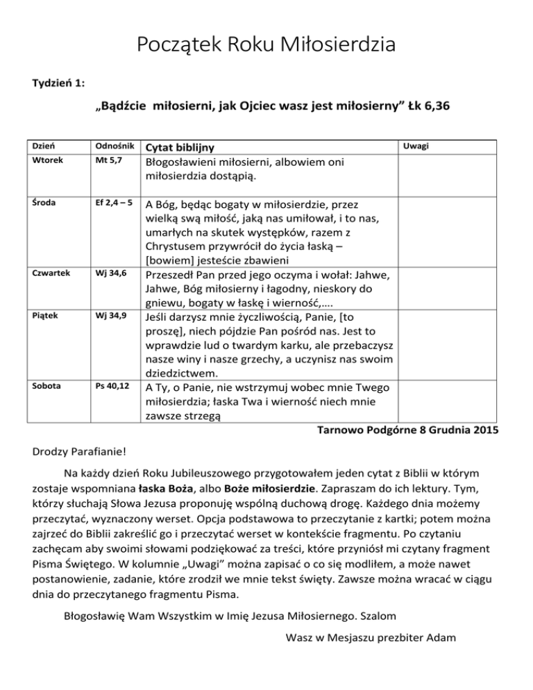 Początek Roku Miłosierdzia Tydzień 1: „Bądźcie miłosierni, jak Ojciec wasz jest miłosierny” Łk 6,36 Dzień Odnośnik Wtorek Mt 5,7 Środa Ef 2,4 – 5 Czwartek Wj 34,6 Piątek Wj 34,9 Sobota Ps 40,12 Cytat biblijny Błogosławieni miłosierni, albowiem oni miłosierdzia dostąpią. Uwagi A Bóg, będąc bogaty w miłosierdzie, przez wielką swą miłość, jaką nas umiłował, i to nas, umarłych na skutek występków, razem z Chrystusem przywrócił do życia łaską – [bowiem] jesteście zbawieni Przeszedł Pan przed jego oczyma i wołał: Jahwe, Jahwe, Bóg miłosierny i łagodny, nieskory do gniewu, bogaty w łaskę i wierność,…. Jeśli darzysz mnie życzliwością, Panie, [to proszę], niech pójdzie Pan pośród nas. Jest to wprawdzie lud o twardym karku, ale przebaczysz nasze winy i nasze grzechy, a uczynisz nas swoim dziedzictwem. A Ty, o Panie, nie wstrzymuj wobec mnie Twego miłosierdzia; łaska Twa i wierność niech mnie zawsze strzegą Tarnowo Podgórne 8 Grudnia 2015 Drodzy Parafianie! Na każdy dzień Roku Jubileuszowego przygotowałem jeden cytat z Biblii w którym zostaje wspomniana łaska Boża, albo Boże miłosierdzie. Zapraszam do ich lektury. Tym, którzy słuchają Słowa Jezusa proponuję wspólną duchową drogę. Każdego dnia możemy przeczytać, wyznaczony werset. Opcja podstawowa to przeczytanie z kartki; potem można zajrzeć do Biblii zakreślić go i przeczytać werset w kontekście fragmentu. Po czytaniu zachęcam aby swoimi słowami podziękować za treści, które przyniósł mi czytany fragment Pisma Świętego. W kolumnie „Uwagi” można zapisać o co się modliłem, a może nawet postanowienie, zadanie, które zrodził we mnie tekst święty. Zawsze można wracać w ciągu dnia do przeczytanego fragmentu Pisma. Błogosławię Wam Wszystkim w Imię Jezusa Miłosiernego. Szalom Wasz w Mesjaszu prezbiter Adam