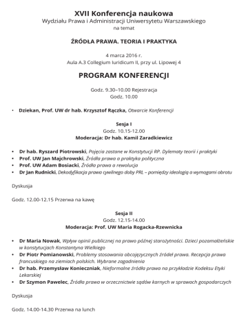 XVII Konferencja naukowa Wydziału Prawa i Administracji Uniwersytetu Warszawskiego na temat ŹRÓDŁA PRAWA. TEORIA I PRAKTYKA 4 marca 2016 r. Aula A.3 Collegium Iuridicum II, przy ul. Lipowej 4 PROGRAM KONFERENCJI Godz. 9.30–10.00 Rejestracja Godz. 10.00 • Dziekan, Prof. UW dr hab. Krzysztof Rączka, Otwarcie Konferencji Sesja I Godz. 10.15-12.00 Moderacja: Dr hab. Kamil Zaradkiewicz • • • • Dr hab. Ryszard Piotrowski, Pojęcia zastane w Konstytucji RP. Dylematy teorii i praktyki Prof. UW Jan Majchrowski, Źródła prawa a praktyka polityczna Prof. UW Adam Bosiacki, Źródła prawa a rewolucja Dr Jan Rudnicki, Dekodyfikacja prawa cywilnego doby PRL – pomiędzy ideologią a wymogami obrotu Dyskusja Godz. 12.00-12.15 Przerwa na kawę Sesja II Godz. 12.15-14.00 Moderacja: Prof. UW Maria Rogacka-Rzewnicka • Dr Maria Nowak, Wpływ opinii publicznej na prawo późnej starożytności. Dzieci pozamałżeńskie w konstytucjach Konstantyna Wielkiego • Dr Piotr Pomianowski, Problemy stosowania obcojęzycznych źródeł prawa. Recepcja prawa francuskiego na ziemiach polskich. Wybrane zagadnienia • Dr hab. Przemysław Konieczniak, Nieformalne źródła prawa na przykładzie Kodeksu Etyki Lekarskiej • Dr Szymon Pawelec, Źródła prawa w orzecznictwie sądów karnych w sprawach gospodarczych Dyskusja Godz. 14.00-14.30 Przerwa na lunch Sesja III Godz. 14.30-16.15 Moderacja: Prof. dr hab. Paweł Czechowski • Prof. dr hab. Jacek Jagielski, Źródła prawa miejscowego • Prof. UW Łukasz Pisarczyk, Autonomiczne źródła prawa pracy. Wybrane zagadnienia • Prof. UW Jacek Jastrzębski, Zbiory zasad prawa umów i lex mercatoria w prawie umów gospodarczych – znaczenie i perspektywy rozwoju • Dr hab. Konrad Osajda, Multiźródłowość: teoria czy praktyka? Atypowe źródła prawa prywatnego Dyskusja Godz. 16.15-16.30 Przerwa na kawę Sesja IV Godz. 16.30-18.15 Moderacja: Prof. dr hab. Maria Kenig-Witkowska • Dr Dobrochna Bach-Golecka, O ontologii oksymoronów. Znaczenie soft law w prawie Unii Europejskiej • Dr Paweł Marcisz, Orzeczenia Trybunału Sprawiedliwości Unii Europejskiej jako źródło prawa obowiązującego na terytorium Rzeczypospolitej Polski • Mgr Jędrzej Maśnicki, Specyfika ustaw implementujących prawo pochodne UE w polskim porządku prawnym • Dr Magdalena Słok-Wódkowska, Legitymizacja umów międzynarodowych zawieranych przez Unię Europejską Dyskusja Godz. 18.15–18.30 • Prodziekan, Prof. dr hab. Tomasz Giaro, Podsumowanie