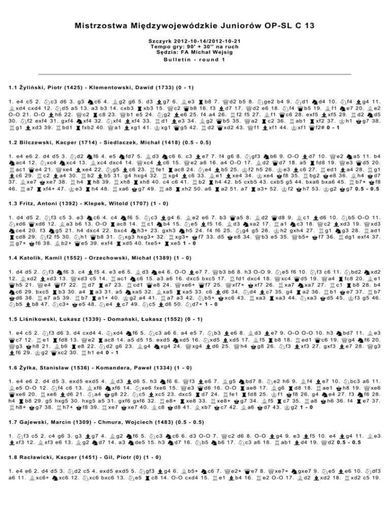 Mistrzostwa Międzywojewódzkie Juniorów OP-SL C 13 Szczyrk 2012-10-14/2012-10-21 Tempo gry: 90' + 30'' na ruch Sędzia: FA Michał Wejsig Bulletin - round 1 1.1 Żyliński, Piotr (1425) - Klementowski, Dawid (1733) (0 - 1) 1. e4 c5 2. N c3 d6 3. g3 n c6 4. L g2 g6 5. d3 l g7 6. L e3 T b8 7. Q d2 b5 8. N ge2 b4 9. N d1 n d4 10. N f4 l g4 11. L xd4 cxd4 12. N d5 a5 13. a3 b3 14. cxb3 T xb3 15. Q c2 W b8 16. f3 l d7 17. Q d2 e6 18. N f4 W b5 19. L f1 n e7 20. L e2 O- O 21. O-O l h6 22. Q c2 T c8 23. Q b1 e5 24. N g2 l e6 25. f4 a4 26. R f2 f5 27. L f1 W c6 28. exf5 l xf5 29. R d2 n d5 30. N f2 exf4 31. gxf4 n xf4 32. N xf4 l xf4 33. R d1 l e3 34. L g2 W b5 35. Q a2 T c2 36. R ab1 T xf2 37. K h1 k g7 38. R g1 l xd3 39. R bd1 T fxb2 40. Q a1 l xg1 41. K xg1 W g5 42. R d2 W xd2 43. Q f1 l xf1 44. K xf1 W f2# 0 - 1 1.2 Bilczewski, Kacper (1714) - Siedlaczek, Michał (1418) (0.5 - 0.5) 1. e4 e6 2. d4 d5 3. N d2 n f6 4. e5 n fd7 5. L d3 n c6 6. c3 l e7 7. f4 g6 8. N gf3 n b6 9. O-O l d7 10. Q e2 n a5 11. b4 n ac4 12. N xc4 n xc4 13. L xc4 dxc4 14. Q xc4 l c6 15. Q e2 a6 16. a4 O-O 17. L d2 W d7 18. a5 T fd8 19. Q e3 W d5 20. R ac1 W e4 21. Q xe4 l xe4 22. N g5 l c6 23. R fe1 T ac8 24. N e4 l b5 25. K f2 h5 26. K e3 l c6 27. R ed1 l a4 28. R g1 l c6 29. R c2 l a4 30. R b2 l b5 31. g4 hxg4 32. R xg4 l c6 33. L e1 l xe4 34. K xe4 k f8 35. R bg2 k e8 36. L h4 k d7 37. L xe7 k xe7 38. R h4 T h8 39. R xh8 T xh8 40. c4 c6 41. R b2 T h4 42. b5 cxb5 43. cxb5 g5 44. bxa6 bxa6 45. R b7+ k f8 46. R a7 T xf4+ 47. K e3 T h4 48. R xa6 k g7 49. R a8 T xh2 50. a6 T a2 51. a7 T a3+ 52. K f2 k h7 53. K g2 k g7 0.5 - 0.5 1.3 Fritz, Antoni (1392) - Klepek, Witold (1707) ( 1 - 0) 1. d4 d5 2. N f3 c5 3. e3 n c6 4. c4 n f6 5. N c3 l g4 6. L e2 e6 7. b3 W a5 8. L d2 W d8 9. L c1 l d6 10. N b5 O-O 11. N xd6 W xd6 12. L a3 b6 13. O-O T ac8 14. R c1 n b4 15. N e5 l f5 16. L d3 n xa2 17. R a1 n c3 18. Q c2 l xd3 19. Q xd3 n ce4 20. f3 n g5 21. h4 dxc4 22. bxc4 n h3+ 23. gxh3 n h5 24. f4 f6 25. N g4 g5 26. K h2 gxh4 27. R g1 n g3 28. R ad1 T cd8 29. N f2 f5 30. N h1 W b8 31. N xg3 hxg3+ 32. R xg3+ k f7 33. d5 k e8 34. Q b3 e5 35. Q b5+ k f7 36. R dg1 exf4 37. R g7+ k f6 38. L b2+ W e5 39. exf4 T xd5 40. fxe5+ T xe5 1 - 0 1.4 Katolik, Kamil (1552) - Orzechowski, Michał (1389) (1 - 0) 1. d4 d5 2. N f3 n f6 3. c4 l f5 4. e3 e6 5. L d3 n e4 6. O-O l e7 7. Q b3 b6 8. h3 O-O 9. N e5 f6 10. N f3 c6 11. N bd2 n xd2 12. L xd2 l xd3 13. Q xd3 c5 14. R ac1 n c6 15. a3 a6 16. dxc5 bxc5 17. R fd1 dxc4 18. Q xc4 W d5 19. Q a4 T fc8 20. L e1 W h5 21. Q e4 W f7 22. R d7 T a7 23. R cd1 W e8 24. Q xe6+ W f7 25. Q xf7+ k xf7 26. R xa7 n xa7 27. R c1 T b8 28. b4 n c6 29. bxc5 T b3 30. a4 T a3 31. a5 n xa5 32. L xa5 T xa5 33. c6 l d6 34. N d4 l c7 35. g4 T a2 36. R b1 k e7 37. R b7 k d6 38. R a7 a5 39. R b7 T a1+ 40. K g2 a4 41. R a7 a3 42. N b5+ k xc6 43. R xa3 T xa3 44. N xa3 k d5 45. K f3 g5 46. N b5 l b8 47. N c3+ k e5 48. N e4 l c7 49. N c5 l d6 50. N d7+ 1 - 0 1.5 Liśnikowski, Łukasz (1339) - Domański, Łukasz (1552) (0 - 1) 1. e4 c5 2. N f3 d6 3. d4 cxd4 4. N xd4 n f6 5. N c3 a6 6. a4 e5 7. N b3 l e6 8. L d3 l e7 9. O-O O-O 10. h3 n bd7 11. L e3 W c7 12. R e1 T fd8 13. Q e2 T ac8 14. a5 d5 15. exd5 n xd5 16. N xd5 l xd5 17. L f5 T b8 18. R ed1 W c6 19. Q g4 n f6 20. Q g3 k h8 21. L b6 T e8 22. N d2 g6 23. L g4 n xg4 24. Q xg4 l d6 25. Q h4 k g8 26. N f3 l xf3 27. gxf3 l e7 28. Q g3 l f6 29. K g2 W xc2 30. R h1 e4 0 - 1 1.6 Żyłka, Stanisław (1536) - Komandera, Paweł (1334) ( 1 - 0) 1. e4 e6 2. d4 d5 3. exd5 exd5 4. L d3 l d6 5. h3 n f6 6. Q f3 l e6 7. L g5 n bd7 8. N e2 h6 9. L f4 l e7 10. N bc3 a6 11. L e5 O-O 12. N f4 c6 13. L xf6 n xf6 14. N xe6 fxe6 15. Q e3 W d6 16. O-O T ae8 17. L g6 T d8 18. R ae1 k h8 19. Q xe6 W xe6 20. R xe6 l d6 21. N a4 k g8 22. N c5 l xc5 23. dxc5 T d7 24. R fe1 T fd8 25. K f1 k f8 26. g4 n e4 27. f3 n f6 28. h4 T b8 29. g5 hxg5 30. hxg5 a5 31. gxf6 gxf6 32. R e8+ T xe8 33. R xe8+ k g7 34. L f5 T c7 35. R a8 k h6 36. f4 T e7 37. R h8+ k g7 38. R h7+ k f8 39. R xe7 k xe7 40. L c8 k d8 41. L xb7 k c7 42. L a6 k d7 43. K g2 1 - 0 1.7 Gajewski, Marcin (1309) - Chmura, Wojciech (1483) (0.5 - 0.5) N f3 c5 2. c4 g6 3. g3 l g7 4. L g2 n f6 5. N c3 n c6 6. d3 O-O 7. Q c2 d6 8. O-O l g4 9. e3 l f5 10. e4 l g4 11. L e3 l xf3 12. L xf3 e6 13. L g2 n d7 14. a3 n de5 15. h3 n d7 16. N b5 n b6 17. N c3 a6 18. R ab1 l d4 19. Q d2 0.5 - 0.5 1. 1.8 Racławicki, Kacper (1451) - Gil, Piotr (0) (1 - 0) 1. e4 e6 2. d4 d5 3. N d2 c5 4. exd5 exd5 5. N gf3 l g4 6. L b5+ n c6 7. Q e2+ W e7 8. Q xe7+ n gxe7 9. N e5 l e6 10. N df3 a6 11. L xc6+ n xc6 12. N xc6 bxc6 13. N e5 T c8 14. O-O cxd4 15. R e1 l b4 16. R e2 O-O 17. L d2 l xd2 18. R xd2 c5 19. h3 T fe8 20. N f3 l f5 21. R c1 l e4 22. N e1 T e5 23. K f1 T b8 24. b3 k f8 25. N d3 l xd3+ 26. cxd3 T be8 27. R dc2 T c8 28. R xc5 T xc5 29. R xc5 k e7 30. R a5 T e6 31. R xd5 f6 32. R xd4 T d6 33. R xd6 k xd6 34. K e2 k d5 35. K e3 k e5 36. d4+ k d5 37. K d3 g5 38. g4 k e6 39. K e4 k d6 40. K f5 k d5 41. K xf6 1 - 0 1.9 Szczerbak, Kamil (0) - Rybka, Martin (1443) ( 0.5 - 0.5) 1. e4 e5 2. N f3 n c6 3. L c4 n f6 4. N g5 d5 5. exd5 b5 6. L b3 n d4 7. c3 n xb3 8. Q xb3 W xd5 9. O-O W xb3 10. axb3 l d6 11. R e1 O-O 12. d3 l f5 13. N e4 n xe4 14. dxe4 l e6 15. b4 T fd8 16. L e3 a6 17. f3 l e7 18. N a3 l b3 19. N b1 T d3 20. N d2 l e6 21. N f1 k f8 22. R ed1 T xd1 23. R xd1 a5 24. R a1 a4 25. N d2 T d8 26. K f2 T c8 27. R c1 c5 28. bxc5 l xc5 29. L xc5+ T xc5 30. N b1 l a2 31. K e2 k e7 32. K d2 k d7 33. N a3 k c7 34. N c2 T c6 35. K e3 T d6 36. N b4 l b3 37. N d3 f6 38. h3 k d8 39. N c5 k c7 40. N xb3 axb3 41. K e2 T a6 42. K d3 T a2 43. R b1 k c6 44. h4 g5 45. h5 h6 46. g4 k c5 47. K e3 k c4 48. K d2 T a6 49. K e3 T a2 0.5 - 0.5 ChessArbiter Pro 2010 (v.5.21) © A.Curyło http://www.chessarbit er.com/ Właściciel: FA Michał Wejsig Mistrzostwa Międzywojewódzkie Juniorów OP-SL C 13 Szczyrk 2012-10-14/2012-10-21 Tempo gry: 90' + 30'' na ruch Sędzia: FA Michał Wejsig Bulletin - roun
