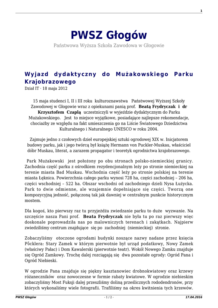 1 PWSZ Głogów Państwowa Wyższa Szkoła Zawodowa w Głogowie Wyjazd dydaktyczny Krajobrazowego do Mużakowskiego Parku Dział IT · 18 maja 2012 15 maja studenci I, II i III roku kulturoznawstwa Państwowej Wyższej Szkoły Zawodowej w Głogowie wraz z opiekunami panią prof. Beatą Frydryczak i dr Krzysztofem Czaplą uczestniczyli w wyjeździe dydaktycznym do Parku Mużakowskiego. Jest to miejsce wyjątkowe, posiadające najlepsze rekomendacje, chociażby ze względu na fakt umieszczenia go na Liście Światowego Dziedzictwa Kulturalnego i Naturalnego UNESCO w roku 2004. Zajmuje jedno z czołowych dzieł europejskiej sztuki ogrodowej XIX w. Inicjatorem budowy parku, jak i jego twórcą był książę Hermann von Puckler-Muskau, właściciel dóbr Muskau, literat, a zarazem propagator i teoretyk ogrodnictwa krajobrazowego. Park Mużakowski jest położony po obu stronach polsko-niemieckiej granicy. Zachodnia część parku z ośrodkiem rezydencjonalnym leży po stronie niemieckiej na terenie miasta Bad Muskau. Wschodnia część leży po stronie polskiej na terenie miasta Łęknica. Powierzchnia całego parku wynosi 728 ha, części zachodniej – 206 ha, części wschodniej – 522 ha. Obszar wschodni od zachodniego dzieli Nysa Łużycka. Park to dwie odmienne, ale wzajemnie dopełniające się części. Tworzą one kompozycyjną jedność, połączoną tak jak dawniej w centralnym punkcie historycznym mostem. Dla kogoś, kto pierwszy raz tu przyjeżdża zwiedzanie parku to duże wyzwanie. Na szczęście nasza Pani prof. Beata Frydryczak nie była tu po raz pierwszy więc doskonale poprowadziła nas po malowniczych terenach i zakątkach. Najpierw zwiedziliśmy centrum znajdujące się po zachodniej (niemieckiej) stronie. Zobaczyliśmy otoczone ogrodami budynki noszące nazwy nadane przez księcia Pὔcklera: Stary Zamek w którym pierwotnie był urząd podatkowy, Nowy Zamek (właściwy Pałac) i Dom Kawalerski (pierwotnie teatr). Wokół Nowego Zamku znajduje się Ogród Zamkowy. Trochę dalej rozciągają się dwa pozostałe ogrody: Ogród Pana i Ogród Niebieski. W ogrodzie Pana znajduje się piękny kasztanowiec drobnokwiatowy oraz krzewy różaneczników oraz nowoczesne w formie rabaty kwiatowe. W ogrodzie niebieskim zobaczyliśmy Most Fuksji dalej przeszliśmy doliną prześlicznych rododendronów, przy których wykonaliśmy wiele fotografii. Trafiliśmy na okres kwitnienia tych krzewów. PWSZ Głogów -1/2- 17.04.2016 2 Kolory żółty, fioletowy, różowy i ich różne odcienie naprawdę zrobiły wielkie wrażenie tak jak i wybujałe bardzo zielone rośliny i ogromne dęby. Spacerując przechodziliśmy przez Most przy Jeziorze Dębów w Parku Zamkowym. Zobaczyliśmy wiele mostków na drogach i ścieżkach parkowych oraz wodospady. Na uwagę zasługuje Wodospad przy Jeziorze Dębów, ułożony z dużych głazów. Po stronie wschodniej dominują scenerie bliskie naturze, powstałe jak by się mogło wydawać bez udziału ludzkiej ręki. Rozpościerają się tutaj malownicze łąki, wąwozy oraz zatopione w nich budowle. Zwiedzając wschodnią część parku nietrudno o refleksję, jak wrażliwym dziełem jest park krajobrazowy. W Parku na Tarasach znajdują się liczne dęby opatrzone nazwami własnymi. Mają one związek zarówno z osobistymi przeżyciami twórcy, jak np. Dąb Klementyny (imię matki) jak i z kontekstem kompozycji, w której zostały umieszczone lub imionami mitologicznych postaci i bogów. Przechodząc przez Most Podwójny , podziwialiśmy piękny widok na Kamień Pucklera i Most Królewski – zwany także Książęcym. Widzieliśmy Most Arkadowy i niektórzy z nas zeszli do wąwozu Ścieżką Sary. Przechodziliśmy przez wiadukt na Tarasach i Park Górny. Park jest bardzo rozległy i zróżnicowany, przyjeżdżając tutaj można go zwiedzać pieszo, rowerem a nawet bryczką. Po stronie niemieckiej znajduje się wypożyczalnia rowerów. W obu częściach parku przewoźnicy oferują przejażdżki bryczkami. Zachęcamy wszystkich, którzy tam jeszcze nie byli do odwiedzenia tych niezwykle urokliwych miejsc, które pozostają na zawsze w pamięci. Stefania Karwatka studentka I roku kulturoznawstwa Ten wpis został utworzony 18 maja 2012 o godz. 12:27 w kategorii Aktualności. PWSZ Głogów -2/2- 17.04.2016