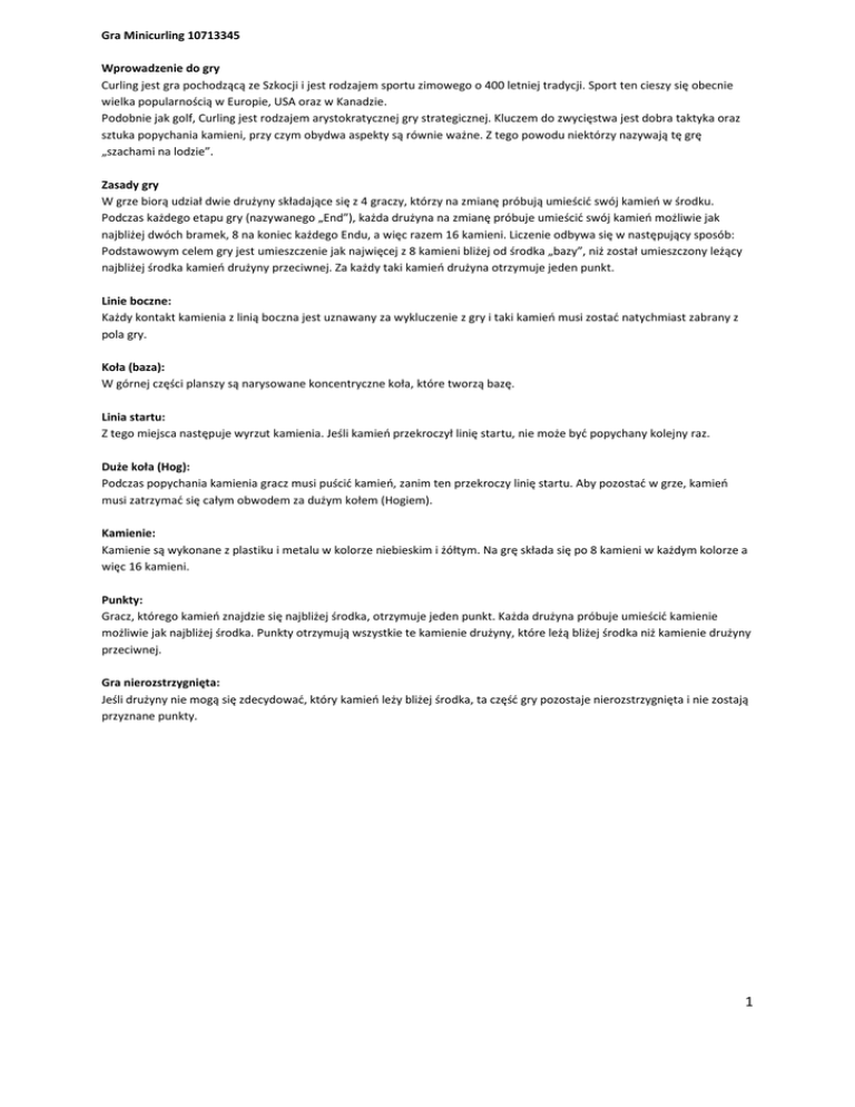 Gra Minicurling 10713345 Wprowadzenie do gry Curling jest gra pochodzącą ze Szkocji i jest rodzajem sportu zimowego o 400 letniej tradycji. Sport ten cieszy się obecnie wielka popularnością w Europie, USA oraz w Kanadzie. Podobnie jak golf, Curling jest rodzajem arystokratycznej gry strategicznej. Kluczem do zwycięstwa jest dobra taktyka oraz sztuka popychania kamieni, przy czym obydwa aspekty są równie ważne. Z tego powodu niektórzy nazywają tę grę „szachami na lodzie”. Zasady gry W grze biorą udział dwie drużyny składające się z 4 graczy, którzy na zmianę próbują umieścić swój kamień w środku. Podczas każdego etapu gry (nazywanego „End”), każda drużyna na zmianę próbuje umieścić swój kamień możliwie jak najbliżej dwóch bramek, 8 na koniec każdego Endu, a więc razem 16 kamieni. Liczenie odbywa się w następujący sposób: Podstawowym celem gry jest umieszczenie jak najwięcej z 8 kamieni bliżej od środka „bazy”, niż został umieszczony leżący najbliżej środka kamień drużyny przeciwnej. Za każdy taki kamień drużyna otrzymuje jeden punkt. Linie boczne: Każdy kontakt kamienia z linią boczna jest uznawany za wykluczenie z gry i taki kamień musi zostać natychmiast zabrany z pola gry. Koła (baza): W górnej części planszy są narysowane koncentryczne koła, które tworzą bazę. Linia startu: Z tego miejsca następuje wyrzut kamienia. Jeśli kamień przekroczył linię startu, nie może być popychany kolejny raz. Duże koła (Hog): Podczas popychania kamienia gracz musi puścić kamień, zanim ten przekroczy linię startu. Aby pozostać w grze, kamień musi zatrzymać się całym obwodem za dużym kołem (Hogiem). Kamienie: Kamienie są wykonane z plastiku i metalu w kolorze niebieskim i żółtym. Na grę składa się po 8 kamieni w każdym kolorze a więc 16 kamieni. Punkty: Gracz, którego kamień znajdzie się najbliżej środka, otrzymuje jeden punkt. Każda drużyna próbuje umieścić kamienie możliwie jak najbliżej środka. Punkty otrzymują wszystkie te kamienie drużyny, które leżą bliżej środka niż kamienie drużyny przeciwnej. Gra nierozstrzygnięta: Jeśli drużyny nie mogą się zdecydować, który kamień leży bliżej środka, ta część gry pozostaje nierozstrzygnięta i nie zostają przyznane punkty. 1 2