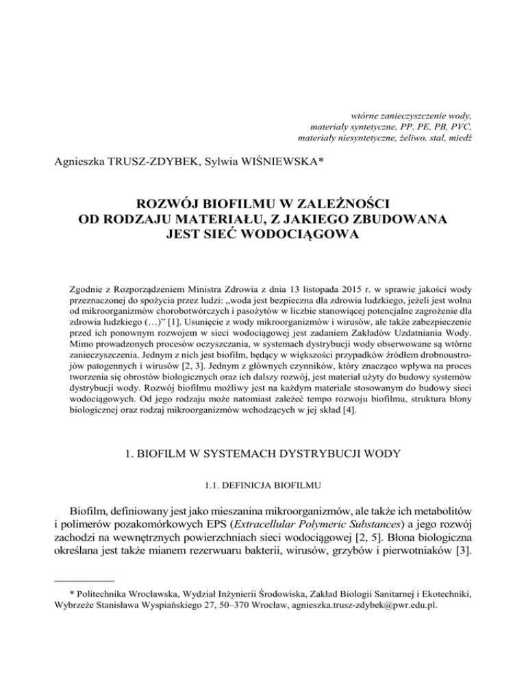 wtórne zanieczyszczenie wody, materiały syntetyczne, PP, PE, PB, PVC, materiały niesyntetyczne, żeliwo, stal, miedź Agnieszka TRUSZ-ZDYBEK, Sylwia WIŚNIEWSKA* ROZWÓJ BIOFILMU W ZALEŻNOŚCI OD RODZAJU MATERIAŁU, Z JAKIEGO ZBUDOWANA JEST SIEĆ WODOCIĄGOWA Zgodnie z Rozporządzeniem Ministra Zdrowia z dnia 13 listopada 2015 r. w sprawie jakości wody przeznaczonej do spożycia przez ludzi: „woda jest bezpieczna dla zdrowia ludzkiego, jeżeli jest wolna od mikroorganizmów chorobotwórczych i pasożytów w liczbie stanowiącej potencjalne zagrożenie dla zdrowia ludzkiego (…)” [1]. Usunięcie z wody mikroorganizmów i wirusów, ale także zabezpieczenie przed ich ponownym rozwojem w sieci wodociągowej jest zadaniem Zakładów Uzdatniania Wody. Mimo prowadzonych procesów oczyszczania, w systemach dystrybucji wody obserwowane są wtórne zanieczyszczenia. Jednym z nich jest biofilm, będący w większości przypadków źródłem drobnoustrojów patogennych i wirusów [2, 3]. Jednym z głównych czynników, który znacząco wpływa na proces tworzenia się obrostów biologicznych oraz ich dalszy rozwój, jest materiał użyty do budowy systemów dystrybucji wody. Rozwój biofilmu możliwy jest na każdym materiale stosowanym do budowy sieci wodociągowych. Od jego rodzaju może natomiast zależeć tempo rozwoju biofilmu, struktura błony biologicznej oraz rodzaj mikroorganizmów wchodzących w jej skład [4]. 1. BIOFILM W SYSTEMACH DYSTRYBUCJI WODY 1.1. DEFINICJA BIOFILMU Biofilm, definiowany jest jako mieszanina mikroorganizmów, ale także ich metabolitów i polimerów pozakomórkowych EPS (Extracellular Polymeric Substances) a jego rozwój zachodzi na wewnętrznych powierzchniach sieci wodociągowej [2, 5]. Błona biologiczna określana jest także mianem rezerwuaru bakterii, wirusów, grzybów i pierwotniaków [3]. __________ * Politechnika Wrocławska, Wydział Inżynierii Środowiska, Zakład Biologii Sanitarnej i Ekotechniki, Wybrzeże Stanisława Wyspiańskiego 27, 50–370 Wrocław, [email protected]. Rozwój biofilmu w zależności od rodzaju materiału … 247 Uzupełniającą definicją jest określenie, że biofilm będący zbiorem bakterii, glonów, pierwotniaków, grzybów, a także wirusów to wielokomórkowa, skomplikowana struktura składająca się z wielu, oddzielonych od siebie kanalikami, mikrokolonii, otoczona warstwą różnych substancji, którymi są związki o charakterze organicznym, jak i nieorganicznym. Substancje wchodzące w skład otoczki produkowane są przez mikroorganizmy i wykazują zdolność adhezji do powierzchni biotycznych i abiotycznych [6, 7]. Dodatkowymi składnikami biofilmu mogą być produkty korozji elektrochemicznej, a także różnego typu osady obecne w wodzie [5]. Mikroorganizmy oraz wirusy wchodzące w skład błony biologicznej mogą pogarszać jakość wody do picia, wykazując tym samym zagrożenie sanitarne dla odbiorców [8]. 1.2. ZAGROŻENIA, JAKIE STWARZA BIOFILM W SIECI WODOCIĄGOWEJ Rozwój błony biologicznej w sieci dystrybucji wody do picia może być przyczyną wielu problemów. Najpoważniejszym ryzykiem, jakie stwarza jest możliwość obniżenia jakości sanitarnej wody, ponieważ może być źródłem mikroorganizmów oraz wirusów. Większość z drobnoustrojów nie wywołuje objawów chorobowych, jeśli układ immunologiczny odbiorcy funkcjonuje prawidłowo. Często jednak w skład biofilmu wchodzą mikroorganizmy patogenne oraz cząstki wirusów, które bezpośrednio zagrażają zdrowiu ludzi. Właściwie na każdym materiale stosowanym do budowy sieci wodociągowej, stwierdzany jest rozwój mikroorganizmów patogennych, takich jak m.in. Legionella czy Cryptosporidium [9–11]. Błona biologiczna to także problemy techniczne i ekonomiczne [10]. Stwierdzono, że rozwój biofilmu zwiększa wymaganą dawkę środka, który wykorzystywany jest do dezynfekcji sieci wodociągowej. Przyczyną tego jest namnażanie i rozwój mikroorganizmów, ale także zwiększenie ich oporności na stosowany dezynfektant, dzięki kumulowaniu się. Poza tym drobnoustroje produkują liczne substancje organiczne i nieorganiczne, które mają negatywny wpływ na powłoki antykorozyjne, strukturę materiałów czy na odczyn środowiska. Obecność biofilmu w wodzie to problem również z tego względu, że korozja mikrobiologiczna potęguje korozję elektrochemiczną za sprawą produkowanych przez bakterie metabolitów. Prowadzi to do wzmożonego niszczenia rurociągów. Obecność błony biologicznej w sieciach wodociągowych skutkuje także zmianą właściwości fizyko-chemicznych wody. W wyniku uwalniania przez mikroorganizmy różnorodnych substancji pogorszeniu ulega smak, zapach, mętność czy barwa wody. Ma na to wpływ także wcześniej wspomniana korozja elektrochemiczna, której produkty wywołują podobny efekt [4, 12]. Kolejnym negatywnym skutkiem powstających obrostów biologicznych jest zmniejszenie średnicy wewnętrznej przewodów wodociągowych. Poza tym rozwijający się biofilm powoduje wzrost chropowatości, co z kolei wpływa na zwiększenie oporów hydraulicznych. Wymienione czynniki skutkują 248 A. TRUSZ-ZDYBEK, S. WIŚNIEWSKA spadkiem przepływności przewodów. Efektem zmian może być m.in. konieczność budowy dodatkowych rurociągów. Biofilm może powodować zwiększoną awaryjność systemów dystrybucji wody [13]. 2. CZYNNIKI, MAJĄCE WPŁYW NA POWSTAWANIE BIOFILMU Powstawanie i rozwój błony biologicznej jest możliwy, jeśli w sieci wodociągowej istnieją odpowiednie warunki do namnażania i wzrostu mikroorganizmów. Mogą być one wywołane zmianami parametrów wody w czasie jej przepływu przez sieć. Jakość wody ulega pogorszeniu, a co za tym idzie, daje warunki do rozwoju drobnoustrojów m.in. w wyniku korozji, zmian ciśnienia czy gromadzenia się w rurociągach osadów [14]. Modyfikacje składu jakościowego wody może spowodować wiele czynników (rys. 1). czynniki biologiczne • sk