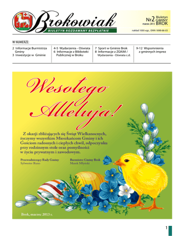 Nr2 Gminy Biuletyn marzec 2013 Brok nakład 1000 egz., ISNN 1898-86-05 w numerze: 2 Informacje Burmistrza Gminy 3 Inwestycje w Gminie 4-5 Wydarzenia - Oświata 6 Informacje z Biblioteki Publicznej w Broku 7 Sport w Gminie Brok 8 Informacje z ZGKiM / Wesołego Alleluja! Wydarzenia - Oświata c.d. 9-12 Wspomnienia z gminnych imprez Z okazji zbliżających się Świąt Wielkanocnych, życzymy wszystkim Mieszkańcom Gminy i ich Gościom radosnych i ciepłych chwil, odpoczynku przy rodzinnym stole oraz pomyślności w życiu prywatnym i zawodowym. Przewodniczący Rady Gminy Sylwester Runo Burmistrz Gminy Brok Marek Młyński Brok, marzec 2013 r. 1 Informacje Burmistrza Gminy | Inwestycje w Gminie Szanowni Mieszkańcy! szczególności takie inwestycje, na które przeznaczone są jakiekolwiek dotacje, a te nigdy nie pokrywają inwestycji w stu procentach. Poziom udziału własnego Gminy z każdym rokiem wzrasta, sięgając w wielu przypadkach 70% przedsięwzięcia. Inwestycje konieczne, nie cierpiące zwłoki czy też dające duże oszczędności wykonujemy ze środków własnych. Jeśli chodzi o infrastrukturę, to największym problemem jest stan dróg gminnych. Uporaliśmy się z oświetleniem, kilka dróg zostało wyremontowanych, ale to kropla w morzu naszych potrzeb. Możliwości w zakresie dofinansowania budowy dróg gminnych są bardzo małe. Szukamy więc oszczędności i możliwości realizacji tych przedsięwzięć ze środków własnych Gminy. Szanowni Państwo, biorąc pod uwagę to wszystko czego dokonaliśmy przez dwa lata, daje nadzieję na konstruktywną realizację planów i zamiarów, o których przeczytacie w tym wydaniu Brokowiaka. Jednocześnie zapewniam Państwa, że dołożę wszelkich starań, aby potrzeby mieszkańców były priorytetem w moich działaniach, bo to Wy Drodzy Mieszańcy jesteście dla mnie najważniejsi. Zawsze ze szczególną uwagą i pokorą wysłuchuję waszych porad, spostrzeżeń i problemów. To Wy Drodzy Mieszkańcy jesteście inicjatorami wielu moich trafnych poczynań i zamierzeń, za co serdecznie dziękuję. Starostwo Powiatowe w Ostrowi Mazowieckiej od roku 2012 prowadzi na terenie powiatu weryfikację ewidencji gruntów i budynków . Takie prace odbywają się w naszej Gminie. W związku z wieloma nieprawidłowościami wszystkie zaistniałe problemy i niedogodności proszę kierować i wyjaśniać w Starostwie Powiatowym, Wydział Geodezji, Kartografii i Gospodarki Nieruchomościami w Ostrowi Mazowieckiej, ul. 3-Maja 51 p.4; tel. (0-29) 6457130, 6457131. bom potrzebującym i starszym. Nieruchomość ta według umowy będzie przeznaczona na cele związane z prowadzeniem ośrodka wsparcia dla osób potrzebujących. W przypadku niewywiązania się podmiotu ze strony Dzierżawcy umowa zostanie rozwiązana w trybie natychmiastowym. W chwili obecnej trwają prace adaptacyjne wykonywane przez Stowarzyszenie „Kardia”. Opłaty za dzierżawę, oraz partycypacja w kosztach ogrzewania tego obiektu stanowią dodatkowy wpływ środków finansowych do budżetu gminy. W momencie zakończenia adaptacji pomieszczeń i rozpoczęcia działalności przez Stowarzyszenie „Kardia” zawarta zostanie nowa umowa dzierżawy, na podstawie której zwiększy się wpływ środków do budżetu gminy. Głównym celem opracowania tej edycji Brokowiaka jest przedstawienie Państwu szeregu informacji dotyczących naszej gminy. Mam nadzieję, że poruszone w nich tematy przeczytacie Państwo z zainteresowaniem. Nasze działania, przedsięwzięcia, plany i zamiary mają na celu poprawę jakości ż ycia w nasz ej Gminie. Robimy wszystko, aby spełniać oczekiwania Mieszkańców. Staramy się czynić to w sposób racjonalny i przejrzysty. Każdy nasz zamiar dotyczący inwestycji musi być podparty możliwością dofinansowania z zewnątrz. Uruchamiamy w Weryfikacja ewidencji gruntów i budynków Z wyrazami szacunku Burmistrz Gminy Marek Młyński Burmistrz Gminy Dzierżawa części budynku po byłym ośrodku zdrowia Gmina Brok wydzierżawiła na czas określony część nieruchomości znajdującą się na pierwszym piętrze budynku położonego w Broku przy ulicy Dąbrowskiego 6A. Gmina Brok reprezentowana przez Burmistrza Pana Marka Młyńskiego informuje, iż wydzierżawiła na czas określony tj. od 31 maja 2012 r. do 31 maja 2017 r. Stowarzyszeniu Pomocy Bezradnym „Kardia” z siedzibą: 00-578 Warszawa, ul. Stefanii Sempołowskiej 3 m. 15, wpisanym do Krajowego Rejestru Są- dowego prowadzonego przez Sąd Rejonowy dla m. st. Warszawy, XII Wydział Gospodarczy, pod nr KRS: 0000385157, REGON: 142989268; część nieruchomości znajdującą się na pierwszym piętrze budynku położonego w Broku przy ul. Dąbrowskiego 6A. Działalnością statutową stowarzyszenia jest pomoc oso- Inwestycje w Gminie Brok W 2012 roku Gmina realizowała szereg inwestycji w zakresie infrastruktury gminnej polegających na wykonaniu robót budowlanych oraz na przygotowaniu dokumentacji projektowej do celów realizacji zadań w 2013 roku i w latach następnych. Przebudowa dróg W ubiegłym roku wykonana została nawierzchnia z kostki brukowej na ul. Ostrowskiej oraz na części ul. Błotnej w Broku. Pozostała część inwestycji na ul. Błotnej wyko- 2 nana zostanie do końca kwietnia bieżącego roku. Koszt wykonania nawierzchni na tych ulicach wyniesie 409745 zł. W celu realizacji kolejnych inwestycji drogowych w Broku został opracowany Burmistrz Gminy Inwestycje w Gminie projekt przebudowy ul. Narutowicza i Pułtuskiej wraz z częścią Placu Szkolnego. Obecnie trwają również prace nad opracowaniem projektu na przebudowę ul. Wyzwolenia oraz części ul. Strażackiej i ul. Wójcickiego. W tym roku planowana jest także modernizacja drogi powiatowej w miejscowościach Laskowizna i Puzdrowizna. Gmina będzie współfinansować wykonanie tej inwestycji. Budowa sieci kanalizacji Od sierpnia 2012 r. na Placu Kościelnym w Broku budowana była sieć kanalizacji sanitarnej. Wykonawcą inwe