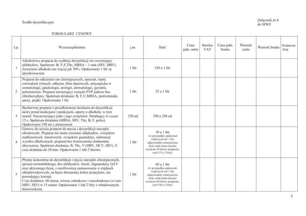 Środki dezynfekcyjne Załącznik nr 6 do SIWZ FORMULARZ