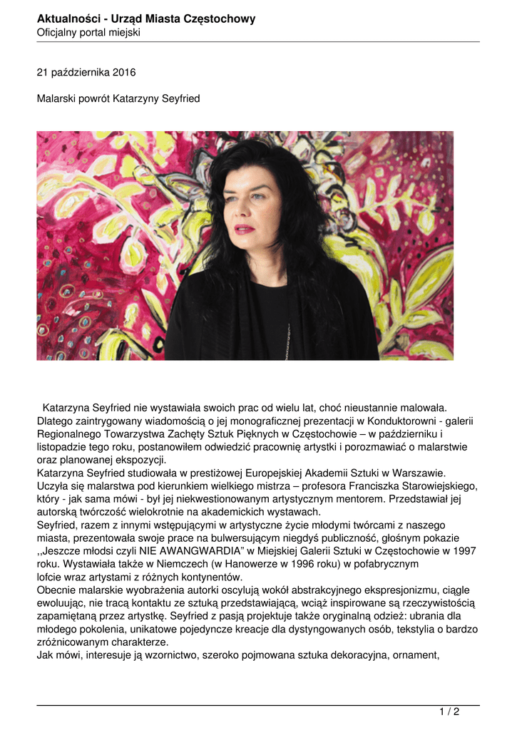 Aktualności - Urząd Miasta Częstochowy Oficjalny portal miejski 21 października 2016 Malarski powrót Katarzyny Seyfried Katarzyna Seyfried nie wystawiała swoich prac od wielu lat, choć nieustannie malowała. Dlatego zaintrygowany wiadomością o jej monograficznej prezentacji w Konduktorowni - galerii Regionalnego Towarzystwa Zachęty Sztuk Pięknych w Częstochowie – w październiku i listopadzie tego roku, postanowiłem odwiedzić pracownię artystki i porozmawiać o malarstwie oraz planowanej ekspozycji. Katarzyna Seyfried studiowała w prestiżowej Europejskiej Akademii Sztuki w Warszawie. Uczyła się malarstwa pod kierunkiem wielkiego mistrza – profesora Franciszka Starowiejskiego, który - jak sama mówi - był jej niekwestionowanym artystycznym mentorem. Przedstawiał jej autorską twórczość wielokrotnie na akademickich wystawach. Seyfried, razem z innymi wstępującymi w artystyczne życie młodymi twórcami z naszego miasta, prezentowała swoje prace na bulwersującym niegdyś publiczność, głośnym pokazie ,,Jeszcze młodsi czyli NIE AWANGWARDIA” w Miejskiej Galerii Sztuki w Częstochowie w 1997 roku. Wystawiała także w Niemczech (w Hanowerze w 1996 roku) w pofabrycznym lofcie wraz artystami z różnych kontynentów. Obecnie malarskie wyobrażenia autorki oscylują wokół abstrakcyjnego ekspresjonizmu, ciągle ewoluując, nie tracą kontaktu ze sztuką przedstawiającą, wciąż inspirowane są rzeczywistością zapamiętaną przez artystkę. Seyfried z pasją projektuje także oryginalną odzież: ubrania dla młodego pokolenia, unikatowe pojedyncze kreacje dla dystyngowanych osób, tekstylia o bardzo zróżnicowanym charakterze. Jak mówi, interesuje ją wzornictwo, szeroko pojmowana sztuka dekoracyjna, ornament, 1/2 Aktualności - Urząd Miasta Częstochowy Oficjalny portal miejski potencjał artystyczny kierunków historycznych, takich jak secesja czy Art deco dla sztuki współczesnej. Jest zakochana w niezwykłym pięknie perskich dywanów, o walorach których chętnie opowiada. Z niesłabnącym zaangażowaniem aranżuje wnętrza mieszkań i restauracji. Interesująco rozwiązała dekorację przestrzeni konsumpcyjnej kawiarni ,,Czekoladowa Nuta” w kamienicy z 1910 roku w III Alei Najświętszej Maryi Panny, w zgodzie z zewnętrzną, frontalną architekturą tego budynku. Malarstwo Katarzyny Seyfried zawiera w sobie wiele różnorodnych odniesień do magicznego świata przyrody: motywów, wzorów roślinnych, kwiatowych, są też ptaki, ryby, owoce. Przywołanie tego świata natury jest jednak tylko punktem wyjścia do kompleksowego procesu powstawania obrazu. Na początku rodzi się oryginalny szkic całości kompozycji na zwykle wielkoformatowej płaszczyźnie. Są to w większości kwadratowe podobrazia o wymiarach nieprzekraczających wielkości dwa na dwa metry. W rozmowie częstochowska artystka stwierdza: - (...) Inspiracją dla kolejnej pracy staje się nowy, wymyślony, przetworzony czy przypomniany motyw jakiegoś ornamentu czy jego uwspółcześniona wizja. Początkiem dla niej jest biologiczna podstawowa forma, której kształt wpisuję w rozważaną kompozycję. Później skupiam się na kolorycie i tonacji obrazu, ale także na fragmentach i detalach. Ciągle intuicyjnie zagęszczam przedstawienie malarskie. Moja wyobraźnia przywołuje elementy związane ze zdobnictwem różnych kultur, nawet tych archaicznych. Malując, mam niedosyt dekoracji - jest we mnie uwielbienie dla mozaiki, dla złotej ornamentyki. Czuję się o wiele lepiej, gdy pracuję na dużej powierzchni podobrazia. Daje mi ona większą artystyczną wolność i ekspresję działania. Jestem bardziej szczęśliwa zmagając się z materią koloru(...). Katarzyna Seyfried w swoim malarskim myśleniu bliska jest fowistom. Jednak swoista powtarzalność motywu oraz obfita pasta reliefowej faktury malatury czyni jej kolorystyczne wyobrażenia unikalnymi przez dominującą sensualność znakowej umowności użytych środków artystycznej wypowiedzi. Olbrzymi witalizm ekspresji formy i koloru jej malarskiej twórczości jest rozpoznawalny niemal natychmiast - czyniąc sztukę Katarzyny Seyfried wyjątkową i niepowtarzalną w tym niezwykle zaskakującym nasze przyzwyczajenia wyrazie. Marian Panek Pozostałe aktualności 2/2 Powered by TCPDF (www.tcpdf.org)