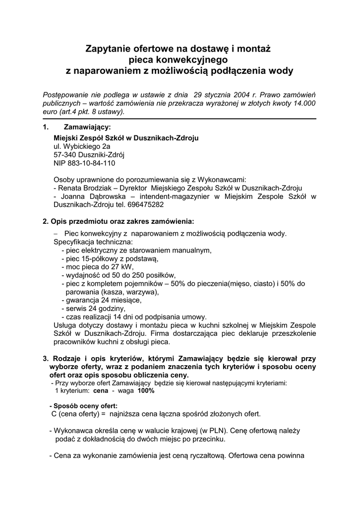 Zapytanie ofertowe na dostawę i montaż pieca konwekcyjnego z naparowaniem z możliwością podłączenia wody Postępowanie nie podlega w ustawie z dnia 29 stycznia 2004 r. Prawo zamówień publicznych – wartość zamówienia nie przekracza wyrażonej w złotych kwoty 14.000 euro (art.4 pkt. 8 ustawy). 1. Zamawiający: Miejski Zespół Szkół w Dusznikach-Zdroju ul. Wybickiego 2a 57-340 Duszniki-Zdrój NIP 883-10-84-110 Osoby uprawnione do porozumiewania się z Wykonawcami: - Renata Brodziak – Dyrektor Miejskiego Zespołu Szkół w Dusznikach-Zdroju - Joanna Dąbrowska – intendent-magazynier w Miejskim Zespole Szkół w Dusznikach-Zdroju tel. 696475282 2. Opis przedmiotu oraz zakres zamówienia: − Piec konwekcyjny z naparowaniem z możliwością podłączenia wody. Specyfikacja techniczna: - piec elektryczny ze starowaniem manualnym, - piec 15-półkowy z podstawą, - moc pieca do 27 kW, - wydajność od 50 do 250 posiłków, - piec z kompletem pojemników – 50% do pieczenia(mięso, ciasto) i 50% do parowania (kasza, warzywa), - gwarancja 24 miesiące, - serwis 24 godziny, - czas realizacji 14 dni od podpisania umowy. Usługa dotyczy dostawy i montażu pieca w kuchni szkolnej w Miejskim Zespole Szkół w Dusznikach-Zdroju. Firma dostarczająca piec deklaruje przeszkolenie pracowników kuchni z obsługi pieca. 3. Rodzaje i opis kryteriów, którymi Zamawiający będzie się kierował przy wyborze oferty, wraz z podaniem znaczenia tych kryteriów i sposobu oceny ofert oraz opis sposobu obliczenia ceny. - Przy wyborze ofert Zamawiający będzie się kierował następującymi kryteriami: 1 kryterium: cena - waga 100% - Sposób oceny ofert: C (cena oferty) = najniższa cena łączna spośród złożonych ofert. - Wykonawca określa cenę w walucie krajowej (w PLN). Cenę ofertową należy podać z dokładnością do dwóch miejsc po przecinku. - Cena za wykonanie zamówienia jest ceną ryczałtową. Ofertowa cena powinna obejmować wynagrodzenie za wszystkie obowiązki przyszłego Wykonawcy, niezbędne do realizacji zamówienia. - Wykonawca musi przewidzieć wszystkie okoliczności, które mogą wpłynąć na cenę zamówienia. W związku z powyższym zaleca się dokładną analizę opisu przedmiotu zamówienia. 4. Termin i miejsce realizacji zamówienia: • Miejsce realizacji zamówienia: Miejski Zespół Szkół w Dusznikach-Zdroju Stołówka szkolna ul. Sprzymierzonych 6a 57-340 Duszniki-Zdrój Termin realizacji zamówienia: 14 dni od podpisania umowy 5. Miejsce, sposób i termin składania ofert. Oferty należy złożyć w zamkniętej kopercie (zapieczętowanej w sposób gwarantujący zachowanie w poufności jej treść oraz zabezpieczającej jej nienaruszalność) w Miejskim Zespole Szkół w Dusznikach-Zdroju, ul. Wybickiego 2a w terminie do 02.10.2015 do godziny 12.00 z dopiskiem: Dostawa pieca konwekcyjnego. Oferty, które wpłyną do Miejskiego Zespołu Szkół w Dusznikach-Zdroju po wyznaczonym terminie składania ofert nie będą rozpatrzone. 6. Opis warunków udziału w postępowaniu: O zamówienie może ubiegać się wykonawca, który: − posiada uprawnienia do wykonywania określonej działalności lub czynności, jeżeli ustawy nakładają obowiązek posiadania takich uprawnień. Oferta musi być podpisana przez osobę upoważnioną do reprezentowania firmy, zgodnie z formą reprezentacji oferenta określoną w rejestrze handlowym lub innym dokumencie właściwym dla formy organizacji firmy oferenta. Oferta musi zawierać następujące dokumenty: Ofertę cenową – zał. nr 1 7. Rozstrzygniecie postępowania i zlecenie realizacji zamówienia Postępowanie ofertowe zostanie rozstrzygnięte w dniu 05.10.2015 r. do godz. 15.00. W ciągu trzech dni od dokonania wyboru Zamawiający prześle informację do podmiotu wybranego zlecenie realizacji zamówienia. W przypadku gdy Wykonawca, którego oferta została wybrana, uchyla się od wykonania zamówienia, Zamawiający wybierze ofertę najkorzystniejszą spośród pozostałych ofert. 8. Pozostałe informacje - W uzasadnionych wypadkach Zamawiający może, przed upływem terminu składania ofert, zmienić zapytanie ofertowe. Zmienione zapytanie ofertowe Zamawiający niezwłocznie przekaże wszystkim potencjalnym Wykonawcą, którym przekazał zapytanie ofertowe. - Jeżeli w wyniku zmiany treści zapytania ofertowego niezbędny jest dodatkowy czas na wprowadzenie zmian w ofertach, Zamawiający może przedłużyć termin składania ofert. - W toku badania i oceny ofert Zamawiający może żądać od potencjalnych Wykonawców wyjaśnień dotyczących treści złożonych ofert. - Zamawiający poprawi omyłki rachunkowe w ofercie polegające na nieprawidłowym wyliczeniu kwoty wynagrodzenia. - Zamawiający zamyka postępowanie bez zawarcia umowy jeżeli: a. nie została złożona żadna oferta, b. żadna ze złożonych ofert nie odpowiada wymaganiom stawianym przez Zamawiającego, c. cena najkorzystniejszej oferty przewyższa kwotę, którą Zamawiający może przeznaczyć na sfinansowanie zamówienia, d. stwierdzono zaistnienie okoliczności, które powodują, że zawarcie umowy nie leży w interesie Zamawiającego. - Zamawiający zastrzega sobie możliwość dokonywania zmian zawartej umowy pod warunkiem zawarcia przez obie jej strony pisemnego aneksu. Załącznik nr 1 O F E R T A: Ja/My niżej podpisani ................................................................................................................................................................... z siedzibą:............................................................................................................................................ składam/y niniejszą ofertę na dostawę i montaż pieca konwekcyjnego z naparowaniem zgodnie z zapytaniem ofertowym z dnia 29.09.2015 r. za cenę netto: ........................................... zł, plus podatek VAT .................................... zł tj. cena brutto ....................................