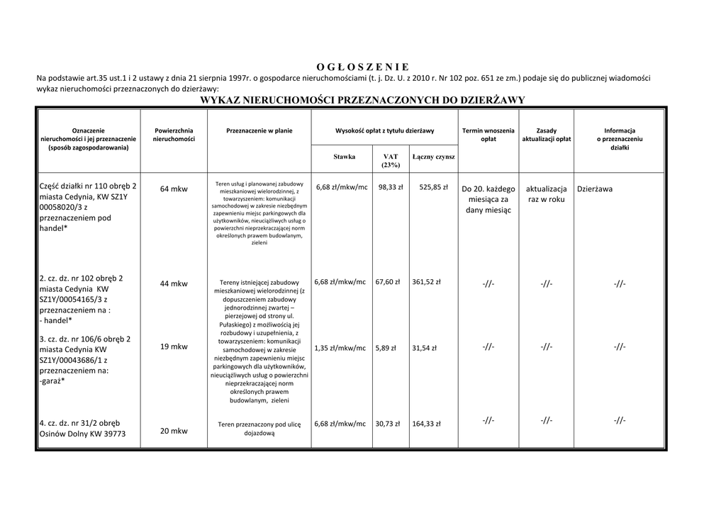OGŁOSZENIE Na podstawie art.35 ust.1 i 2 ustawy z dnia 21 sierpnia 1997r. o gospodarce nieruchomościami (t. j. Dz. U. z 2010 r. Nr 102 poz. 651 ze zm.) podaje się do publicznej wiadomości wykaz nieruchomości przeznaczonych do dzierżawy: WYKAZ NIERUCHOMOŚCI PRZEZNACZONYCH DO DZIERŻAWY Oznaczenie nieruchomości i jej przeznaczenie (sposób zagospodarowania) Powierzchnia nieruchomości Przeznaczenie w planie Wysokość opłat z tytułu dzierżawy Stawka Część działki nr 110 obręb 2 miasta Cedynia, KW SZ1Y 00058020/3 z przeznaczeniem pod handel* 2. cz. dz. nr 102 obręb 2 miasta Cedynia KW SZ1Y/00054165/3 z przeznaczeniem na : - handel* 3. cz. dz. nr 106/6 obręb 2 miasta Cedynia KW SZ1Y/00043686/1 z przeznaczeniem na: -garaż* 4. cz. dz. nr 31/2 obręb Osinów Dolny KW 39773 64 mkw 44 mkw 19 mkw 20 mkw Teren usług i planowanej zabudowy mieszkaniowej wielorodzinnej, z towarzyszeniem: komunikacji samochodowej w zakresie niezbędnym zapewnieniu miejsc parkingowych dla użytkowników, nieuciążliwych usług o powierzchni nieprzekraczającej norm określonych prawem budowlanym, zieleni 6,68 zł/mkw/mc VAT (23%) Łączny czynsz 98,33 zł 525,85 zł Termin wnoszenia opłat Zasady aktualizacji opłat Do 20. każdego miesiąca za dany miesiąc aktualizacja raz w roku Informacja o przeznaczeniu działki Dzierżawa 6,68 zł/mkw/mc Tereny istniejącej zabudowy mieszkaniowej wielorodzinnej (z dopuszczeniem zabudowy jednorodzinnej zwartej – pierzejowej od strony ul. Pułaskiego) z możliwością jej rozbudowy i uzupełnienia, z towarzyszeniem: komunikacji 1,35 zł/mkw/mc samochodowej w zakresie niezbędnym zapewnieniu miejsc parkingowych dla użytkowników, nieuciążliwych usług o powierzchni nieprzekraczającej norm określonych prawem budowlanym, zieleni 67,60 zł 361,52 zł -//- -//- -//- 5,89 zł 31,54 zł -//- -//- -//- 6,68 zł/mkw/mc 30,73 zł 164,33 zł -//- -//- -//- Teren przeznaczony pod ulicę dojazdową 37/97 z przeznaczeniem pod: - handel* 5. cz. dz. nr 356 o obręb 2 miasta Cedynia KW z przeznaczeniem pod place* 100 mkw Istniejące i planowane tereny lasów 0,23 zł/mkw/mc 5,29 zł 28,29 zł -//- -//- -//- *Szczegóły zostaną określone w umowie dzierżawy. Cena nieruchomości, wysokość stawek procentowych opłat z tytułu użytkowania wieczystego, termin do złożenia wniosku przez osoby, którym przysługuje pierwszeństwo w nabyciu nieruchomości na podstawie art. 34 ust.1 pkt 1 i pkt 2, termin zagospodarowania – NIE DOTYCZY Szczegółowe informacje o nieruchomości można uzyskać w siedzibie Urzędu Miejskiego w Cedyni, Plac Wolności 1, pok. 8, tel. 431 78 06. Cedynia, dnia 10 marca 2014 r. BURMISTRZ mgr Adam Zarzycki