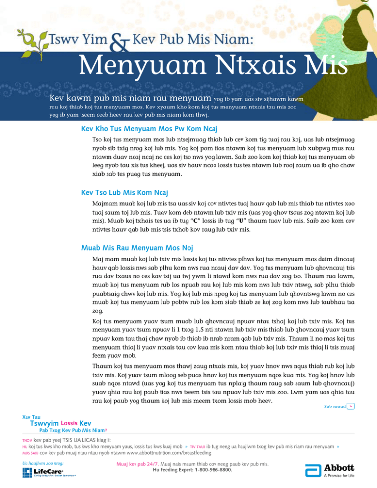 Menyuam Ntxais Mis Kev kawm pub mis niam rau menyuam yog ib yam uas siv sijhawm kawm rau koj thiab koj tus menyuam mos. Kev xyaum kho kom koj tus menyuam ntxais tau mis zoo yog ib yam tseem ceeb heev rau kev pub mis niam kom thwj. Kev Kho Tus Menyuam Mos Pw Kom Ncaj Tso koj tus menyuam mos lub ntsejmuag thiab lub cev kom tig tuaj rau koj, uas lub ntsejmuag nyob sib txig nrog koj lub mis. Yog koj pom tias ntawm koj tus menyuam lub xubpwg mus rau ntawm duav ncaj ncaj no ces koj tso nws yog lawm. Saib zoo kom koj thiab koj tus menyuam ob leeg nyob tau xis tus kheej, uas siv hauv ncoo lossis tus tes ntawm lub rooj zaum ua ib qho chaw xiab sab tes puag tus menyuam. Kev Tso Lub Mis Kom Ncaj Majmam muab koj lub mis tsa uas siv koj cov ntivtes tuaj hauv qab lub mis thiab tus ntivtes xoo tuaj saum toj lub mis. Tuav kom deb ntawm lub txiv mis (uas yog qhov tsaus zog ntawm koj lub mis). Muab koj txhais tes ua ib tug “C” lossis ib tug “U” thaum tuav lub mis. Saib zoo kom cov ntivtes hauv qab lub mis tsis txhob kov raug lub txiv mis. Muab Mis Rau Menyuam Mos Noj Maj mam muab koj lub txiv mis lossis koj tus ntivtes plhws koj tus menyuam mos daim dincauj hauv qab lossis nws sab plhu kom nws rua ncauj dav dav. Yog tus menyuam lub qhovncauj tsis rua dav txaus no ces kav tsij ua twj ywm li ntawd kom nws rua dav zog tso. Thaum rua lawm, muab koj tus menyuam rub los npuab rau koj lub mis kom nws lub txiv ntswg, sab plhu thiab puabtsaig chwv koj lub mis. Yog koj lub mis npog koj tus menyuam lub qhovntswg lawm no ces muab koj tus menyuam lub pobtw rub los kom siab thiab ze koj zog kom nws lub taubhau tsa zog. Koj tus menyuam yuav tsum muab lub qhovncauj npuav ntau tshaj koj lub txiv mis. Koj tus menyuam yuav tsum npuav li 1 txog 1.5 nti ntawm lub txiv mis thiab lub qhovncauj yuav tsum npuav kom tau thaj chaw nyob ib thiab ib nrab nram qab lub txiv mis. Thaum li no mas koj tus menyuam thiaj li yuav ntxais tau cov kua mis kom ntau thiab koj lub txiv mis thiaj li tsis muaj feem yuav mob. Thaum koj tus menyuam mos thawj zaug ntxais mis, koj yuav hnov nws nqus thiab rub koj lub txiv mis. Koj yuav tsum mloog seb puas hnov koj tus menyuam nqos kua mis. Yog koj hnov lub suab nqos ntawd (uas yog koj tus menyuam tus nplaig thaum raug sab saum lub qhovncauj) yuav qhia rau koj paub tias nws tseem tsis tau npuav lub txiv mis zoo. Lwm yam uas qhia tau rau koj paub yog thaum koj lub mis meem txom lossis mob heev. Sab nraud Xav Tau Tswvyim Lossis Kev Pab Txog Kev Pub Mis Niam ? Thov kev pab yeej TSIS UA LICAS kiag li: koj tus kws kho mob, tus kws kho menyuam yaus, lossis tus kws kuaj mob » Tiv tauj ib tug neeg ua haujlwm txog kev pub mis niam rau menyuam » Mus saib cov kev pab muaj ntau ntau nyob ntawm www.abbottnutrition.com/breastfeeding Hu Ua haujlwm zoo nrog: Muaj kev pab 24/7. Muaj nais maum thiab cov neeg paub kev pub mis. Hu Feeding Expert: 1-800-986-8800. » o Tswv Yim & Kev Pub Mis Niam: Menyuam Ntxais Mis Hloov Sab Mis Muab koj tus menyuam hloov noj sab mis txawv ntawm sab uas koj xub pib nrog vim hais tias koj tus menyuam yuav txawj ntxais sab uas xub pib siv ntawd tshaj. Yog koj tus menyuam tsis kam noj lwm sab ntawd lossis noj tagnrho cov kua mis lawm, ho pib nrog sab ntawd thaum koj rov pub dua mis niam. Thaum Tshem Tus Menyuam Ntawm Lub Txiv Mis Yog tias koj yuav tau muab tus menyuam hloov chaw thaum pub mis kom nws ntxais tau zoo zog no, ua zoo muab koj ib tug ntivtes ntxig rau tom kaum ncauj kom nws tsis txhob ntxais tau lawm. Qhov no yuav pab kom koj lub txiv mis tsis txhob raug mob. Tsis txhob tas kev cia siab vim hais tias yeej yuav siv ntau zaus sim mas thiaj li tso tau tus menyuam kom nyob zoo chaw thiab npuav zoo. Ob txoj kev tshem tus menyuam ntawm lub txiv mis ntxiv ces yog majmam rua nws lub puabtsaig lossis nias lub mis ntawm qhov chaw uas ze tus menyuam lub qhov ncaj tshaj. Xav Tau Tswvyim Lossis Kev Pab Txog Kev Pub Mis Niam ? Thov ° kev pab yeej TSIS UA LICAS kiag li: koj tus kws kho mob, tus kws kho menyuam yaus, lossis tus kws kuaj mob » Tiv tauj ib tug neeg ua haujlwm txog kev pub mis niam rau menyuam » Mus saib cov kev pab muaj ntau ntau nyob ntawm www.abbottnutrition.com/breastfeeding Hu ©2011 Abbott Laboratories Inc. Ib Hlis 2011 73152 Hmong – Latching On