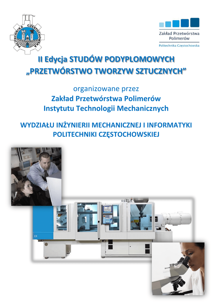 II Edycja STUDÓW PODYPLOMOWYCH „PRZETWÓRSTWO TWORZYW SZTUCZNYCH” organizowane przez Zakład Przetwórstwa Polimerów Instytutu Technologii Mechanicznych WYDZIAŁU INŻYNIERII MECHANICZNEJ I INFORMATYKI POLITECHNIKI CZĘSTOCHOWSKIEJ Szanowni Państwo ! Zakład Przetwórstwa Polimerów, Instytut Technologii Mechanicznych Politechniki Częstochowskiej serdecznie zaprasza do udziału w STUDIACH PODYPLOMOWYCH „Przetwórstwo Tworzyw Sztucznych” Cel studiów Dynamiczny rozwój branży tworzyw sztucznych oraz lokowanie na terenie Polski nowych zakładów europejskich koncernów wytwarzających na potrzeby przemysłu AGD, samochodowego i maszynowego elementy z tworzyw sztucznych powoduje duże zapotrzebowanie na wykształconą kadrę inżynierską. Celem studiów jest poszerzenie wiedzy oraz doskonalenie umiejętności w zakresie szeroko pojętego przetwórstwa tworzyw sztucznych, wdrażania nowoczesnych technologii oraz pracy z wykorzystaniem nowoczesnych maszyn i urządzeń peryferyjnych. Przyswojenie wiedzy z zakresu fizykochemii polimerów, ich właściwości oraz podstaw przetwórstwa daje niezbędne podstawy do dalszego doskonalenia umiejętności podczas sterowania i nadzorowania technologii przetwórstwa oraz radzenia sobie z problemami w realnych warunkach przemysłowych. Zakres tematyczny Zakres tematyczny prowadzonych studiów podyplomowych dotyczył będzie podstaw nauki o tworzywach polimerowych ich właściwościach, stosowaniu, przetwarzaniu i obróbce. Omówione będą fizyczno-chemiczne podstawy procesów przetwórstwa tworzyw. Program studiów będzie również dotyczył konstrukcji narzędzi. Zajęcia praktyczne będą prowadzone w laboratoriach Instytutu, w których słuchacze zapoznają się z działaniem i obsługą nowoczesnych maszyn i urządzeń przetwórczych. Podczas zajęć w laboratoriach zapoznają się również z metodami oceny właściwości fizycznych oraz struktury wyrobów z tworzyw polimerowych pod kątem ich jakości. W ramach ćwiczeń laboratoryjnych poznają podstawowe oraz zaawansowane metody badań właściwości tworzyw z wykorzystaniem urządzeń do analizy termicznej DSC (różnicowa kalorymetria skaningowa) i DMTA (dynamiczna analiza mechaniczna). W porozumieniu z firmą NETZSCH Thermal Analysis wszyscy słuchacze biorący udział w zajęciach otrzymają certyfikat świadczący o umiejętności obsługi w/w urządzeń i analizy otrzymanych wyników badań. Sylwetka absolwenta Studia podyplomowe w specjalności PRZETWÓRSTWO TWORZYW SZTUCZNYCH mają na celu przygotowanie kadry inżynierskiej do realizacji coraz trudniejszych zadań w procesach przetwórstwa tworzyw sztucznych. Po zakończeniu studiów i uzyskaniu dyplomu absolwenci uzyskają wiedzę i umiejętności z szeroko pojętego zakresu procesów przetwórstwa tworzyw polimerowych, które są wykorzystywane w dynamicznie rozwijającym się przemyśle. Podniesienie kompetencji absolwentów kończących studia pozwoli na lepsze wykorzystanie wiedzy w firmie, w której już pracują lub na związanie swojej przyszłości z firmą przetwarzającą tworzywa. Na rynku pracy mało jest specjalistów z tej dziedziny stąd ogromna popularność kierunków i specjalności z nią związanych. Program zajęć Program studiów obejmuje 195 godzin dydaktycznych zajęć. Zajęcia podzielone są na wykłady, zajęcia laboratoryjne i projektowe. W ramach studiów student realizuje pracę dyplomową pod kierunkiem promotora. Studia trwają 2 semestry i będą prowadzone w systemie studiów niestacjonarnych. Zajęcia będą odbywały się co dwa tygodnie w godzinach od 9.00-18.00 (sobota) i od 9.00 do 13.00 (niedziela). Przewidujemy następującą tematykę zajęć: Budowa, struktura i właściwości tworzyw sztucznych Wybrane zagadnienia z fizykochemii polimerów Technologie przetwórstwa i obróbki tworzyw Maszyny i urządzenia do przetwórstwa tworzyw Narzędzia do przetwórstwa tworzyw Symulacje procesów przetwórstwa CAE i ich analiza (MoldFlow, 3dMoldex) Regeneracja i recykling tworzyw sztucznych Badania i kontrola jakości materiałów i wyrobów z tworzyw Praca dyplomowa Jeśli będzie taka potrzeba będziemy elastycznie reagować na Państwa sugestie co do szczegółowego planu studiów i poszerzania wybranej tematyki. Dokumenty wymagane do przyjęcia na studia • wniosek o przyjęcie na studia podyplomowe i kwestionariusz osobowy, • kserokopia dowodu osobistego, • zgoda na przetwarzanie danych osobowych i ich gromadzenie (ksero dowodu), • dowód wpłaty za postępowanie kwalifikacyjne 80 zł, • odpis dyplomu ukończenia studiów wyższych (magisterskich, inżynierskich lub licencjatu), Termin rozpoczęcia studiów: Termin zakończenia studiów: Koszt studiów (2 semestry): marzec 2012 marzec 2013 4 600,00zł Informacje i zapisy: Sekretariat Zakładu Przetwórstwa Polimerów Politechnika Częstochowska Al. Armii Krajowej 19C, 42-200 Częstochowa Tel/fax.: 34 3250659 Tel.: 34 3250539 e-mail: [email protected] [email protected] ZADZWOŃ JUŻ TERAZ LICZBA MIEJSC OGRANICZONA Partner medialny: Partnerzy przemysłowi: