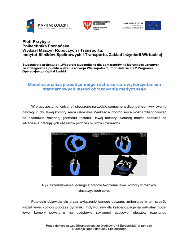 Piotr Przybyła Politechnika Poznańska Wydział Maszyn Roboczych i Transportu, Instytut Silników Spalinowych i Transportu, Zakład Inżynierii Wirtualnej Stypendysta projektu pt. „Wsparcie stypendialne dla doktorantów na kierunkach uznanych za strategiczne z punktu widzenia rozwoju Wielkopolski”, Poddziałanie 8.2.2 Programu Operacyjnego Kapitał Ludzki Modalna analiza przestrzennego ruchu serca z wykorzystaniem standardowych metod obrazowania medycznego W pracy zostanie opisane i stworzone narzędzie pomocne w diagnostyce i wykrywaniu patologii ruchu lewej komory serca człowieka. Większość chorób serca można zdiagnozować na podstawie zmiennej geometrii kształtu lewej komory. Komorę można podzielić na kilkanaście pracujących obszarów podczas skurczu i rozkurczu. Rys. Przedstawienie jednego z etapów tworzenia lewej komory w różnych płaszczyznach serca Patologie objawiają się przez wyłączenie danego obszaru, zmieniając w ten sposób kształt lewej komory podczas dynamiki. Indywidualny dla każdego pacjenta wirtualny model lewej komory powstanie na podstawie sekwencji czasowej obrazów rezonansu Praca doktorska współfinansowana ze środków Unii Europejskiej w ramach Europejskiego Funduszu Społecznego magnetycznego, a następnie porównany z modelem idealnym, odzwierciedlającym poprawną dynamikę serca, a następnie poddany zaawansowanej filtracji opartej o metody niskowymiarowe. W ten sposób cała aktywność serca sprowadzona zostaje do kilku tzw. „modów” i odpowiadających im przebiegów amplitudy w czasie, dzięki której będzie można określić który z obszarów jest wyłączony z działania i jednocześnie zdiagnozować chorobę pacjenta. Ten kierunek działania jest współbieżny z najnowszymi, spotykanymi w medycynie trendami. Rys.2 nałożenie I modu na „średnią” geometrię serca Stworzone w ten sposób narzędzie może znacznie przyspieszyć diagnozowanie pacjentów ze schorzeniami serca. Modele trójwymiarowe ułatwiają rozpoznawanie patologii, a analiza POD wychwytuje najmniejsze odchylenia od norm w zachowaniu się lewej komory. Docelowo powstanie program działający na zasadzie czarnej skrzynki, który na wejściu otrzymuje badanie z rezonansu magnetycznego, natomiast wynikiem będzie model trójwymiarowy z zaznaczeniem dysfunkcyjnych obszarów lewej komory serca. Implementacja programu do placówek zajmujących się chorobami serca znacznie skróci czas diagnozy pacjenta oraz pozwoli na uniknięcie hospitalizacji i dodatkowych, kosztownych i uciążliwych badań, jednocześnie zwiększając komfort psychiczny pacjentów. Narzędzie to powstaje we współpracy z lekarzami szpitala kardiologicznego Przemienienia Pańskiego przy ulicy Długiej w Poznaniu. Praca doktorska współfinansowana ze środków Unii Europejskiej w ramach Europejskiego Funduszu Społecznego