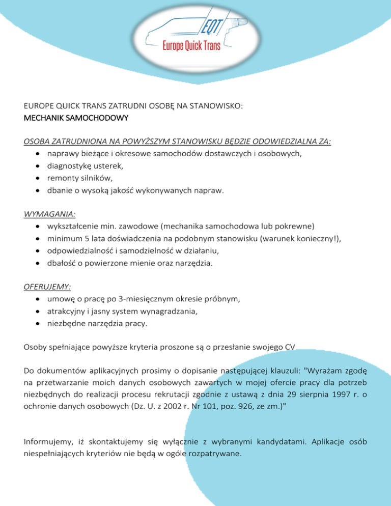 EUROPE QUICK TRANS ZATRUDNI OSOBĘ NA STANOWISKO: MECHANIK SAMOCHODOWY OSOBA ZATRUDNIONA NA POWYŻSZYM STANOWISKU BĘDZIE ODOWIEDZIALNA ZA: naprawy bieżące i okresowe samochodów dostawczych i osobowych, diagnostykę usterek, remonty silników, dbanie o wysoką jakość wykonywanych napraw. WYMAGANIA: wykształcenie min. zawodowe (mechanika samochodowa lub pokrewne) minimum 5 lata doświadczenia na podobnym stanowisku (warunek konieczny!), odpowiedzialność i samodzielność w działaniu, dbałość o powierzone mienie oraz narzędzia. OFERUJEMY: umowę o pracę po 3-miesięcznym okresie próbnym, atrakcyjny i jasny system wynagradzania, niezbędne narzędzia pracy. Osoby spełniające powyższe kryteria proszone są o przesłanie swojego CV Do dokumentów aplikacyjnych prosimy o dopisanie następującej klauzuli: "Wyrażam zgodę na przetwarzanie moich danych osobowych zawartych w mojej ofercie pracy dla potrzeb niezbędnych do realizacji procesu rekrutacji zgodnie z ustawą z dnia 29 sierpnia 1997 r. o ochronie danych osobowych (Dz. U. z 2002 r. Nr 101, poz. 926, ze zm.)" Informujemy, iż skontaktujemy się wyłącznie z wybranymi kandydatami. Aplikacje osób niespełniających kryteriów nie będą w ogóle rozpatrywane. Europe Quick Trans ul. Przewóz 2 30-716 Kraków Tel. – 012 397-10-71 Mobile +48 796 42-42-42 Fax – 012 397-10-72 NIP: 679-268-06-85