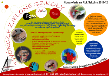 N O Awrartsztaty EL Foto grafia Taniec I i teatr Twórcza Zielona Szko³a pozwala prze¿yæ Nie ma nic cenniejszego dla m³odych ludzi, jak odkrywanie i rozwijanie swych pasji. Jeœli przy okazji pozwolimy im na odrobinê ciekawej zabawy to sukces bêdzie pe³ny! W T Z C E R ZI Ó Nowa oferta na Rok Szkolny 2011-12 K Z O S L Y E Podczas ka¿dego wyjazdu zapewniamy: - Autorski „szyty na miarê” program artystyczno-edukacyjny - Niezbêdne materia³y - min. 2 art.-edukatorów Stowarzyszenia Aletheia, którzy s³u¿¹ opiek¹ wychowawcz¹ przez 24h - Zakwaterowanie + 3 posi³ki - Materia³y pami¹tkowe - Ubezpieczenie NNW oraz Fachow¹ pomoc na ka¿dym etapie realizacji projektu!!! Szczegó³owe informacje: www.aletheia-art.pl, Tworzymy kompleksow¹ ofertê, zawsze dostosowan¹ do indywidualnych oczekiwañ i potrzeb. 5 niezapomnianych dni w zacisznej, malowniczej okolicy, podczas których uczestnicy poznaj¹ jak wyra¿aæ sw¹ osobowoœæ poprzez muzykê, taniec, fotografiê, sztuki plastyczne lub dzia³ania filmowo- teatralne. Organizujemy wyjazdy do malowniczo po³o¿onych zak¹tków, gdzie mo¿na aktywnie i ciekawie odpocz¹æ m.in.do Mszany Dolnej, Zakrzowa, Lubogoszczy. j e z c r Twó i j c a k u Sowarzyszenie Ed EIA H T ALE 721 831 995, [email protected], Zapraszamy do wspó³pracy!!! Z C E R ZI Ó EL W T N O Nowa oferta na Rok Szkolny 2011-12 K Z O S L Y E Foto Kto nie marzy, aby zostaæ piosenkarzem, tancerzem o aktorstwie nie wspominaj¹c?! Zajêcia prowadz¹ tylko wykwalifikowani instruktorzy Przez 5 dni poznajemy œwiat widziany okiem obiektywu aparatu i kamery cyfrowej. Program dostosowany jest do wieku i mo¿liwoœci Uczestników Istnieje mo¿liwoœæ ³¹czenia ro¿nych warsztatów podczas jednego wyjazdu Uczymy siê podstaw: - prawid³owej kompozycji i oœwietlenia, - wykonywania zdjêæ portretowych, sytuacyjnych, architektury i pejza¿u, - tworzenia scenariusza filmowego, - re¿yserii oraz monta¿u filmu. Ale przede wszystkim fantastycznie siê bawimy podczas: pozowania, podgl¹dania, przebierania i odgrywania ról! W trakcie Twórczych Zielonych Szkó³ organizujemy równie¿: - wycieczki po Krakowie, - spotkania z goœæmi, - wieczory teatralne. Szczegó³owe informacje: www.aletheia-art.pl, I i teatr Podczas warsztatów wykorzystujemy naturaln¹ ekspresjê, potrzebê ruchu i zabawy. Doskonalimy umiejêtnoœci wokalne oraz taneczne, pracujemy nad dykcj¹, wyczuciem rytmu i œwiadomoœci¹ sceny. To trzeba po prostu prze¿yæ samemu!!! Oswajamy siê z codziennym ¿yciem gwiazd: ciê¿k¹ prac¹, trem¹ i Ka¿dego dnia pozwalamy ponieœæ siê twórczym uniesieniom i emocjom - maluj¹c, rysuj¹c, lepi¹c, klej¹c i wycinaj¹c. Projektujemy dzia³a z przedziwnych materia³ów, których nie powstydzi³by siê najlepszy artysta. Tworzymy obrazy, rzeŸby, collage, witra¿e, decupage, happeningi i instalacje. Uwalniamy nasz¹ kreatywnoœæ i pozwalamy wyobraŸni w pe³ni siê rozwin¹æ!!! aty warszt Art Taniec radoœci¹ wystêpów! Zajmujemy siê wszystkimi sprawami organizacyjnymi!!! Prowadzimy wyjazdy przez ca³y Rok Szkolny niezale¿nie od pogody!!! Ceny ju¿ od 400z³/os!!! j e z c r Twó i j c a k u Sowarzyszenie Ed EIA H T ALE 721 831 995, [email protected], Zapraszamy do wspó³pracy!!!