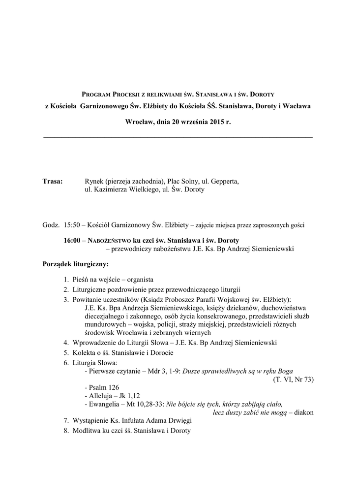 PROGRAM PROCESJI Z RELIKWIAMI ŚW. STANISŁAWA I ŚW. DOROTY z Kościoła Garnizonowego Św. Elżbiety do Kościoła ŚŚ. Stanisława, Doroty i Wacława Wrocław, dnia 20 września 2015 r. ___________________________________________________________________________ Trasa: Rynek (pierzeja zachodnia), Plac Solny, ul. Gepperta, ul. Kazimierza Wielkiego, ul. Św. Doroty Godz. 15:50 – Kościół Garnizonowy Św. Elżbiety – zajęcie miejsca przez zaproszonych gości 16:00 – NABOŻEŃSTWO ku czci św. Stanisława i św. Doroty – przewodniczy nabożeństwu J.E. Ks. Bp Andrzej Siemieniewski Porządek liturgiczny: 1. Pieśń na wejście – organista 2. Liturgiczne pozdrowienie przez przewodniczącego liturgii 3. Powitanie uczestników (Ksiądz Proboszcz Parafii Wojskowej św. Elżbiety): J.E. Ks. Bpa Andrzeja Siemieniewskiego, księży dziekanów, duchowieństwa diecezjalnego i zakonnego, osób życia konsekrowanego, przedstawicieli służb mundurowych – wojska, policji, straży miejskiej, przedstawicieli różnych środowisk Wrocławia i zebranych wiernych 4. Wprowadzenie do Liturgii Słowa – J.E. Ks. Bp Andrzej Siemieniewski 5. Kolekta o śś. Stanisławie i Dorocie 6. Liturgia Słowa: - Pierwsze czytanie – Mdr 3, 1-9: Dusze sprawiedliwych są w ręku Boga (T. VI, Nr 73) - Psalm 126 - Alleluja – Jk 1,12 - Ewangelia – Mt 10,28-33: Nie bójcie się tych, którzy zabijają ciało, lecz duszy zabić nie mogą – diakon 7. Wystąpienie Ks. Infułata Adama Drwięgi 8. Modlitwa ku czci śś. Stanisława i Doroty 2 9. Porządek PROCESJI – Ks. Proboszcz Prałat płk Janusz Radzik (godz. 16.25) - krzyż - lampiony - poczty sztandarowe - orkiestra wojskowa - siostry zakonne - LSO - klerycy - kapłani - Ksiądz Biskup - RELIWIE - wierni 10. Wyjście procesji: pieśń na wyjście (organista), gra orkiestra wojskowa 11. Relikwie z kościoła wynoszą księża 12. Procesja - Relikwie niosą: - kapłani diecezjalni i zakonni - siostry zakonne - podchorążowie z WSOWZ 13. Ok. godz. 17-tej rozpoczęcie MSZY ŚWIĘTEJ KONCELEBROWANEJ pod przewodnictwem J.E. Ks. Biskupa Andrzeja Siemieniewskiego (kapłani ubierają się w zakrystii, w tym czasie śpiewamy pieśni) - Kazanie - Modlitwa wiernych – diakon - Zakończenie uroczystości – Ks. Proboszcz Andrzej Brodawka - Błogosławieństwo 14. Agapa dla duchowieństwa i zaproszonych gości Kolor szat liturgicznych: złoty Formularz mszalny oraz czytania z 25 Niedzieli Zwykłej Prefacja Nr 33 (Prefacja na niedziele zwykłe – Zadatek wieczystej paschy) II Modlitwa Eucharystyczna