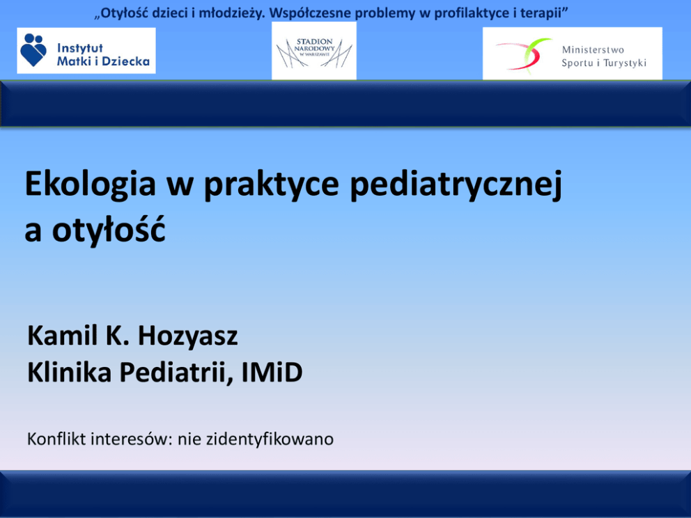 „Otyłość dzieci i młodzieży. Współczesne problemy w profilaktyce i terapii” Ekologia w praktyce pediatrycznej a otyłość Kamil K. Hozyasz Klinika Pediatrii, IMiD Konflikt interesów: nie zidentyfikowano Zainteresowanych problematyką przedstawioną w wykładzie odsyłamy do publikacji Zespołu Kliniki Pediatrii IMiD • Kanieska A, Hozyasz KK. Paleodieta – czy dieta przodków może zapobiegać chorobom cywilizacyjnym. Pediatria Polska 2014; 89:261-268 • Słowik M, Paszkowska M, Hozyasz KK. Słoiczkowe dania z żółtkiem dla niemowląt – przyczółek zdrowej diety. Pediatria Polska 2014;89:240-244 • Hozyasz KK, Słowik M. Mleka inne niż ogólnodostępne krowie – argumenty za i przeciw. Przegląd Gastroenterologiczny 2013;8:98-107