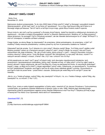ZNAJD? SWÓJ OGIE? Published on World Challenge (https://worldchallenge.org) ZNAJD? SWÓJ OGIE? Nicky Cruz November 21, 2015 Najnowsze studium przepowiada, ?e do roku 2020 Islam b?dzie wiod?c? religi? w Norwegii i wszystkich krajach Skandynawskich. Je?eli maj? racj?, to mo?emy si? spodziewa?, ?e w ci?gu nast?pnych kilku lat b?dzie to w Norwegii religia pa?stwowa. Tak si? sta?o w ka?dym innym kraju, gdzie Muzu?manie znale?li oparcie. Smuci mnie to, jak ma?y wp?yw wywieraj? w Europie chrze?cijanie. Jeste?my bezsilni w efektywnym docieraniu do zgubionych – nie tylko w krajach Europejskich, ale te? w Stanach Zjednoczonych. Modlimy si?, by Bóg poszerzy? nasze terytorium, by pomaga? Cia?u Chrystusa wzrasta?, ale tak niewiele denominacjom to si? udaje. Wi?kszo?? z nich si? zmniejsza, a niektóre ca?kiem umieraj?. Czego trzeba, ze strony Boga, by doprowadzi? do przemiany, której potrzebujemy, do przemiany, o któr? si? modlimy? Kiedy wreszcie powstaniemy i zrobimy powa?ny wy?om w panowaniu szatana na ?wiecie? Odpowied? jest tak prosta, ?e a? dziwnie mi o tym mówi?: Musimy zaufa? Bogu, ?e b?dzie czyni? wielkie cuda! Musimy powsta? razem ze z?amanymi sercami i odwa?n? wiar?, prosz?c Boga, by uczyni? nas pot??nymi wojownikami dla Jego królestwa. Tak, jak m?odzi ludzie, którzy pracuj? z nami – naszych Dwunastu Uczniów – musimy otworzy? nasze serca i ?ycie dla Boga i pozwoli? Mu zainstalowa? w nas pasj? dla dusz, rozwin?? w naszych sercach obsesj? o dusze, z?ama? nas, u?y? nas i umocni? do s?u?by! Je?eli popatrzycie na nasz? ma?? grup? m?odych ludzi, tych dwunastu niewidocznych bohaterów, tych poranionych i sponiewieranych dzieciaków, którzy maj? niewiele wi?cej, ni? kilka ubra? i p?on?cy ogie? pasji w swoich sercach i kiedy zobaczycie, jak pot??nie Bóg ich u?ywa na pierwszej linii frontu, to zaczniecie dostrzega? troszk? z tego, co Bóg mo?e zrobi? z nawet najmniejsz? porcj? wiary. Zobaczycie, co spowodowa?o, ?e pierwszy ko?ció? eksplodowa? liczebnie, poci?gaj?c tysi?ce do wiary przez zaledwie garstk? uczniów. Zrozumiecie co poci?ga?o ludzi do przes?ania – przes?ania o Jezusie. Zobaczycie jak wiele Bóg mo?e osi?gn?? przez tak niewielu. „Ale to, co u ?wiata g?upiego, wybra? Bóg, aby zawstydzi? m?drych, i to, co u ?wiata s?abego, wybra? Bóg, aby zawstydzi? to, co mocne” (1 Kor 1:27). Nicky Cruz, znany w wielu krajach ewangelista i p?odny autor, nawrócil si? do Jezusa Chrystusa z ?ycia przemocy i przest?pstw, po spotkaniu Dawida Wilkersona w Nowym Jorku w roku 1958. Historia jego dramatycznego nawrócenia zosta?a opowiedziana najpierw przez Dawida Wilkersona w ksi??ce Krzy? i Sztylet,a pó?niej w jego w?asnej ksi??ce Nicku Cruz Opowiada, która sta?a si? bestsellerem. Download PDF [1] Links [1] http://sermons.worldchallenge.org/printpdf/10664/ Page 1 of 1