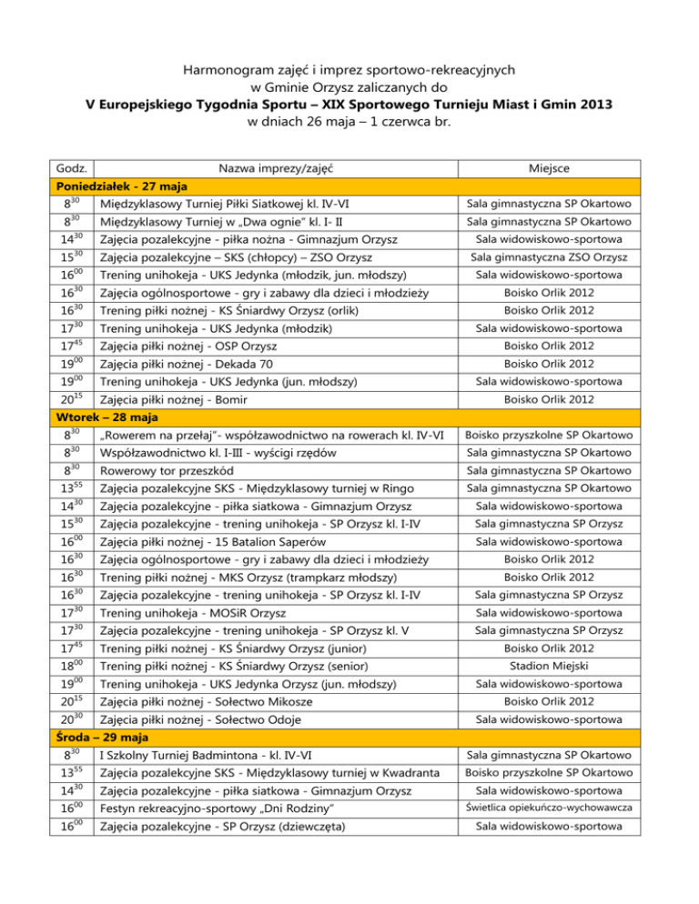 Harmonogram zajęć i imprez sportowo-rekreacyjnych w Gminie Orzysz zaliczanych do V Europejskiego Tygodnia Sportu – XIX Sportowego Turnieju Miast i Gmin 2013 w dniach 26 maja – 1 czerwca br. Godz. Nazwa imprezy/zajęć Miejsce Poniedziałek - 27 maja 830 30 8 Międzyklasowy Turniej Piłki Siatkowej kl. IV-VI Sala gimnastyczna SP Okartowo Międzyklasowy Turniej w „Dwa ognie” kl. I- II Sala gimnastyczna SP Okartowo 30 Zajęcia pozalekcyjne - piłka nożna - Gimnazjum Orzysz 30 Zajęcia pozalekcyjne – SKS (chłopcy) – ZSO Orzysz 00 Trening unihokeja - UKS Jedynka (młodzik, jun. młodszy) 30 Zajęcia ogólnosportowe - gry i zabawy dla dzieci i młodzieży Boisko Orlik 2012 30 Trening piłki nożnej - KS Śniardwy Orzysz (orlik) Boisko Orlik 2012 30 Trening unihokeja - UKS Jedynka (młodzik) 45 Zajęcia piłki nożnej - OSP Orzysz Boisko Orlik 2012 00 Zajęcia piłki nożnej - Dekada 70 Boisko Orlik 2012 00 Trening unihokeja - UKS Jedynka (jun. młodszy) 15 Zajęcia piłki nożnej - Bomir 14 15 16 16 16 17 17 19 19 20 Sala widowiskowo-sportowa Sala gimnastyczna ZSO Orzysz Sala widowiskowo-sportowa Sala widowiskowo-sportowa Sala widowiskowo-sportowa Boisko Orlik 2012 Wtorek – 28 maja 830 „Rowerem na przełaj”- współzawodnictwo na rowerach kl. IV-VI Boisko przyszkolne SP Okartowo 30 Współzawodnictwo kl. I-III - wyścigi rzędów Sala gimnastyczna SP Okartowo 30 8 8 Rowerowy tor przeszkód Sala gimnastyczna SP Okartowo 55 Zajęcia pozalekcyjne SKS - Międzyklasowy turniej w Ringo Sala gimnastyczna SP Okartowo 30 Zajęcia pozalekcyjne - piłka siatkowa - Gimnazjum Orzysz Sala widowiskowo-sportowa 30 Zajęcia pozalekcyjne - trening unihokeja - SP Orzysz kl. I-IV Sala gimnastyczna SP Orzysz 00 16 Zajęcia piłki nożnej - 15 Batalion Saperów Sala widowiskowo-sportowa 1630 13 14 15 Zajęcia ogólnosportowe - gry i zabawy dla dzieci i młodzieży Boisko Orlik 2012 30 Trening piłki nożnej - MKS Orzysz (trampkarz młodszy) Boisko Orlik 2012 30 Zajęcia pozalekcyjne - trening unihokeja - SP Orzysz kl. I-IV Sala gimnastyczna SP Orzysz 30 Trening unihokeja - MOSiR Orzysz Sala widowiskowo-sportowa 30 Zajęcia pozalekcyjne - trening unihokeja - SP Orzysz kl. V Sala gimnastyczna SP Orzysz 45 Trening piłki nożnej - KS Śniardwy Orzysz (junior) Boisko Orlik 2012 00 Trening piłki nożnej - KS Śniardwy Orzysz (senior) Stadion Miejski 00 Trening unihokeja - UKS Jedynka Orzysz (jun. młodszy) 15 Zajęcia piłki nożnej - Sołectwo Mikosze 30 Zajęcia piłki nożnej - Sołectwo Odoje 16 16 17 17 17 18 19 20 20 Sala widowiskowo-sportowa Boisko Orlik 2012 Sala widowiskowo-sportowa Środa – 29 maja 830 I Szkolny Turniej Badmintona - kl. IV-VI Sala gimnastyczna SP Okartowo 55 Zajęcia pozalekcyjne SKS - Międzyklasowy turniej w Kwadranta Boisko przyszkolne SP Okartowo 30 Zajęcia pozalekcyjne - piłka siatkowa - Gimnazjum Orzysz 00 16 Festyn rekreacyjno-sportowy „Dni Rodziny” 1600 Zajęcia pozalekcyjne - SP Orzysz (dziewczęta) 13 14 Sala widowiskowo-sportowa Świetlica opiekuńczo-wychowawcza Sala widowiskowo-sportowa 1630 Zajęcia ogólnosportowe - gry i zabawy dla dzieci i młodzieży Boisko Orlik 2012 1630 Trening piłki nożnej - KS Śniardwy Orzysz (orlik) Boisko Orlik 2012 30 Trening unihokeja - UKS Jedynka (młodzik) 45 Zajęcia piłki nożnej - Sołectwo Odoje 00 Zajęcia piłki siatkowej - Nauczyciele SP Orzysz 00 Zajęcia piłki nożnej - Bomir 00 Trening sztuk walki - MMA Orzysz 15 Zajęcia piłki nożnej - 15 Batalion Saperów 30 Zajęcia ogólnosportowe - OSP Orzysz 17 17 19 19 19 20 20 Sala widowiskowo-sportowa Boisko Orlik 2012 Sala widowiskowo-sportowa Boisko Orlik 2012 Sala widowiskowo-sportowa Boisko Orlik 2012 Sala widowiskowo-sportowa Czwartek – 30 maja 1530 Zajęcia pozalekcyjne - trening unihokeja - SP Orzysz kl. I-IV Sala gimnastyczna SP Orzysz 00 Trening unihokeja - MOSiR Orzysz Sala widowiskowo-sportowa 30 Zajęcia ogólnosportowe - gry i zabawy dla dzieci i młodzieży Boisko Orlik 2012 30 Trening piłki nożnej – MKS Orzysz (trampkarz młodszy) Boisko Orlik 2012 30 Zajęcia ogólnosportowe - gry i zabawy dla dzieci i młodzieży Boisko Orlik 2012 30 Zajęcia pozalekcyjne - trening unihokeja - SP Orzysz kl. I-IV Sala gimnastyczna SP Orzysz 30 Zajęcia piłki siatkowej - MSAL Orzysz Sala widowiskowo-sportowa 30 Zajęcia pozalekcyjne - trening unihokeja - SP Orzysz kl. V Sala gimnastyczna SP Orzysz 45 Trening piłki nożnej - KS Śniardwy Orzysz (junior) Boisko Orlik 2012 00 Trening piłki nożnej - KS Śniardwy Orzysz (senior) Stadion Miejski 00 Trening unihokeja - UKS Jedynka Orzysz (jun. młodszy) 00 Zajęcia piłki nożnej - Dekada 70 16 16 16 16 16 17 17 17 18 19 20 Sala widowiskowo-sportowa Boisko Orlik 2012 Piątek – 31 maja 1330 Zajęcia pozalekcyjne - piłka siatkowa - Gimnazjum Orzysz Sala widowiskowo-sportowa 30 Zajęcia ogólnosportowe - gry i zabawy dla dzieci i młodzieży 30 Zajęcia pozalekcyjne - SP Orzysz (chłopcy) 30 Trening piłki nożnej - KS Śniardwy Orzysz (junior) Stadion Miejski 00 Trening piłki nożnej - KS Śniardwy Orzysz (senior) Stadion Miejski 30 Zajęcia ogólnosportowe - OSP nr 1 Orzysz 16 17 17 18 20 Boisko Orlik 2012 Sala widowiskowo-sportowa Sala widowiskowo-sportowa Sobota – 1 czerwca 1500 Festyn rekreacyjno-sportowy z okazji „Dzień Dziecka” - DK Orzysz Przedszkole Miejskie (ul. W. Polskiego)