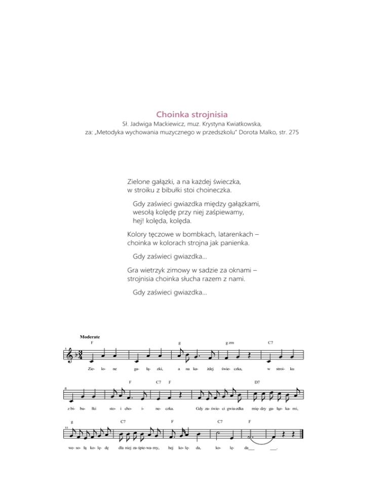 Choinka strojnisia Sł. Jadwiga Mackiewicz, muz. Krystyna Kwiatkowska, za: „Metodyka wychowania muzycznego w przedszkolu” Dorota Malko, str. 275 Zielone gałązki, a na każdej świeczka, w stroiku z bibułki stoi choineczka. Gdy zaświeci gwiazdka między gałązkami, wesołą kolędę przy niej zaśpiewamy, hej! kolęda, kolęda. Kolory tęczowe w bombkach, latarenkach – choinka w kolorach strojna jak panienka. Gdy zaświeci gwiazdka... Gra wietrzyk zimowy w sadzie za oknami – strojnisia choinka słucha razem z nami. Gdy zaświeci gwiazdka...