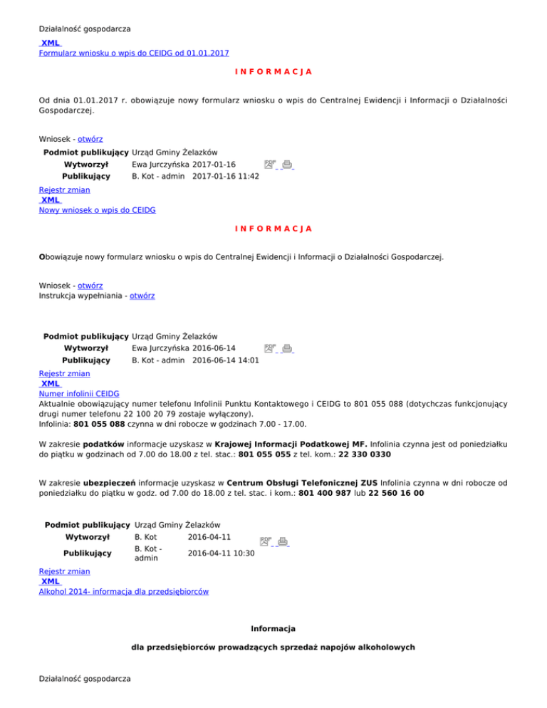 Działalność gospodarcza XML Formularz wniosku o wpis do CEIDG od 01.01.2017 INFORMACJA Od dnia 01.01.2017 r. obowiązuje nowy formularz wniosku o wpis do Centralnej Ewidencji i Informacji o Działalności Gospodarczej. Wniosek - otwórz Podmiot publikujący Urząd Gminy Żelazków Wytworzył Ewa Jurczyńska 2017-01-16 Publikujący B. Kot - admin 2017-01-16 11:42 Rejestr zmian XML Nowy wniosek o wpis do CEIDG INFORMACJA Obowiązuje nowy formularz wniosku o wpis do Centralnej Ewidencji i Informacji o Działalności Gospodarczej. Wniosek - otwórz Instrukcja wypełniania - otwórz Podmiot publikujący Urząd Gminy Żelazków Wytworzył Ewa Jurczyńska 2016-06-14 Publikujący B. Kot - admin 2016-06-14 14:01 Rejestr zmian XML Numer infolinii CEIDG Aktualnie obowiązujący numer telefonu Infolinii Punktu Kontaktowego i CEIDG to 801 055 088 (dotychczas funkcjonujący drugi numer telefonu 22 100 20 79 zostaje wyłączony). Infolinia: 801 055 088 czynna w dni robocze w godzinach 7.00 - 17.00. W zakresie podatków informacje uzyskasz w Krajowej Informacji Podatkowej MF. Infolinia czynna jest od poniedziałku do piątku w godzinach od 7.00 do 18.00 z tel. stac.: 801 055 055 z tel. kom.: 22 330 0330 W zakresie ubezpieczeń informacje uzyskasz w Centrum Obsługi Telefonicznej ZUS Infolinia czynna w dni robocze od poniedziałku do piątku w godz. od 7.00 do 18.00 z tel. stac. i kom.: 801 400 987 lub 22 560 16 00 Podmiot publikujący Urząd Gminy Żelazków Wytworzył B. Kot 2016-04-11 Publikujący B. Kot admin 2016-04-11 10:30 Rejestr zmian XML Alkohol 2014- informacja dla przedsiębiorców Informacja dla przedsiębiorców prowadzących sprzedaż napojów alkoholowych Działalność gospodarcza Działalność gospodarcza Przedsiębiorcy prowadzący sprzedaż napojów alkoholowych w 2013 roku, są zobowiązani do złożenia do dnia 31 stycznia 2014r. pisemnego oświadczenia o wartości sprzedaży poszczególnych rodzajów napojów alkoholowych w punkcie sprzedaży w roku 2013 /wartość sprzedaży należy obliczyć oddzielnie dla każdego rodzaju alkoholu/. OPŁATY 1) 525 zł - za zezwolenie na sprzedaż napojów alkoholowych zawierających do 4,5% alkoholu oraz piwo, jeżeli wartość sprzedaży w roku poprzednim nie przekroczyła kwoty 37.500 zł. W przypadku przekroczenia kwoty 37.500 zł. opłata wynosi 1,4% ogólnej kwoty wartości sprzedaży tych napojów w roku poprzednim. 2) 525 zł - za zezwolenie na sprzedaż napojów alkoholowych zawierających powyżej 4,5% do 18% alkoholu, jeżeli wartość sprzedaży w roku poprzednim nie przekroczyła kwoty 37.500 zł. W przypadku przekroczenia kwoty 37.500 zł opłata wynosi 1,4% ogólnej wartości sprzedaży tych napojów w roku poprzednim. 3) 2.100 zł - za zezwolenie na sprzedaż napojów alkoholowych zawierających powyżej 18% alkoholu, jeżeli wartość sprzedaży w roku poprzednim nie przekroczyła kwoty 77.000 zł. W przypadku przekroczenia kwoty 77.000 zł opłata wynosi 2,7% ogólnej kwoty wartości sprzedaży tych napojów w roku poprzednim. Opłata za korzystanie z zezwoleń na sprzedaż napojów alkoholowych wnoszona jest w każdym roku kalendarzowym objętym zezwoleniem w 3 równych ratach w terminach do 31 stycznia, 31 maja i 30 września danego roku na rachunek Urzędu Gminy Żelazków, BS Ziemi Kaliskiej O/Żelazków Nr 83 8404 0006 2003 0016 2069 0004 Nie złożenie oświadczenia w terminie do 31 stycznia lub nie dokonanie opłaty w wymaganej wysokości w ustawowym terminie, spowoduje wygaśnięcie zezwolenia. Formularz oświadczenia - otwórz Podmiot publikujący Urząd Gminy Żelazków Wytworzył Ewa Jurczyńska 2014-01-09 Publikujący - Rejestr zmian XML Pomoc przy rejestracji firmy Mikroporady.pl - Pomoc w zarządzaniu mikro firmą Podmiot publikujący Urząd Gminy Żelazków Wytworzył B. Kot Publikujący - 2013-12-09 Rejestr zmian XML UWAGA PRZEDSIĘBIORCY UWAGA PRZEDSIĘBIORCY !!! Przypominamy, że wszystkie czynności związane z wpisem do Centralnej Ewidencji i Informacji o Działalności Gospodarczej (CEIDG) - prowadzonej przez Ministra Gospodarki są BEZPŁATNE. Działalność gospodarcza Działalność gospodarcza Treść informacji - otwórz Podmiot publikujący Urząd Gminy Żelazków Wytworzył B. Kot Publikujący - Rejestr zmian rozwiń archiwum zwiń archiwum Przejdź do archiwum Działalność gospodarcza 2012-09-10