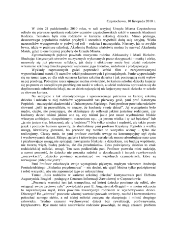 Częstochowa, 10 listopada 2010 r. W dniu 21 października 2010 roku, w sali sesyjnej Urzędu Miasta Częstochowa odbyło się pierwsze spotkanie rodziców uczniów częstochowskich szkół w ramach Akademii Rodzica. Tematem była rola rodziców w karierze szkolnej dziecka. Mimo późnego, deszczowego popołudnia rodzice przybyli i szczelnie wypełnili dużą salę sesyjną. Wielu uczestników występowało w podwójnej roli – rodzica i nauczyciela. Niestety, jak to zwykle bywa, także w praktyce szkolnej, Akademię Rodzica właściwie można by nazwać Akademią Matek, gdyż to one liczniej przybyły do Urzędu Miasta. Zgromadzonych pięknie powitała muzyczna rodzina Aleksandry i Marii Bielców. Słuchając klasycznych utworów muzycznych wykonanych przez skrzypaczki – matkę i córkę, nasuwały się już pierwsze refleksje, jak duży i efektowny może być udział rodziców w karierze szkolnej dziecka poprzez wspieranie jego talentów, uzdolnień i predyspozycji. Wykłady zaproszonych gości poprzedził krótki film z zarejestrowanymi wypowiedziami matek (!) uczniów szkół podstawowych i gimnazjalnych. Panie wypowiadały się na temat tego, co dla nich oznacza kariera szkolna dziecka i jak postrzegają swój wpływ na jej przebieg. Pobieżnie rzecz ujmując można stwierdzić, że kariera szkolna dziecka kojarzy się po prostu ze szczęśliwym przebiegiem nauki w szkole, a udział rodziców sprowadza się do dopilnowania odrobienia lekcji, na co dzień najczęściej nie kojarzymy nauki dziecka w szkole ze słowem kariera. Na szczęście z tak stereotypowego i uproszczonego patrzenia na karierę szkolną dziecka i udziału w niej rodziców wyprowadził nas pierwszy gość, pani prof. Katarzyna Popiołek – nauczyciel akademicki z Uniwersytetu Śląskiego. Pani profesor powitała rodziców słowami ,,jeśli tu przyszliście, to znaczy, że kochacie swoje dzieci”. Jej wystąpienie było mądre, ciepłe, nie pouczające, ale skłaniające do refleksji jakimi jesteśmy rodzicami, czy kochamy dzieci takimi jakimi one są, czy takimi jakie jest nasze wyobrażenie bliskie własnym ambicjom, niespełnionym marzeniom np.; ,,ja jestem wielka i ty też będziesz” lub ,,ja nie jestem (np. lekarzem), ale ty będziesz”? Nie tylko wiedza i mądrość, ale także prosty język i poczucie humoru sprawiły, że słuchaliśmy pani profesor Krystyny Popiołek z wielką uwagą, kiwaliśmy głowami, bo przecież my rodzice to wszystko wiemy – tylko nie realizujemy. Cieszy mnie, że pani profesor zwróciła uwagę na konsumpcyjny styl życia i wychowywania dzieci. Sklepy, galerie i telewizyjne seriale tak mocno absorbujące nasz czas i przykuwające uwagę,nie sprzyjają nawiązaniu bliskości z dzieckiem, nie budują wspólnoty, nie tworzą więzi, budzą podziw, ale dla przedmiotów. Czas poświęcony dziecku to znak rodzicielskiej miłości, uwagi. Ten czas podkreślała pani Profesor pozwala mieć nadzieję, a nawet pewność, że dziecko nie poszuka radości w dopalaczach i innych ryzykownych ,,rozrywkach”, ,,dziecko powinno uczestniczyć we wspólnych czynnościach, które są rozwojowe (sklep nie jest!)”. Pani Profesor zakończyła swoje wystąpienie pięknym, mądrym wierszem Andrzeja Poniedzielskiego ,,Sielanka przydomowa” – nic dodać, nic ująć! Można tylko podziękować i robić wszystko, aby nie zapomnieć tego co usłyszeliśmy. Temat ,,Rola rodziców w karierze szkolnej dziecka” kontynuowała pani Elżbieta Augustyniak-Brągiel – pedagog z Centrum Informacji Zawodowej w Częstochowie. ,,Poczucie wartości jest jak trampolina, od której dziecko powinno się odbić, aby osiągnąć swoje życiowe cele” powiedziała pani E. Augustyniak-Brągiel – w moim odczuciu to najważniejsza myśl, która powinna towarzyszyć rodzicom w wychowywaniu dzieci. Dlaczego? Bo ,,zdrowe” poczucie własnej wartości pozwala uwierzy, zaufać i bezwarunkowo pokochać samego siebie, a od takiej miłości zaczyna się akceptacja i miłość drugiego człowieka. Trudno czasami wychowywać dzieci bez rywalizacji, porównywania, krytykanctwa. Być może takie nastawienie rodziców powoduje, że mają czasami problem z mówieniem o swoim dziecku dobrze, z obserwacją tego, co dziecko cieszy, interesuje, czego potrzebuje. Pani E. Augustyniak-Bragiel w przekonujący sposób mówiła o tym, jak ważne są pochwały i koncentracja rodziców na tym, co dobre. Swoje wystąpienie zakończyła stwierdzeniem, że ,,jeśli oczekujemy, że dziecko spełni nasze oczekiwania to odmawiamy mu prawa do bycia sobą”. Mam nadzieję, że następne spotkania w Akademii Rodzica będą równie interesujące jako to, które odbyło się 21 października 2010 r. Joanna Biczak Pedagog szkolny w SP 12 w Częstochowie doradca metodyczny w SOD w Częstochowie Opublikowane w ,,Częstochowskim Biuletynie Oświatowym”