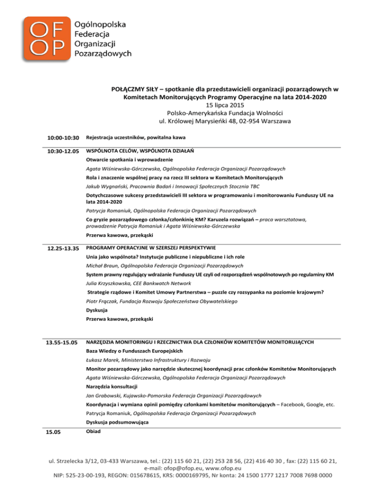 POŁĄCZMY SIŁY – spotkanie dla przedstawicieli organizacji pozarządowych w Komitetach Monitorujących Programy Operacyjne na lata 2014-2020 15 lipca 2015 Polsko-Amerykańska Fundacja Wolności ul. Królowej Marysieńki 48, 02-954 Warszawa 10:00-10:30 Rejestracja uczestników, powitalna kawa 10:30-12.05 WSPÓLNOTA CELÓW, WSPÓLNOTA DZIAŁAŃ Otwarcie spotkania i wprowadzenie Agata Wiśniewska-Górczewska, Ogólnopolska Federacja Organizacji Pozarządowych Rola i znaczenie wspólnej pracy na rzecz III sektora w Komitetach Monitorujących Jakub Wygnański, Pracownia Badań i Innowacji Społecznych Stocznia TBC Dotychczasowe sukcesy przedstawicieli III sektora w programowaniu i monitorowaniu Funduszy UE na lata 2014-2020 Patrycja Romaniuk, Ogólnopolska Federacja Organizacji Pozarządowych Co gryzie pozarządowego członka/członkinię KM? Karuzela rozwiązań – praca warsztatowa, prowadzenie Patrycja Romaniuk i Agata Wiśniewska-Górczewska Przerwa kawowa, przekąski 12.25-13.35 PROGRAMY OPERACYJNE W SZERSZEJ PERSPEKTYWIE Unia jako wspólnota? Instytucje publiczne i niepubliczne i ich role Michał Braun, Ogólnopolska Federacja Organizacji Pozarządowych System prawny regulujący wdrażanie Funduszy UE czyli od rozporządzeń wspólnotowych po regulaminy KM Julia Krzyszkowska, CEE Bankwatch Network Strategie rządowe i Komitet Umowy Partnerstwa – puzzle czy rozsypanka na poziomie krajowym? Piotr Frączak, Fundacja Rozwoju Społeczeństwa Obywatelskiego Dyskusja Przerwa kawowa, przekąski 13.55-15.05 NARZĘDZIA MONITORINGU I RZECZNICTWA DLA CZŁONKÓW KOMITETÓW MONITORUJĄCYCH Baza Wiedzy o Funduszach Europejskich Łukasz Marek, Ministerstwo Infrastruktury i Rozwoju Monitor pozarządowy jako narzędzie skutecznej koordynacji prac członków Komitetów Monitorujących Agata Wiśniewska-Górczewska, Ogólnopolska Federacja Organizacji Pozarządowych Narzędzia konsultacji Jan Grabowski, Kujawsko-Pomorska Federacja Organizacji Pozarządowych Koordynacja i wymiana opinii pomiędzy członkami komitetów monitorujących – Facebook, Google, etc. Patrycja Romaniuk, Ogólnopolska Federacja Organizacji Pozarządowych Dyskusja podsumowująca 15.05 Obiad ul. Strzelecka 3/12, 03-433 Warszawa, tel.: (22) 115 60 21, (22) 253 28 56, (22) 416 40 30 , fax: (22) 115 60 21, e-mail: [email protected], www.ofop.eu NIP: 525-23-00-193, REGON: 015678615, KRS: 0000169795, Nr konta: 24 1500 1777 1217 7008 7698 0000 Informacje dodatkowe: Kontakt do organizatorów: Agata Wiśniewska-Górczewska, tel. 601 719 488, [email protected] Patrycja Romaniuk, tel. 603 640 268, [email protected] Mapka dojazdu do PAWF znajduje się na następnej stronie. Przydatne linki dla osób korzystających z transportu publicznego: Rozkład jazdy pociągów: http://www.rozklad.pkp.pl/ Rozkłady jazdy i trasy przejazdów komunikacji miejskiej w Warszawie: www.ztm.waw.pl Wyszukiwarka połączeń w Warszawie: http://warszawa.jakdojade.pl/ ul. Strzelecka 3/12, 03-433 Warszawa, tel.: (22) 115 60 21, (22) 253 28 56, (22) 416 40 30 , fax: (22) 115 60 21, e-mail: [email protected], www.ofop.eu NIP: 525-23-00-193, REGON: 015678615, KRS: 0000169795, Nr konta: 24 1500 1777 1217 7008 7698 0000