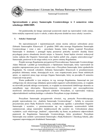 Sprawozdanie z pracy Samorządu Uczniowskiego w I semestrze roku szkolnego 2008/2009. Od października do lutego samorząd uczniowski starał się wprowadzić wiele zmian, które miałyby usprawnić życie w szkole, a także aktywnie działał na rzecz szkoły i uczniów. I. Szkoła i Samorząd Do najważniejszych i najistotniejszych zmian można zaliczyć uchwalenie przez Zebranie Samorządów Klasowych 12 grudnia 2008 roku nowego Regulaminu Samorządu Uczniowskiego i wraz z nim – powołanie Senatu, który będzie wspierał Prezydium Samorządu w działaniu i pomagał lepiej poznawać potrzeby uczniów (każdej klasie przysługuje prawo obsadzenie dwóch miejsc w Senacie). Senat będzie również wskazywał ważne zadania dla Organów Samorządu oraz będzie pełnił rolę „organu ustawodawczego” Samorządu, ponieważ to do niego należy m.in. prawo zmiany Regulaminu. Projekt nowego Regulaminu przygotował Przewodniczący Samorządu Uczniowskiego Adam Malczak i poddał go konsultacjom z Opiekunem Samorządu, który wprowadził do projektu zaproponowane przez siebie zmian oraz z Prezydium Samorządu, które ujednoliciło Regulamin. Na wniosek członków Zebrania Samorządów Klasowych w przedstawionym projekcie dokonany zmian, skracających m.in. czas rozpatrywania przez Senat niektórych spraw, co usprawni pracę tego nowego Organu Samorządu, który na początku II semestru rozpoczął swoje prace. Warto podkreślić w tym miejscu, że wg. nowego Regulaminu, Samorząd nie jest zobligowany do okresowego składania sprawozdań organowi uchwałodawczemu, ze względu na niewielki pożytek takiego rozwiązania, ze względu na niemożność dotkliwego ukarania za zaniedbanie tego obowiązku. Skuteczniejszym rozwiązaniem jest uszczegółowiona możliwość odwoływania poszczególnych członków Prezydium, co wprowadza większą odpowiedzialność osobistą każdego z członków Prezydium za jego działania. Prezydium Samorządu przygotowało również, wg. pomysłu Przewodniczącego, projekt wprowadzenia tzw. „budżetu Samorządu Uczniowskiego” – byłaby to corocznie przyznawana przez Radę Rodziców kwota, wydatkowana zgodnie z potrzebami Organów Samorządu i uczniów, z przeznaczeniem np. na wspieranie uczniowskich kółek zainteresowań, zakup materiałów dydaktycznych dla uczniów etc. Uchwaleniem planu wydatków, czyli właściwego „budżetu”, zajmowałby się Senat, na podstawie odpowiednich poprawek do Regulaminu Samorządu Uczniowskiego, które przedstawi Prezydium Samorządu oraz ustaleń i porozumień Samorządu z Radą Rodziców i Dyrekcją Szkoły, jako organami zapewniającymi działalność Samorządu. Prezydium Samorządu Uczniowskiego Gimnazjum i Liceum Ogólnokształcącego im. Stefana Batorego Ul. Myśliwiecka 6 00-459 Warszawa http://www.batory.edu.pl/samorzad/ e-mail: [email protected] tel.: (022) 628-21-01 fax: (022) 621-98-37 Prezydium Samorządu przedstawiło Organom Szkoły opinię dt. dokonanego po remoncie szkoły „rozdziału” pomieszczeń czytelni i mediateki. Samorząd w opinii wyraził, na podstawie głosów uczniów, zdecydowaną aprobatę dla takiego stanu rzeczy, stwierdzając, że zmniejszony poziom hałasu w czytelni pozytywnie wpłynął na komfort przebywania w tym pomieszczeniu i znacznie usprawnił komunikację w pomieszczeniu mediateki. Dodatkowo, w tym roku wydłużono godziny pracy czytelni, o co również postulowali przedstawiciele Prezydium Samorządu, zarówno obecnej, jak i poprzedniej kadencji. W tej samej opinii, Prezydium Samorządu odniosło się również do kwestii instalacji w szkole kamer monitoringu – w ramach ministerialnego programu poprawy bezpieczeństwa w placówkach oświatowych. I choć Samorząd ani Organy Szkoły nie mają decydującego wpływu na fakt wdrożenia (lub nie) tego systemu w naszej szkole, to Prezydium Samorządu zasugerowało, że istnienie monitoringu w szkole ma znaczenie pozytywne tak długo, jak zwiększa bezpieczeństwo uczniów (np. poprzez zmniejszenie ilości włamań do szafek i kradzieży, aktów niszczenia szafek i wyposażenia szkoły). Jednakże, sieć kamer powinna być tak zaplanowana by w żaden sposób nie naruszała prywatności uczniów i nie sprawiała wrażenia ciągłego monitorowania ucznia, co może wpływać na komfort przebywania uczniów w szkole. Prezydium Samorządu nie popiera instalacji kamer na korytarzach głównych szkoły. W pracy Samorządu obecnej kadencji warto zauważyć i docenić dużą pracę i wkład Wiceprzewodniczącej Samorządu ds. Gimnazjum Magdaleny Rajpert z klasy 8b. Prezydium Samorządu Uczniowskiego złożyło wniosek i uzyskało dofinansowanie Rady Rodziców dla projektu klasy 8b wydania płyty z kolędami nagranymi przez nauczycieli naszej szkoły. Klasa 8b, przy intensywnej współpracy między Przewodniczącym a Wiceprzewodniczącą Magdaleną Rajpert, bierze również udział w przygotowaniach do Unikatowego Festiwalu Offowego, wykonując ogromną pracę – klasa będzie samodzielnie zarządzała w całości jedną z kawiarenek festiwalowych. Radiowęzeł, jako podstawowy element urozmaicenia uczniowskiego życia, jest nieustannym przedmiotem zainteresowania Prezydium Samorządu Uczniowskiego. Na skutek opóźnień i błędów w pracach remontowych, dopiero po feriach zimowych radiowęzeł, przeniesiony do pomieszczenia portierni, mógł zacząć działać. Wraz z rozpoczęciem kadencji Senatu, Prezydium Samorządu zwróciło się z prośbą do Senatorów o „namawianie” uczniów do zgłaszania chęci zorganizowania pracy wolontariatu. Prezydium Samorządu wyraża nadzieję, że regularne audycje muzyczne, a w przyszłości być może również publicystyczne, pojawią się na „antenie” naszego szkolnego radiowęzła w najbliższych tygodniach. Po raz pierwszy na skalę „ogólnoszkolną” po remoncie radiowęzeł zostanie wykorzystany podczas Festiwalu UFO. II. Samorząd i współpraca z innymi szkołami Obecny Samorząd, 