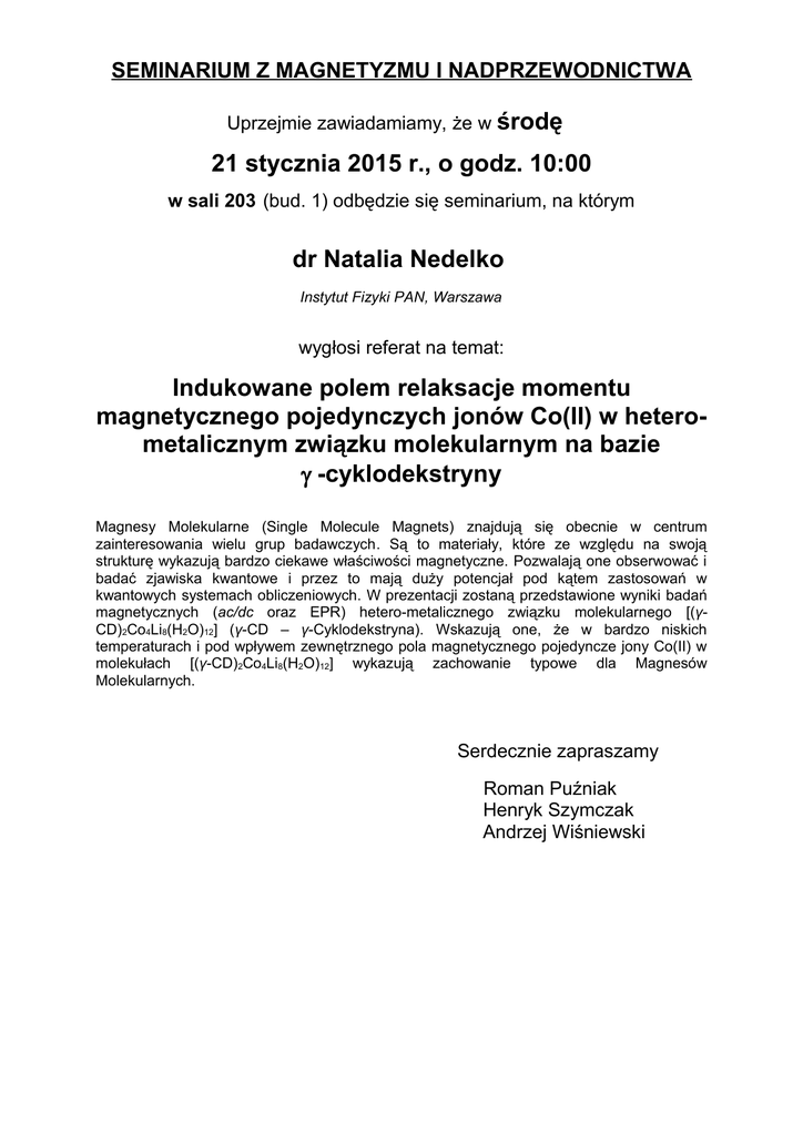 SEMINARIUM Z MAGNETYZMU I NADPRZEWODNICTWA Uprzejmie zawiadamiamy, że w środę 21 stycznia 2015 r., o godz. 10:00 w sali 203 (bud. 1) odbędzie się seminarium, na którym dr Natalia Nedelko Instytut Fizyki PAN, Warszawa wygłosi referat na temat: Indukowane polem relaksacje momentu magnetycznego pojedynczych jonów Co(II) w heterometalicznym związku molekularnym na bazie γ -cyklodekstryny Magnesy Molekularne (Single Molecule Magnets) znajdują się obecnie w centrum zainteresowania wielu grup badawczych. Są to materiały, które ze względu na swoją strukturę wykazują bardzo ciekawe właściwości magnetyczne. Pozwalają one obserwować i badać zjawiska kwantowe i przez to mają duży potencjał pod kątem zastosowań w kwantowych systemach obliczeniowych. W prezentacji zostaną przedstawione wyniki badań magnetycznych (ac/dc oraz EPR) hetero-metalicznego związku molekularnego [(γCD)2Co4Li8(H2O)12] (γ-CD – γ-Cyklodekstryna). Wskazują one, że w bardzo niskich temperaturach i pod wpływem zewnętrznego pola magnetycznego pojedyncze jony Co(II) w molekułach [(γ-CD)2Co4Li8(H2O)12] wykazują zachowanie typowe dla Magnesów Molekularnych. Serdecznie zapraszamy Roman Puźniak Henryk Szymczak Andrzej Wiśniewski