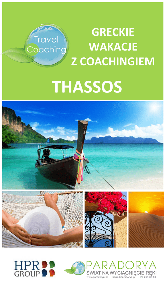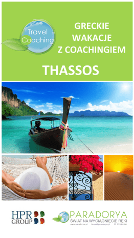 GRECKIE WAKACJE Z COACHINGIEM THASSOS TRAVEL COACHING. THASSOS ZAPRASZAMY NA GRECKIE WAKACJE Z COACHINGIEM! Połącz odpoczynek z dużą dawką śmiechu, efektywną nauką i pracą nad sobą! Co to jest? To wakacje z coachingiem, dzięki którym poznasz samego siebie i nauczysz się realizować swoje marzenia. Dowiesz się, jak wykorzystać swoje mocne strony, w jaki sposób osiągnąć upragniony cel oraz jak wytrwać w swoich postanowieniach. Coaching Holiday to odpoczynek, na który czekałeś od dawna. To odważny plan, aby zmieniać siebie. Dlaczego Greckie Wakacje z Coachingiem? Wakacje to czas relaksu i odpoczynku. Warto więc go dobrze zaplanować i mądrze wykorzystać. Śmiech, radość i dobry humor to największe dobrodziejstwo dla naszego organizmu. Możesz to połączyć z efektywną nauką, pracą nad sobą i jednocześnie dużą dawką śmiechu! Nie ma nic lepszego jak uczenie się i rozwijanie poprzez śmiech. Wakacje z coachingiem obejmują te wszystkie cechy. Po powrocie chętnie wprowadzisz do swojego życia zmiany, aby urzeczywistnić własne postanowienia. Greckie Wakacje z Coachingiem - 18 godzin coachingu Greckie wakacje z coachingiem to aż 18 godzin coachingu grupowego przy jednej z najpiękniejszych plaż na Thassos–Tripiti. Poza warsztatami – odpoczywasz jak tylko chcesz. TRAVEL COACHING. THASSOS. SZKOLENIE. Miejsce: GRECJA, THASSOS, Blue Dream Palace 4* Termin: 01 - 08 czerwca 2015 Co będziemy robić? Spotykamy się codziennie rano na 2 godzinnych warsztatach i wieczorem na plaży na podsumowaniu dnia. 1 dzień – poznajemy się, uczymy śmiać się z siebie i nabierać dystansu do samego siebie 2 dzień - wyznaczamy sobie obszary i cele do rozwoju osobistego 3 dzień – nasze środowisko czyli w jakich funkcjonujemy w systemach 4 dzień - odkrywamy własne zasoby i mocne strony 5 dzień – pracujemy nad precyzowaniem własnych wartości 6 dzień – kim jesteś? Kiedy ostatnio się nad tym zastanawialiście 7 dzień – podsumowanie i powrót do domu z nowym wesołym JA Jakie narzędzia będziemy wykorzystywać podczas ćwiczeń: Narzędzia warsztatu improwizacji Karty coachingowe „Points of You” Gry i zabawy coachingowe Prace z symbolami Elementy jogi śmiechem Warsztaty będą zawierać narzędzia, wiedzę opartą o pracę następujących mistrzów coachingowych, rozwojowych takich jak : Robert Dilt’s, Lucas Dercs, Franc Farrelli, Jaap Hollander. TRAVEL COACHING. THASSOS. HOTEL. Miejsce: GRECJA, THASSOS, Hotel Blue Dream Palace 4* Termin: 01 - 08 czerwca 2015 Komfortowy, w stylu zgodnym z najnowszymi, światowymi trendami. Wysmakowane, znakomicie Położony przy jednej z najładniejszych plaż na Thassos - Tripiti, oferuje świetne warunki pobytu i profesjonalny serwis. Eleganckie pokoje są funkcjonalnie wyposażone, przestronne i bardzo zadbane, w każdym jest internet bezprzewodowy i widok na morze! Z terenu basenów można bezpośrednio wejść na plażę, gdzie jest tawerna serwująca przysmaki kuchni greckiej. Dla aktywnych urlopowiczów przygotowano kort tenisowy i minigolf. Blisko jest do Limenarii, gdzie warto wybrać się na wycieczkę w poszukiwaniu pamiątek oraz skosztować potraw w lokalnych tawernach. Położenie: ok. 3 km od centrum LIMENARII ze sklepami i tawernami, na wzgórzu; ok. 55 km od portu lotniczego w Kavali (transfer autokarem i promem); przystanek autobusowy ok. 30 m od hotelu (ok. 1 EUR/Limenaria). Plaża: Tripiti, publiczna, piaszczysta, w zatoce, łagodne zejście do morza, bezpośrednio przy hotelu, parasole i leżaki płatne (ok. 6 EUR/dzień). Hotel: czterogwiazdkowy, zbudowany w 2009 r., 70 pokoi, restauracja Thalasso - dania w formie bufetu, kuchnia grecka i międzynarodowa, tawerna Meltemi przy plaży - á la carte, kuchnia grecka, dania rybne, dania wegetariańskie, kantor; centrum konferencyjne dla 50 osób, bezpłatny internet bezprzewodowy; akceptowane karty kredytowe: Visa, MasterCard. Sport i rozrywka: basen, słona woda, ok. 450 m², gł. 1-1,5 m, brodzik dla dzieci, słona woda, ok. 50 m², gł. 0,6 m, przy basenie bezpłatne parasole i leżaki, ręczniki (wypożyczenie: ok. 2 EUR); siatkówka plażowa; plac zabaw dla dzieci, wieczór grecki raz w tygodniu; za opłatą: kort tenisowy z wypożyczalnią sprzętu (ok. 10 EUR/godz.), tenis stołowy (ok. 5 EUR/godz.), minigolf (ok. 5 EUR/godz.); centrum spa (wstęp płatny ok. 20 EUR/dzień): kryty basen, prostokątny kształt, słodka woda, ok. 120 m², sauna, hammam, jacuzzi, masaże, zabiegi na twarz i ciało (zabiegi dodatkowo płatne). Więcej TRAVEL COACHING. THASSOS. HOTEL. Miejsce: GRECJA, THASSOS, Hotel Blue Dream Palace 4* Termin: 01 - 08 czerwca 2015 Więcej TRAVEL COACHING. THASSOS. CENA. CENA Cena za pełną ofertę : 4200 PLN Cena zawiera: Usługę Turystyczną – 2700 PLN • Przelot samolotem: – Polska – Kavala – Polska • obowiązkową opłaty lotniskowe (200 zł), • obowiązkową dopłatę transportową (150 zł), • transfery lotnisko – hotel – lotnisko klimatyzowanym autokarem, • zakwaterowanie: 7 noclegów w wybranym hotelu, pokoje dwuosobowe standardowe, • wyżywienie: formuła „full board” (FB) zgodnie z ofertą • opieka polskiego rezydenta, • ubezpieczenie KL i NW Itaka Simple – do 15.000€/ osoba, Usługę coachingową – 1500 PLN • opiekę profesjonalnych, certyfikowanych Coachów ICF; • 18 godzinny warsztat coachingowy • Certyfikat ukończenia szkolenia GRATIS: 1 indywidualną sesję coachingową na miejscu Poszerzoną wersję ubezpieczenia Fotokolaż z pobytu Ceny nie zawierają: • wycieczek lokalnych, • dopłaty do pokoju 1-jednoosobowego: • wydatków własnych i innych elementów TRAVEL COACHING. THASSOS. O NAS. COACH Izabela Kluzek, HPR Group Jest certyfikowanym i wieloletnim trenerem, wykładowcą wielu renomowanych uczelni państwowych i prywatnych. Na swoim koncie ma kilkaset godzin szkoleń przygotowujących do międzynarodowej akredytacji ICF na poziomie ACC. Jest mentorem z 