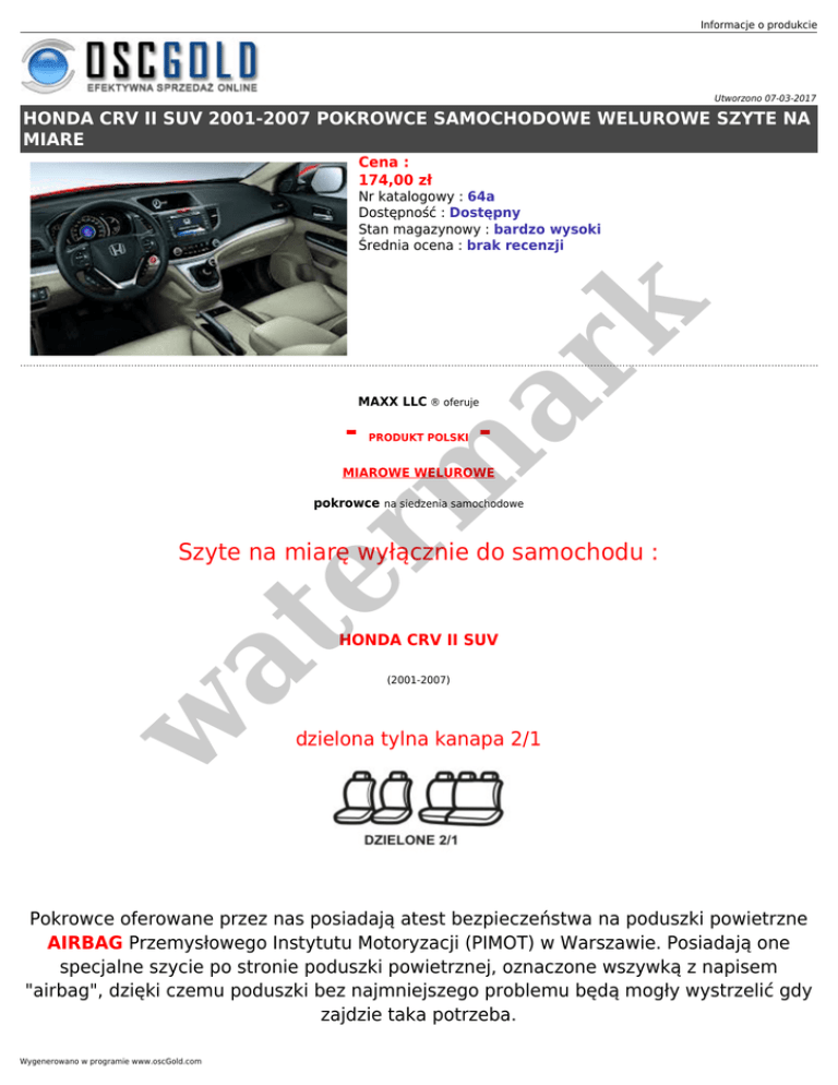 Informacje o produkcie Utworzono 07-03-2017 HONDA CRV II SUV 2001-2007 POKROWCE SAMOCHODOWE WELUROWE SZYTE NA MIARE Cena : 174,00 zł er m ar k Nr katalogowy : 64a Dostępność : Dostępny Stan magazynowy : bardzo wysoki Średnia ocena : brak recenzji MAXX LLC ® oferuje - PRODUKT POLSKI - MIAROWE WELUROWE pokrowce na siedzenia samochodowe at Szyte na miarę wyłącznie do samochodu : w HONDA CRV II SUV (2001-2007) dzielona tylna kanapa 2/1 Pokrowce oferowane przez nas posiadają atest bezpieczeństwa na poduszki powietrzne AIRBAG Przemysłowego Instytutu Motoryzacji (PIMOT) w Warszawie. Posiadają one specjalne szycie po stronie poduszki powietrznej, oznaczone wszywką z napisem "airbag", dzięki czemu poduszki bez najmniejszego problemu będą mogły wystrzelić gdy zajdzie taka potrzeba. Wygenerowano w programie www.oscGold.com w at er m ar k Dzięki czemu przystosowane są do samochodów zarówno z bocznymi poduszkami powietrznymi w fotelach, jak i do standardowych siedzeń. Pokrowce wykonane są z wysokiej jakości weluru dodatkowo laminowanego pianką poliuretanową oraz podszewką co zapobiega wykruszaniu się gąbki i ułatwia zakładanie Informacje o produkcie Boczki foteli, zagłówki oraz plecy wykonane są z grubej dzianiny poliestrowej koloru ciemno grafitowego, w całości laminowanej pianką, w at er m ar k w miejscach szczególnie podatnych na przetarcia dodatkowo wzmocnione podszewką. Wygenerowano w programie www.oscGold.com er m ar k at w Informacje o produkcie er m ar k Pokrowce są bardzo solidnie wykończone, otwory do regulacji foteli, lub pod zagłówki i pasy bezpieczeństwa są wycięte, obszyte i dopasowane pod każdy model indywidualnie. at Po dokładnym montażu naszych pokrowców uzyskujemy efekt praktycznie nie odróżniający się od orginalnej tapicerki co zresztą widać na powyższych zdjęciach. w W trzech wzorach: Wygenerowano w programie www.oscGold.com er m ar k at w w at er m ar k Informacje o produkcie Wygenerowano w programie www.oscGold.com er m ar k at w KOMPLET ZAWIERA PEŁNY ZESTAW PRZEZNACZONY DO DANEGO MODELU SAMOCHODU: - komplet pokrowców na przednie fotele - komplet pokrowców na tylną kanape / tylne fotele - pokrowce na zagłówki - pokrowce na inne, niestandardowe elementy - zależne od modelu samochodu, jak np. podłokietniki, kolumny/nadkola, itp. - haczyki oraz inne elementy montażowe - instrukcję montażu FOTELE PRZEDNIE Informacje o produkcie jednoczęściowe z łatą montażową wciąganą w szczelinę pomiędzy siedziskiem a oparciem; przystosowane do bocznych poduszek powietrznych; poniżej zagłówka wyhaftowany napis; na plecach dostęp do kieszeni; 2 pokr. na zagłówki FOTELE TYLNE w at er m ar k oparcie z dwóch części dzielone niesymetrycznie 2/1, na środku niezależny podłokietnik z osobnym pokrowcem; siedzisko także dzielone niesymetrycznie - dwuczęściowe; pokr. na 3 zagłówki; na oparciu jak i na siedzisku po dwie wstawki welurowe. Wygenerowano w programie www.oscGold.com