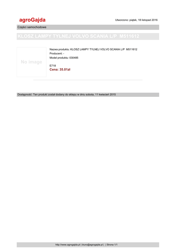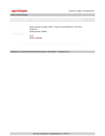 agroGajda Utworzono: piątek, 18 listopad 2016 Części samochodowe KLOSZ LAMPY TYLNEJ VOLVO SCANIA L/P M511612 Nazwa produktu: KLOSZ LAMPY TYLNEJ VOLVO SCANIA L/P M511612 Producent: Model produktu: 030485 No image E718 Cena: 35.01zł Dostępność: Ten produkt został dodany do sklepu w dniu sobota, 11 kwiecień 2015 http://www.agrogajda.pl | [email protected] | | Strona 1/1