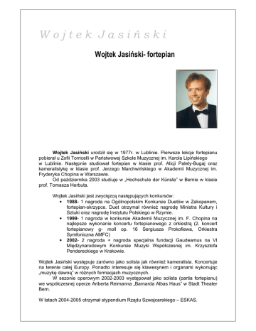 Wojtek Jasiński Wojtek Jasiński- fortepian Wojtek Jasiński urodził się w 1977r. w Lublinie. Pierwsze lekcje fortepianu pobierał u Zofii Torricelli w Państwowej Szkole Muzycznej im. Karola Lipińskiego w Lublinie. Następnie studiował fortepian w klasie prof. Alicji Palety-Bugaj oraz kameralistykę w klasie prof. Jerzego Marchwińskiego w Akademii Muzycznej im. Fryderyka Chopina w Warszawie. Od października 2003 studiuje w „Hochschule der Künste” w Bernie w klasie prof. Tomasza Herbuta. Wojtek Jasiński jest zwycięzcą następujących konkursów: • 1988- 1 nagroda na Ogólnopolskim Konkursie Duetów w Zakopanem, fortepian-skrzypce. Duet otrzymał również nagrodę Ministra Kultury i Sztuki oraz nagrodę Instytutu Polskiego w Rzymie. • 1999- 1 nagroda w konkursie Akademii Muzycznej im. F. Chopina na najlepsze wykonanie koncertu fortepianowego z orkiestrą (2. koncert fortepianowy g- moll op. 16 Sergiusza Prokofiewa, Orkiestra Symfoniczna AMFC) • 2002- 2 nagroda + nagroda specjalna fundacji Gaudeamus na VI Międzynarodowym Konkursie Muzyki Współczesnej im. Krzysztofa Pendereckiego w Krakowie. Wojtek Jasiński występuje zarówno jako solista jak również kameralista. Koncertuje na terenie całej Europy. Ponadto interesuje się klawesynem i organami wykonując „muzykę dawną” w różnych formacjach muzycznych. W sezonie operowym 2002-2003 występował jako solista (partia fortepianu) we współczesnej operze Ariberta Reimanna „Barnarda Albas Haus” w Stadt Theater Bern. W latach 2004-2005 otrzymał stypendium Rządu Szwajcarskiego – ESKAS.