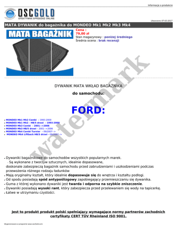 Informacje o produkcie Utworzono 07-03-2017 MATA DYWANIK do bagażnika do MONDEO Mk1 Mk2 Mk3 Mk4 Cena : 79,00 zł er m ar k Stan magazynowy : poniżej średniego Średnia ocena : brak recenzji DYWANIK MATA WKŁAD BAGAŻNIKA do samochodu: FORD: ● ● ● ● ● MONDEO Mk1 Mk2 Combi - 1993-2000 MONDEO Mk1 Mk2 - HB/5 drzwi - 1993-2000 MONDEO Mk3 Combi - 2001-->2006 MONDEO Mk3 HB/5 drzwi - 2001-->2006 MONDEO Mk4 Combi Turnier - 09/2007--> MONDEO Mk4 Liftback HB/5 drzwi - 09/2007--> at ● Dywaniki bagażnikowe do samochodów wszystkich popularnych marek. Są wykonane z tworzyw sztucznych, idealnie dopasowane, doskonale zabezpieczą bagażnik samochodu przed zabrudzeniami i uszkodzeniami podczas przewożenia różnego rodzaju ładunków. Mają oryginalny kształt, który idealnie dopasowuje się do wnętrza i kształtu podłogi. Od spodu posiadają spód antypoślizgowy zapobiegający przemieszczaniu się dywanika. Guma z której wykonano dywaniki jest twarda i odporna na szybkie zniszczenie. Dywaniki posiadają wysoki rant, który zabezpiecza przed przelewaniem się wody na tapicerkę. Łatwe w utrzymaniu czystości. ❍ ● ● ● ● ● w ● Jest to produkt produkt polski spełniający wymagające normy partnerów zachodnich certyfikaty CERT TÜV Rheinland ISO 9001. Wygenerowano w programie www.oscGold.com w at er m ar k Dokładne odwzorowanie bagażnika, elastyczne tworzywo wysokiej jakości odporne na działanie środków chemicznych i olejów, wysoki kołnierz ochronny (5,5 cm - 6 cm), żebrowana powierzchnia, wkład antypoślizgowy. w at er m ar k Informacje o produkcie Wygenerowano w programie www.oscGold.com er m ar k at w Informacje o produkcie w at er m ar k Wszystkie dywaniki samochodowe do bagażnika objęte są gwarancją dopasowania. Oznacza to, że zakupiona mata do bagażnika dedykowana dla danego samochodu będzie dokładnie odwzorowywać kształt typowego bagażnika bez przeróbek czy zmian konstrukcyjnych. Szczegółowe warunki gwarancji dopasowania dla wykładziny do bagażnika w zakładce gwarancja dopasowania u dołu strony. Wygenerowano w programie www.oscGold.com er m ar k at w w at er m ar k Informacje o produkcie Wygenerowano w programie www.oscGold.com w at er m ar k Dywaniki są trwałe i wytrzymałe, wodoodporne, wyposażone w centralnej części w mate antypoślizgową mają estetyczne i wyraźnie zaznaczone miejsca na wycięcie otworów na pasy ładunkowe.