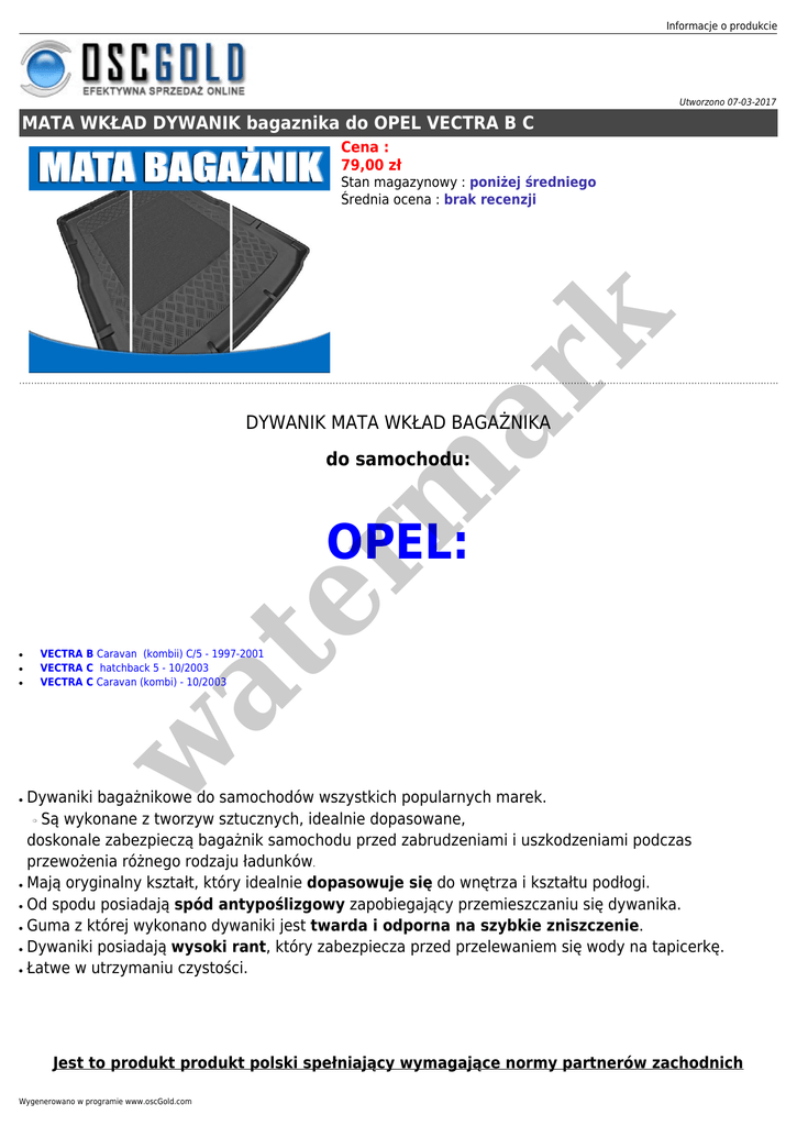 Informacje o produkcie Utworzono 07-03-2017 MATA WKŁAD DYWANIK bagaznika do OPEL VECTRA B C Cena : 79,00 zł er m ar k Stan magazynowy : poniżej średniego Średnia ocena : brak recenzji DYWANIK MATA WKŁAD BAGAŻNIKA do samochodu: OPEL: at VECTRA B Caravan (kombii) C/5 - 1997-2001 VECTRA C hatchback 5 - 10/2003 VECTRA C Caravan (kombi) - 10/2003 ● ● ● w ● Dywaniki bagażnikowe do samochodów wszystkich popularnych marek. Są wykonane z tworzyw sztucznych, idealnie dopasowane, doskonale zabezpieczą bagażnik samochodu przed zabrudzeniami i uszkodzeniami podczas przewożenia różnego rodzaju ładunków. Mają oryginalny kształt, który idealnie dopasowuje się do wnętrza i kształtu podłogi. Od spodu posiadają spód antypoślizgowy zapobiegający przemieszczaniu się dywanika. Guma z której wykonano dywaniki jest twarda i odporna na szybkie zniszczenie. Dywaniki posiadają wysoki rant, który zabezpiecza przed przelewaniem się wody na tapicerkę. Łatwe w utrzymaniu czystości. ❍ ● ● ● ● ● Jest to produkt produkt polski spełniający wymagające normy partnerów zachodnich Wygenerowano w programie www.oscGold.com certyfikaty CERT TÜV Rheinland ISO 9001. w at er m ar k Dokładne odwzorowanie bagażnika, elastyczne tworzywo wysokiej jakości odporne na działanie środków chemicznych i olejów, wysoki kołnierz ochronny (5,5 cm - 6 cm), żebrowana powierzchnia, wkład antypoślizgowy. w at er m ar k Informacje o produkcie Wygenerowano w programie www.oscGold.com er m ar k at w Informacje o produkcie w at er m ar k Wszystkie dywaniki samochodowe do bagażnika objęte są gwarancją dopasowania. Oznacza to, że zakupiona mata do bagażnika dedykowana dla danego samochodu będzie dokładnie odwzorowywać kształt typowego bagażnika bez przeróbek czy zmian konstrukcyjnych. Szczegółowe warunki gwarancji dopasowania dla wykładziny do bagażnika w zakładce gwarancja dopasowania u dołu strony. Wygenerowano w programie www.oscGold.com er m ar k at w w at er m ar k Informacje o produkcie Wygenerowano w programie www.oscGold.com w at er m ar k Dywaniki są trwałe i wytrzymałe, wodoodporne, wyposażone w centralnej części w mate antypoślizgową mają estetyczne i wyraźnie zaznaczone miejsca na wycięcie otworów na pasy ładunkowe.