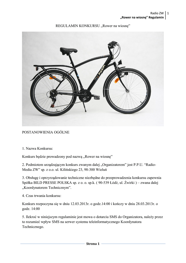 Radio ZW 1 „Rower na wiosnę” Regulamin REGULAMIN KONKURSU „Rower na wiosnę” POSTANOWIENIA OGÓLNE 1. Nazwa Konkursu: Konkurs będzie prowadzony pod nazwą „Rower na wiosnę” 2. Podmiotem urządzającym konkurs zwanym dalej „Organizatorem” jest P.P.U. “RadioMedia ZW” sp. z o.o. ul. Kilińskiego 23, 98-300 Wieluń 3. Obsługę i oprzyrządowanie techniczne niezbędne do przeprowadzenia konkursu zapewnia Spółka BILD PRESSE POLSKA sp. z o. o. sp.k. ( 90-539 Łódź, ul. Żwirki ) – zwana dalej „Koordynatorem Technicznym”. 4. Czas trwania konkursu: Konkurs rozpoczyna się w dniu 12.03.2013r. o godz.14:00 i kończy w dniu 28.03.2013r. o godz. 14:00 5. Ilekroć w niniejszym regulaminie jest mowa o dotarciu SMS do Organizatora, należy przez to rozumieć wpływ SMS na serwer systemu teleinformatycznego Koordynatora Technicznego. Strona 1 Radio ZW 2 „Rower na wiosnę” Regulamin DANE OSOBOWE 6. Uczestnicy konkursu poprzez zgłoszenie udziału w konkursie automatycznie wyrażają zgodę na wykorzystanie i przetwarzanie danych osobowych uzyskanych w związku z organizacją i przeprowadzeniem konkursu przez organizatora, a także na opublikowanie swego imienia, nazwiska, miejsca zamieszkania na liście zwycięzców. Podanie danych osobowych jest dobrowolne, jednak ich nie podanie lub cofnięcie zgody na ich wykorzystanie uniemożliwia udział lub dalszy udział w konkursie. Dane osobowe są niezbędne do przeprowadzenia konkursu i jego rozstrzygnięcia. Uczestnikom przysługuje prawo wglądu do informacji dotyczących danych osobowych, prawo do składania wniosku do organizatora o ich poprawienie oraz prawo żądania zaprzestania przetwarzania danych osobowych. UCZESTNICY KONKURSU 7. Uczestnikiem konkursu, na warunkach określonych w regulaminie, może być każda osoba fizyczna, pełnoletnia ( z zastrzeżeniem pkt.8 regulaminu ), zamieszkała na terenie Polski, która spełni warunki regulaminu. 8. Uczestnikami konkursu nie mogą być pracownicy: -Organizatora oraz członkowie ich najbliższej rodziny ( tj. małżonkowie, dzieci, wnuki, rodzeństwo, rodzice ) -firmy BILD PRESSE POLSKA Sp. z o.o. sp.k. 9. Wzięcie udziału w konkursie jest równoznaczne: -z akceptacją regulaminu konkursu, -ze zobowiązaniem się do przestrzegania zasad określonych w regulaminie, -z potwierdzeniem, że uczestnik spełnia wszystkie warunki niezbędne do wzięcia udziału w konkursie. KOMISJA KONKURSOWA 10. W celu zapewnienia prawidłowej organizacji i przebiegu konkursu, a w szczególności w celu dokonania oceny prawidłowości zgłoszeń do konkursu oraz dokonania wyboru Strona 2 Radio ZW 3 „Rower na wiosnę” Regulamin zwycięzców konkursu, Organizator powoła 2 osobową Komisję Konkursową. W skład Komisji Konkursowej wejdą osoby wytypowane przez Organizatora. PRZEBIEG KONKURSU 11. Uczestnik zgłasza chęć wzięcia udziału w konkursie poprzez wysłanie pod numer 73601 wiadomości SMS o treści RZW. Zgłoszenie nie zawierające wymaganej treści jest nieważne. Wielkość liter wpisywanych w treści SMS-a nie ma znaczenia. 12. Koszt przesłania jednej wiadomości SMS to 3,69 PLN z VAT. Wiadomość SMS może być wysłana wyłącznie z telefonu komórkowego. Wiadomości SMS wysłane za pomocą komputera nie biorą udziału w konkursie. 13. Zgłoszenia do Konkursu są przyjmowane i rejestrowane przez automatyczny system zgłoszeń, który określa czas odbioru wiadomości SMS. 14. Dane zarejestrowane przez automatyczny system zgłoszeń są rozstrzygające dla ustalenia prawa uczestnictwa w konkursie. 15. Po przyjęciu i zarejestrowaniu zgłoszenia każdy uczestnik otrzyma zwrotną wiadomość SMS z potwierdzeniem udziału w konkursie. W przypadku przysłania błędnej treści, uczestnik zostanie o tym powiadomiony w SMS-ie zwrotnym. 16. Po przyjęciu i zarejestrowaniu zgłoszenia każdy uczestnik otrzyma zwrotną wiadomość SMS z pytaniem konkursowym i informacją o sposobie udzielenia odpowiedzi. 17. Zwycięzcą Konkursu będzie osoba, która najszybciej odpowie prawidłowo na zadane w treści SMS-a pytanie. 18. Organizator zastrzega sobie prawo wysyłania do uczestnika wiadomości SMS zawierających treści promocyjne. NAGRODY 19. Nagrodą w Konkursie jest rower MAXIM o wartości 1000 zł. OGŁOSZENIE WYNIKÓW KONKURSU Strona 3 Radio ZW 4 „Rower na wiosnę” Regulamin 20. Organizator powiadomi zwycięzcę Konkursu o przyznaniu nagrody telefonicznie w dniu 28.03.2013r. Organizator poinformuje także zwycięzcę o warunkach odbioru nagrody oraz poprosi o podanie danych, tj. imienia, nazwiska, dokładnego adresu, telefonu kontaktowego oraz dokładnej daty urodzenia. ODBIÓR NAGRÓD I PODATEK 21. Nagrodę zwycięzca może odebrać w miejscu i czasie podanym przez Organizatora Konkursu. Zwycięzca konkursu jest obowiązany zapłacić podatek w wysokości 10% od wartości wygranej nagrody jeżeli jej wartość przekracza 760 zł ( art. 21 ust.1 pkt. 68 ustawy z dnia 26 lipca 1991r. o podatku dochodowym od osób fizycznych – tekst jednolity Dz. U. z 2010r. Nr 51, poz.307 z późn. zm.) nie później niż w dniu wydania nagrody. Jest to warunek konieczny do odbioru nagrody. Odpowiedzialnym za pobranie i odprowadzenie powyższego podatku do stosownego urzędu skarbowego jest Organizator. W przypadku nieodebrania nagrody w terminie, przejdzie ona na własność Organizatora lub zostanie przekazana Fundatorowi. 22. Zwycięzca nie może domagać się zamiany wygranej nagrody na inną ani wypłaty jej równowartości w pieniądzu. POSTĘPOWANIE REKLAMACYJNE 23. Reklamacje mogą być zgłaszane przez uczestników konkursu od dnia rozpoczęcia konkursu, najpóźniej w ciągu 7 dni od daty wydania nagród. Reklamacje, które wpłyną po dniu 18.04.2013 r. nie będą uwzględniane, niezależnie od daty stempla pocztowego. 24. Reklamacje rozpatruje Komisja Konkursowa. Reklamacja powinna zawierać: imię, nazwisko, dokładny adres uczestnika, przyczynę reklamacji wraz z jej uzasadni