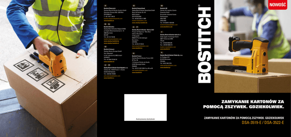 NOWOŚĆ DE AT Bostitch Österreich Stanley Black & Decker Austria GmbH Oberlaaer Strasse 248, 1230 Wien ÖSTERREICH T: +43 1 66 11 66 33 [email protected] www.bostitch.at BE Bostitch Benelux Stanley Black & Decker Belgium BVBA p/a Egide Walschaertsstraat nr. 16 2800 Mechelen BELGIË Tel: +32 15 47 38 00 [email protected] www.stanley-bostitch.be www.stanley-bostitch.nl Bostitch Schweiz Stanley Works (Europe) GmbH Sitz: Dübendorf In der Luberzen 42, 8902 Urdorf SCHWEIZ Tel: +41 (0)44 755 60 70 www.bostitch.ch SK Stanley Black & Decker Czech Republic s.r.o. Türkova 5b, 149 00 Praha 4 - Chodov ČESKÁ REPUBLIKA Tel. +420 602 745440 [email protected] www.bostitch.cz Bostitch Deutschland Stanley Black & Decker Deutschland GmbH Black-&-Decker Str. 40 65510 Idstein DEUTSCHLAND Tel: +49 (0) 6126 21-2985 [email protected] www.stanley-bostitch.de ES PT Stanley Black & Decker Ibérica SLU Parque de Negocios “Mas Blau” Edificio Muntadas C/ Berguedá 08820 El Prat de Llobregat Barcelona, ESPAÑA Tel: +34 93 217 65 02 [email protected] www.bostitch.es Bostitch UK Stanley UK Logistics Centre Gowerton Road Brackmills Industrial Estate Northampton NN4 7BW ENGLAND Tel: +44 (0)870 1 630 630 [email protected] www.bostitch.co.uk IT Stanley Black & Decker Italia S.r.l. Sede Legale: Via Energy Park 6 20871 Vimercate (MB) ITALIA Tel: +39 039 9590.205 Fax: +39 039 9590.312 [email protected] www.bostitch.it FR Bostitch France Stanley Black & Decker France SAS BP No. 90, 112 Avenue Charles de Gaulle 91423 Morangis Cedex FRANCE Tel: +33 0 (1) 69 10 80 41 ou 40 ou 08 [email protected] www.bostitch.fr Stanley Black & Decker Polska Sp. z o.o. Ul. Postępu 21D 02-676 Warszawa POLSKA Tel: +48 22 464 2735 [email protected] www.bostitch.pl ZAMYKANIE KARTONÓW ZA POMOCĄ ZSZYWEK. GDZIEKOLWIEK. Autoryzowany dystrybutor ZAMYKANIE KARTONÓW ZA POMOCĄ ZSZYWEK. GDZIEKOLWIEK DSA-3519-E / DSA-3522-E NASTĘPNA GENERACJA ZAMYKAREK DO KARTONÓW. Nowy akumulatorowy zszywacz do kartonów firmy Bostitch po raz pierwszy daje użytkownikom prawdziwą mobilność i posiada szereg cech zapewniających świetne osiągi w dowolnym miejscu. BEZPRZEWODOWA ZAMYKARKA DO KARTONÓW SERIA DSA ELASTYCZNE ŁĄCZENIE Dwa modele zszywacza oferują możliwość wbijania zszywek o długości od 15 mm do 22 mm, odpowiednich zarówno do kartonów jedno- jak i dwuwarstwowych. Jesteśmy jednym z największych producentów zszywek na świecie. Dzięki temu masz pewność, że nasze zszywki są najwyższej jakości. Dodatkowy mechanizm zabezpieczający w celu zapewnienia bezpieczeństwa przy pracy Pozycja drugiej ręki to zwiększony komfort i kontrola ZAMYKANIE KARTONÓW ZA POMOCĄ ZSZYWEK. GDZIEKOLWIEK. Li-Ion 2 akumulatory litowo-jonowe są w pełni naładowane już po 45 minutach, a jedno ładowanie akumulatora umożliwia wbicie nawet 800 zszywek. l W pełni przenośny zszywacz do kartonów Regulowany rodzaj zacisku do różnych rodzajów kartonów l Czas ładowania tylko 45 minut l Nawet 800 zszywek po jednym ładowaniu PRACUJ BEZ PRZESTOJÓW W zestawie znajdują się 2 akumulatory litowo-jonowe, a jedno ładowanie akumulatora umożliwia wbicie nawet 800 zszywek. Dzięki temu zarówno na linii produkcyjnej, jak i w terenie możesz pracować bez przestojów przez cały dzień. PRODUKCJA l Zakłady produkcyjne System szybkiego otwierania magazynka w celu łatwego wkładania i usuwania zablokowanych zszywek l Nie ma potrzeby użycia kompresora i przewodów powietrznych l Linie produkcyjne l Drukarnie Szybka zmiana długości zszywek przy pracy z różnymi rodzajami kartonów l Obsługa niewymagająca wysiłku, porównywalna z narzędziami ręcznymi l 2 modele do wbijania zszywek o długości od 15 mm do 22 mm l Regulowana głębokość wbicia zszywki i rodzaj zacisku Wierzymy, że dostarczamy najlepsze narzędzia i łączniki w branży. Kupując produkty firmy Bostitch, możesz polegać na niezrównanej wiedzy, doświadczeniu i pomocy z naszej strony. Nowe, bezprzewodowe zszywacze do kartonów to tylko niektóre produkty z naszej oferty narzędzi do zamykania kartonów i opakowań. Aby dowiedzieć się więcej, skontaktuj się z lokalnym zespołem ds. sprzedaży lub wejdź na stronę internetową: www.bostitch.pl. Gładka podstawa zapewniająca szybsze zszywanie DANE TECHNICZNE Model Waga (bez akumulatora) GAMA ZSZYWEK DSA-3519-E / DSA-3522-E 2.81kg NARZĘDZIA STANLEY BOSTITCH – NASZ SPOSÓB TWORZENIA Waga akumulatora 220g Model akumulatora 9R201498 l Testowane w ekstremalnych temperaturach l Każde narzędzie jest sprawdzane przed zapakowaniem i wysyłką Wibracje w ah/Niepewność pomiaru w K BEZKOMPROMISOWA JAKOŚĆ, TRWAŁOŚĆ I NIEZAWODNOŚĆ. Pojemność magazynka 108 <2.5 m/s2 / 1.25 m/s2 Liczba w pudełku DSA-3519-E DSA-3522-E 1331500Z 15 35 2000 4 - 45 mins 1331800Z 18 35 2000 4 4 10.8V 1332200Z 22 35 2000 - 4 88.6 dB / 3 dB Napięcie ładowania www.bostitch.pl. Szerokość grzbietu mm Poziom hałasu LWA / KWA 9R201515 l Magazynowanie l Składowanie l Firmy kurierskie i spedycyjne l Firmy sprzedaży wysyłkowej Aby uzyskać więcej informacji, wejdź na stronę: Długość mm 77.4 dB / 3 dB Czas ładowania w temp. 20ºc Obydwa modele wykorzystują zszywki typu ‘A’. Model DSA-3519-E jest odpowiedni do wbijania zszywek o długości 15 i 18 mm, a model DSA-3522-E do wbijania zszywek o długości 18 i 22 mm, dzięki czemu stanowi najlepszy wybór do pracy z kartonami dwuwarstwowymi. SKU Poziom hałasu LPA / KPA Model ładowarki DYSTRYBUCJA Łatwa do nastawienia głębokość zszywania do różnych rodzajów tektury PRACA Z DALA OD ZAKŁADU l Firmy przeprowadzkowe l Firmy domowe l Placówki sprzedaży detalicznej www.bostitch.pl