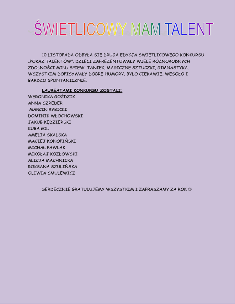 10 LISTOPADA ODBYŁA SIĘ DRUGA EDYCJA SWIETLICOWEGO KONKURSU „POKAZ TALENTÓW”. DZIECI ZAPREZENTOWAŁY WIELE RÓśNORODNYCH ZDOLNOŚCI MIN.: SPIEW, TANIEC, MAGICZNE SZTUCZKI, GIMNASTYKA. WSZYSTKIM DOPISYWAŁY DOBRE HUMORY, BYŁO CIEKAWIE, WESOŁO I BARDZO SPONTANICZNIE. LAUREATAMI KONKURSU ZOSTALI: WERONIKA GOŹDZIK ANNA SZREDER MARCIN RYBICKI DOMINIK WŁOCHOWSKI JAKUB KĘDZIERSKI KUBA GIL AMELIA SKALSKA MACIEJ KONOPIŃSKI MICHAŁ PAWLAK MIKOŁAJ KOZŁOWSKI ALICJA MACHNICKA ROKSANA SZULIŃSKA OLIWIA SMULEWICZ SERDECZNIE GRATULUJEMY WSZYSTKIM I ZAPRASZAMY ZA ROK ☺