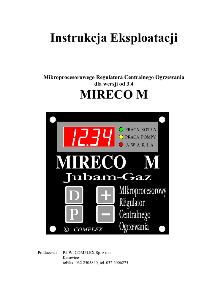 Instrukcja Eksploatacji Mikroprocesorowego Regulatora Centralnego Ogrzewania dla wersji od 3.4 MIRECO M Producent : P.I.W. COMPLEX Sp. z o.o. Katowice tel\fax. 032 2505840, tel. 032 2006275 -strona 2- Spis treści : Wstęp ........................................................................................ 3 1. Zasada działania ................................................................. 4 1.1. Programy grzania ............................................................ 5 1.2. Przypisanie programów do poszczególnych dni ........... 7 1.3. Obsługa korektora ręcznego ........................................... 8 2. Obsługa regulatora ............................................................ 9 2.1. Kontrola pracy regulatora ............................................. 10 2.2. Ustawianie trybu pracy regulatora ................................ 12 2.3. Ustawianie zegara ............................................................ 13 2.4. Załączanie programów grzania ...................................... 15 2.5. Ustalanie danych dla programów grzania ..................... 17 2.6. Programowanie okresów urlopowych ........................... 19 2.7. Programowanie dni specjalnych .................................... 21 3. Postępowanie w przypadku awarii .................................... 22 3.1. Usuwanie przyczyn najczęściej spotykanych awarii .... 24 4. Rozruch instalacji ................................................................ 26 Instrukcja eksploatacji regulatora MIRECO M, 1997 r. -strona 3- Wstęp. Niniejsza instrukcja przeznaczona jest dla użytkowników Mikroprocesorowego Regulatora Centralnego Ogrzewania MIRECO M. W kolejnych rozdziałach opisane są podstawowe funkcje regulatora, obsługa i sposoby kontroli pracy urządzenia, programowanie poszczególnych funkcji oraz postępowanie w przypadku wykrycia awarii i rozruchu instalacji. Niektóre z funkcji regulatora dostępne są wyłącznie dla specjalistycznego serwisu ich wykorzystanie przez osoby niepowołane lub nie posiadające odpowiedniego przygotowania fachowego mogłoby doprowadzić do awarii lub niewłaściwej pracy instalacji grzewczej. Funkcje te nie będą opisane w niniejszej instrukcji. Również instalowanie i uruchamianie regulatora nie będzie przedmiotem niniejszego opracowania, gdyż czynności te winien wykonać wyspecjalizowany serwis. UWAGA ! Regulator pracuje poprawnie w odpowiednim zakresie napięcia zasilającego 220V +10 -15 %. Przekroczenie tego zakresu nie gwarantuje poprawnej pracy urządzenia oraz grozi jego uszkodzeniem. Regulator wyposażony jest w rejestrację ilości załączeń oraz przeprogramowań. Dane te wykorzystywane mogą być przez serwis celem ustalenia ew. przyczyn reklamacji. W uzasadnionych sytuacjach dane te mogą być także powodem nieuznania reklamacji. Zalecamy stanowczo dokładne przestudiowanie niniejszej instrukcji przed przystąpieniem do programowania regulatora. Pozwoli to na optymalne wykorzystanie jego możliwości, uzyskanie maksymalnych oszczędności, a także bezawaryjną pracę urządzenia. Instrukcja eksploatacji regulatora MIRECO M, 1997 r. -strona 4- 1. Zasada działania. Regulator MIRECO M zbudowany jest w oparciu o nowoczesny mikrokontroler z rodziny Intel MCS 51. Czuwa on nad pomiarem temperatury, odczytem danych zapisanych w pamięci programów grzania, właściwym sterowaniem kotła i pompy, a także obsługuje wyświetlanie informacji i wprowadzanie danych. Z kolei odmierzanie czasu nadzoruje zegar z kalendarzem, posiadający rezerwowe zasilanie bateryjne (okres trwałości baterii wynosi typowo 3 lata). Sterowanie ogrzewaniem odbywa się przy wykorzystaniu tzw. programów grzania określają one wymaganą temperaturę w pomieszczeniach. Programów tych jest 10 (w tym jeden wstępnie zdefiniowany zabezpieczający instalację przed zamarznięciem / dla wersji od 3.5), a każdy przygotowany może być na inną okoliczność. Dokładny opis funkcjonowania programów znajduje się w następnym rozdziale. Kolejny rozdział opisuje sposób, w jaki regulator określa numer programu wymagany na dany dzień. Następnie przedstawimy definiowanie danych poszczególnych programów grzania oraz funkcje specjalne regulatora, czyli urlopy i dni specjalne. Regulator posiada dość rozbudowany system zabezpieczeń. Oprócz zabezpieczeń zrealizowanych na bazie mikroprocesora dodatkowy układ kontroluje wszelkie nienormalne stany w układzie grzewczym. Jeżeli zatem z jakichkolwiek powodów doszłoby do awarii sterowania mikroprocesorowego, układ dodatkowy przejmuje pełną kontrolę nad stanami awaryjnymi i w razie wystąpienia nieprawidłowości blokuje pracę całego regulatora, aż do czasu usunięcia przez serwis przyczyny powstania awarii. Jeśli jednak w czasie pracy wystąpią drobne nieprawidłowości, to regulator sygnalizuje błąd (błąd sygnalizowany jest również przez zewnętrzny sygnalizator awarii), ale po określonym dla danej awarii czasie samoczynnie próbuje błąd ten usunąć. Gdy się to nie powiedzie lub ilość awarii jest zbyt duża, praca regulatora, a tym samym kotła, zostaje zatrzymana. Taki sposób obsługi błędów pozwala na uzyskanie maksymalnej niezawodności systemu grzewczego, także podczas nieobecności osób kompetentnych zdolnych do ręcznego usunięcia awarii. Instrukcja eksploatacji regulatora MIRECO M, 1997 r. -strona 5- 1.1. Programy grzania. Mówiąc o pracy instalacji grzewczej używamy pojęcia "program grzania". Program taki określa, jaka jest wymagana temperatura w pomieszczeniach w poszczególnych porach dnia. Dla przykładu spróbujmy zastanowić się, jaka winna być temperatura w pomieszczeniach typowego domku jednorodzinnego, którego mieszkańcy pracują w godzinach od 730 do 1530, a dzieci uczęszczają do szkoły. I tak od północy do pobudki domowników temperatura może być dość znacznie obniżona w stosunku do typowej dla pomieszczeń mieszkalnych. Dla typowych konstrukcji możn