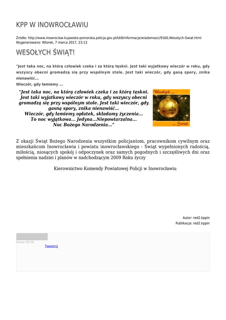 KPP W INOWROCŁAWIU Źródło: http://www.inowroclaw.kujawsko-pomorska.policja.gov.pl/kb9/informacje/wiadomosci/9160,Wesolych-Swiat.html Wygenerowano: Wtorek, 7 marca 2017, 23:13 WESOŁYCH ŚWIĄT! "Jest taka noc, na którą człowiek czeka i za którą tęskni. Jest taki wyjatkowy wieczór w roku, gdy wszyscy obecni gromadzą się przy wspólnym stole. Jest taki wieczór, gdy gasą spory, znika nienawiść... Wieczór, gdy łamiemy ... "Jest taka noc, na którą człowiek czeka i za którą tęskni. Jest taki wyjatkowy wieczór w roku, gdy wszyscy obecni gromadzą się przy wspólnym stole. Jest taki wieczór, gdy gasną spory, znika nienawiść... Wieczór, gdy łamiemy opłatek, składamy życzenia... To noc wyjątkowa... Jedyna...Niepowtarzalna... Noc Bożego Narodzenia..." Z okazji Świąt Bożego Narodzenia wszystkim policjantom, pracownikom cywilnym oraz mieszkańcom Inowrocławia i powiatu inowrocławskiego - Świąt wypełnionych radością, miłością, niosących spokój i odpoczynek oraz samych pogodnych i szczęśliwych dni oraz spełnienia nadziei i planów w nadchodzącym 2009 Roku życzy Kierownictwo Komendy Powiatowej Policji w Inowrocławiu Autor: red2.kppin Publikacja: red2.kppin Ocena: 0/5 (0) Tweetnij