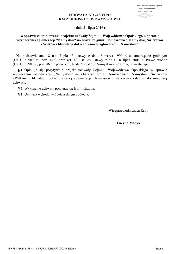 Elektronicznie podpisany przez: Lucyna Joanna Medyk dnia 21 lipca 2016 r. UCHWAŁA NR 248/VII/16 RADY MIEJSKIEJ W NAMYSŁOWIE z dnia 21 lipca 2016 r. w sprawie zaopiniowania projektu uchwały Sejmiku Województwa Opolskiego w sprawie wyznaczenia aglomeracji "Namysłów" na obszarze gmin: Domaszowice, Namysłów, Świerczów i Wilków i likwidacji dotychczasowej aglomeracji "Namysłów" Na podstawie art. 18 ust. 2 pkt 15 ustawy z dnia 8 marca 1990 r. o samorządzie gminnym (Dz. U. z 2016 r., poz. 446) oraz art. 43 ust. 2b ustawy z dnia 18 lipca 2001 r. Prawo wodne (Dz. U. z 2015 r., poz. 469, z późn. zm.) Rada Miejska w Namysłowie uchwala, co następuje: § 1. Opiniuje się pozytywnie projekt uchwały Sejmiku Województwa Opolskiego w sprawie wyznaczenia aglomeracji „Namysłów” na obszarze gmin: Domaszowice, Namysłów, Świerczów i Wilków i likwidacji dotychczasowej aglomeracji „Namysłów”, stanowiący załącznik do niniejszej uchwały. § 2. Wykonanie uchwały powierza się Burmistrzowi. § 3. Uchwała wchodzi w życie z dniem podjęcia. Wiceprzewodnicząca Rady Lucyna Medyk Id: 6FD171CB-1153-4A18-B526-7142B9AF97CC. Podpisany Strona 1 Załącznik do Uchwały Nr 248/VII/16 Rady Miejskiej w Namysłowie z dnia 21 lipca 2016 r. UCHWAŁA NR /2016 Sejmiku Województwa Opolskiego z dnia 2016 r. w sprawie wyznaczenia aglomeracji „Namysłów” na obszarze gmin: Domaszowice, Namysłów, Świerczów i Wilków i likwidacji dotychczasowej aglomeracji „Namysłów” Na podstawie art. 18 pkt 1 i 20 ustawy z dnia 5 czerwca (t.j. Dz. U. z 2016 r. poz. 486), art. 43 ust. 2a i 2b ustawy z (t.j. Dz. U. z 2015 r. poz. 469 z późn. zm.) oraz art. 22 ust. 2 o zmianie ustawy – Prawo wodne oraz niektórych innych ustaw Sejmik Województwa Opolskiego uchwala, co następuje: 1998 r. o samorządzie województwa dnia 18 lipca 2001 r. Prawo wodne i 3 ustawy z dnia 5 stycznia 2011 r. (Dz. U. Nr 32, poz. 159 z późn. zm.) §1 1.Wyznacza się aglomerację „Namysłów” położoną na obszarze gmin: Domaszowice, Namysłów, Świerczów, Wilków. 2. W skład aglomeracji „Namysłów” wchodzą następujące miejscowości: 1) W gminie Domaszowice: Strzelce, Gręboszów; 2) W gminie Namysłów: Jastrzębie, Ziemiełowice, Łączany, Rychnów, Kamienna, Józefków, Michalice, Objazda, Kowalowice, Smogorzów, Nowe Smarchowice, Smarchowice Wielkie, Ligotka, Smarchowice Małe, Namysłów; 3) W gminie Świerczów: Świerczów, Biestrzykowice; 4) W gminie Wilków: Idzikowice, Jakubowice, Wilków, Krzyków. 3. Równoważna liczba mieszkańców (RLM) aglomeracji „Namysłów” wynosi 37 285. 4. Ścieki komunalne z obszaru aglomeracji „Namysłów” oczyszczane są na oczyszczalni zlokalizowanej w miejscowości Namysłów. §2 Granice i obszar aglomeracji „Namysłów” określone są na mapie w skali 1:10 000, stanowiącej załącznik do niniejszej uchwały. §3 Likwiduje się aglomerację „Namysłów” wyznaczoną rozporządzeniem Nr 0151/P/40/08 Wojewody Opolskiego z dnia 24 października 2008 r. w sprawie wyznaczenia aglomeracji „Namysłów” na obszarach gmin Namysłów, Domaszowice, Świerczów, Wilków (Dziennik Urzędowy Wojewody Opolskiego z 2008 r. Nr 82, poz. 2009). §4 Wykonanie uchwały powierza się Zarządowi Województwa Opolskiego. §5 Uchwała podlega ogłoszeniu w Dzienniku Urzędowym Województwa Opolskiego i wchodzi w życie po upływie 14 dni od dnia ogłoszenia. Id: 6FD171CB-1153-4A18-B526-7142B9AF97CC. Podpisany Strona 2 UZASADNIENIE Zgodnie ze zmienionym brzmieniem art. 43 ust. 2a i 2b ustawy z dnia 18 lipca 2001 r. Prawo wodne (t.j. Dz.U. z 2015 r. poz. 469 z póź. zm.) przez art. 146 pkt. 3 lit a ustawy z dnia 3 października 2008 r. o udostępnieniu informacji o środowisku i jego ochronie, udziale społeczeństwa w ochronie środowiska oraz o ocenach oddziaływania na środowisko, (w brzmieniu sprzed dnia 24 października 2013 r.), organem uprawnionym do wyznaczenia aglomeracji w drodze uchwały jest sejmik województwa. W celu spełnienia obowiązku, nałożonego przez art. 18 pkt. 1 i 20 ustawy z dnia 5 czerwca 1998 r. o samorządzie województwa (t.j. Dz. U. z 2016 r. poz. 486) oraz art. 43 ust. 2a i 2b ustawy z dnia 18 lipca 2001 r. Prawo wodne (Dz.U. z 2015 r. poz. 469z późn. zm) Sejmik Województwa, zgodnie z rozporządzeniem Ministra Środowiska z dnia 22 lipca 2014 r. w sprawie sposobu wyznaczania obszaru i granic aglomeracji (Dz.U. z 2014 r., poz. 995) wyznacza aglomerację o równoważnej liczbie mieszkańców powyżej 2000 w drodze uchwały, po przekazaniu do uzgodnienia projektu tejże uchwały z właściwym dyrektorem regionalnego zarządu gospodarki wodnej i właściwym regionalnym dyrektorem ochrony środowiska oraz po zasięgnięciu opinii zainteresowanych gmin. Burmistrz Namysłowa pismem z dnia 19.05.2016 r. znak GK.6324.11.2015 zwrócił się do Marszałka Województwa Opolskiego o likwidację aglomeracji „Namysłów”, wyznaczonej rozporządzeniem Nr 0151/P/40/08 Wojewody Opolskiego z dnia 24 października 2008 r. w sprawie wyznaczenia aglomeracji „Namysłów” na obszarach gmin Namysłów, Domaszowice, Świerczów, Wilków i uchwalenia przez Sejmik Województwa nowych granic i obszaru aglomeracji Namysłów. Niniejsza zmiana podyktowana jest poważnym zagrożeniem niedotrzymania wymaganych wskaźników, wynikających między innymi ze stale zmniejszającej się liczby mieszkańców w gminach. W związku z czym wyłącza się z aglomeracji wisie: Pągów, Domaszowice, Miodary, Nowy Folwark, Smarchowice Śląskie, Barzyna oraz Ligota Książęca. Inwestycje kanalizacyjne na wyłączanym obszarze stały się nieuzasadnione technicznie i ekonomicznie. Obecnie tworzona aglomeracja „Namysłów” jest w całości położona na terenie gmin: Domaszowice, Namysłów, Świerczów i Wilków. W skład aglomeracji wchodzą: w gminie Domaszowice: Strzelce, Gręboszów, w gminie Namysłów: Jastrzębie, Ziemiełowice, Łączany, Rychnów, Kamie
