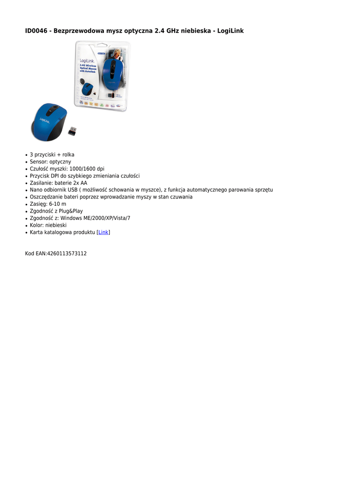 ID0046 - Bezprzewodowa mysz optyczna 2.4 GHz niebieska - LogiLink ● ● ● ● ● ● ● ● ● ● ● ● 3 przyciski + rolka Sensor: optyczny Czułość myszki: 1000/1600 dpi Przycisk DPI do szybkiego zmieniania czułości Zasilanie: baterie 2x AA Nano odbiornik USB ( możliwość schowania w myszce), z funkcja automatycznego parowania sprzętu Oszczędzanie bateri poprzez wprowadzanie myszy w stan czuwania Zasięg: 6-10 m Zgodność z Plug&Play Zgodność z: Windows ME/2000/XP/Vista/7 Kolor: niebieski Karta katalogowa produktu [Link] Kod EAN:4260113573112